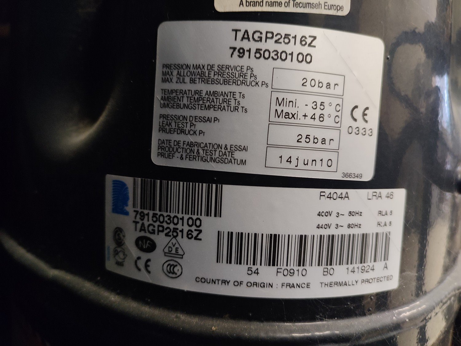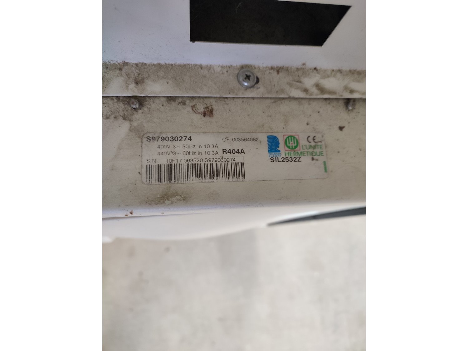 Silensys condenser with tecumseh cooling compressor, type: S979030274, 400-440 V, 3 Ph, 50-60 Hz, 10.3 A, refrigerant: R404A, dimensions: 1650 mm x 660 mm x 1440 mm.