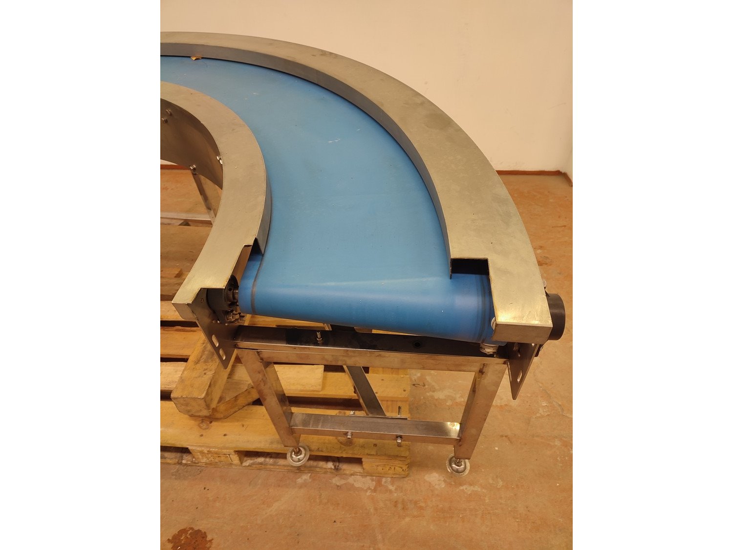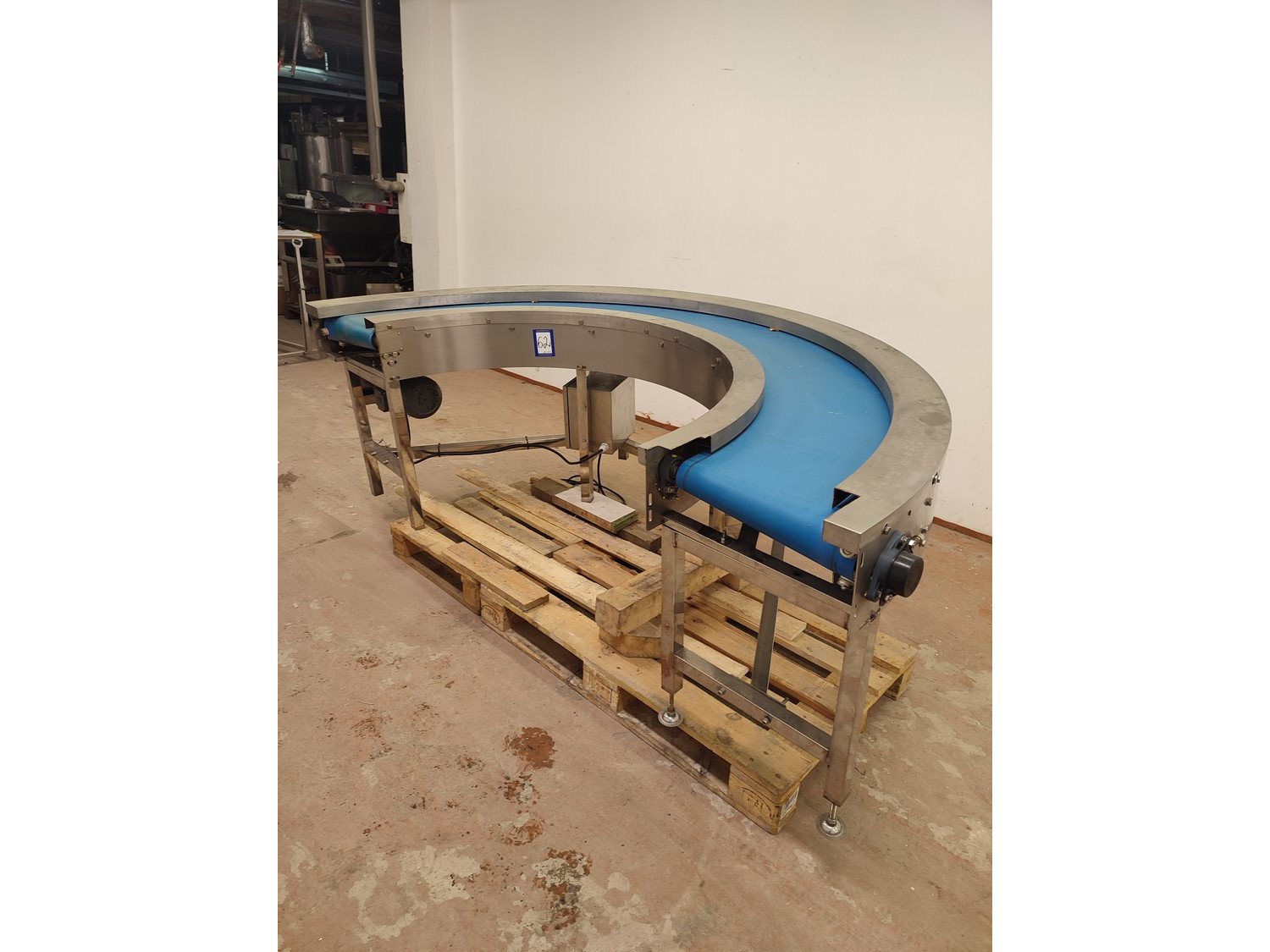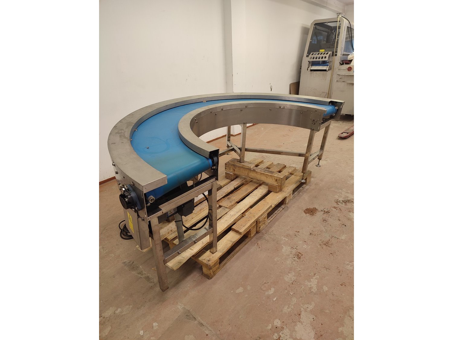 Shanghai Papa Industrial Co, LTD 180° curve conveyor, model: P180, 220/380 V, 50/60 Hz, 0.75 kW, weight: 200 kg, plastic belt, belt width: 300 mm, total dimensions: 1500 mm x 2500 mm x 900 mm.