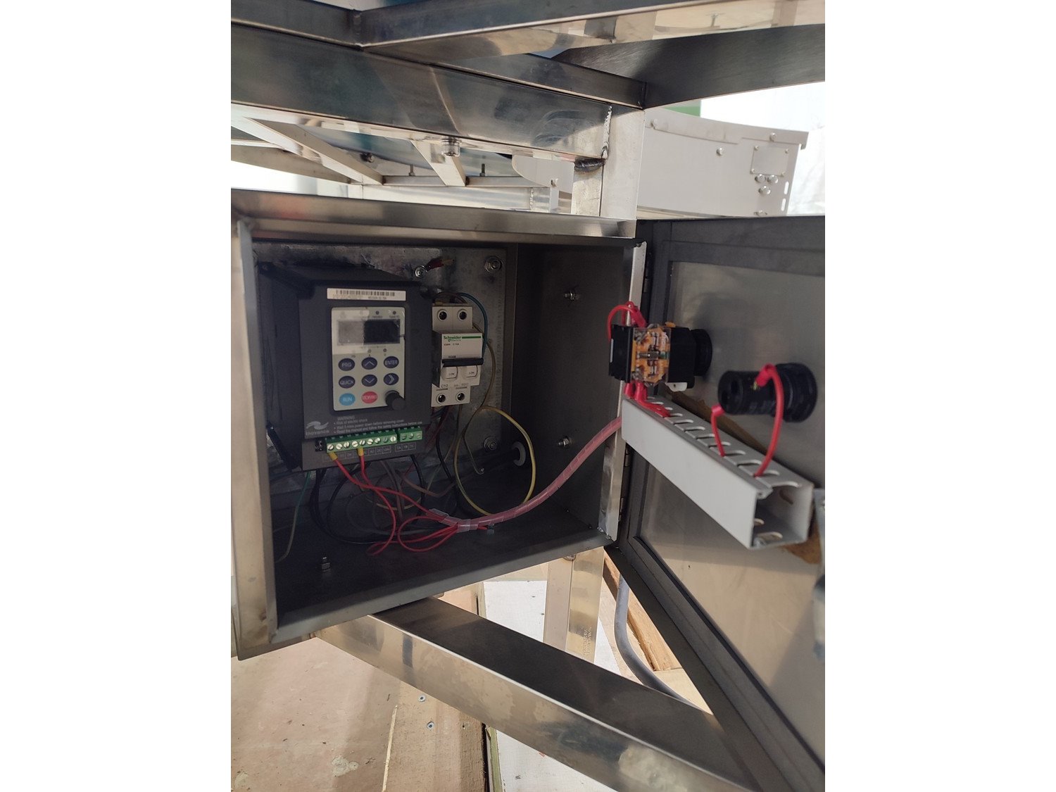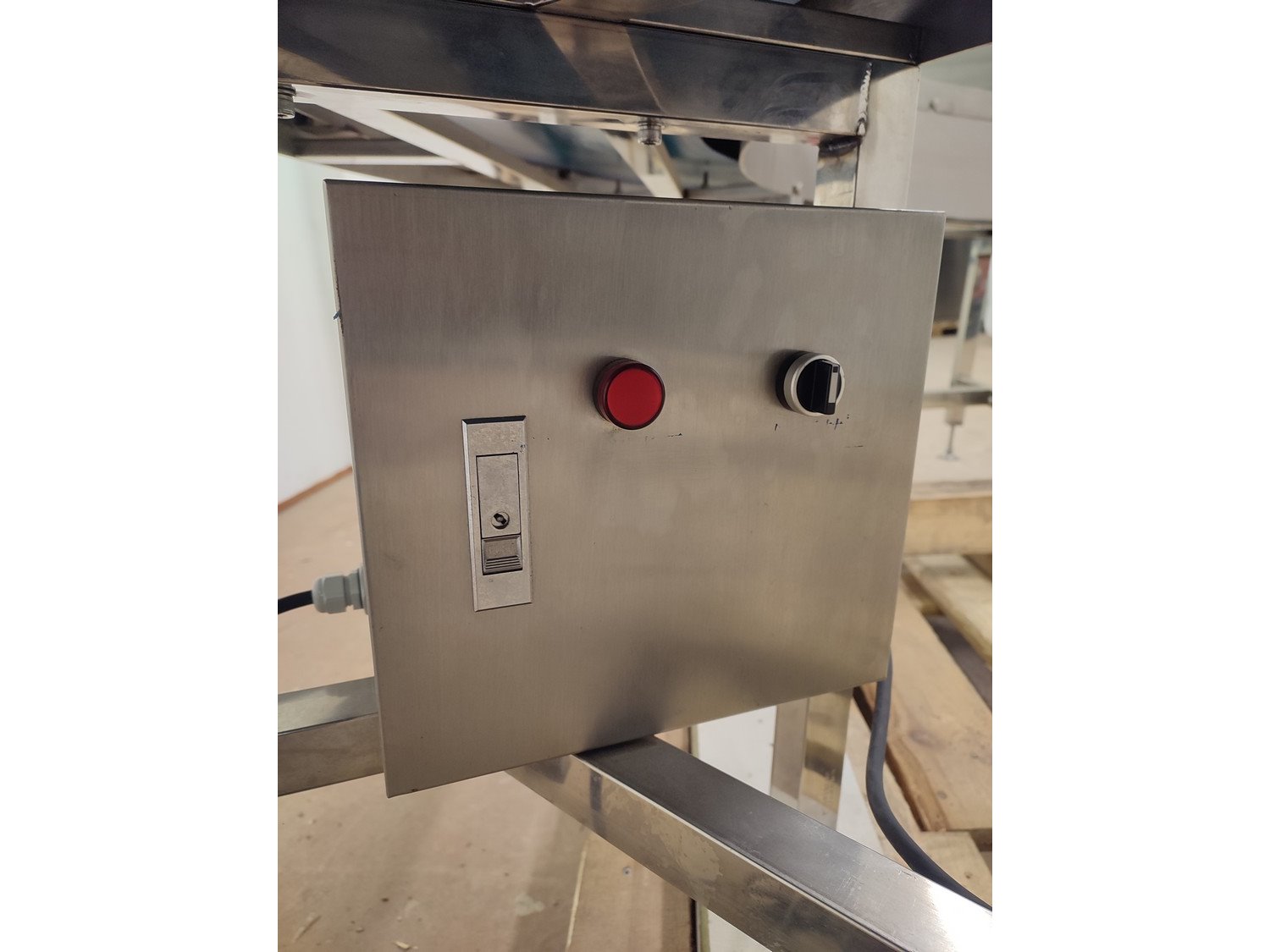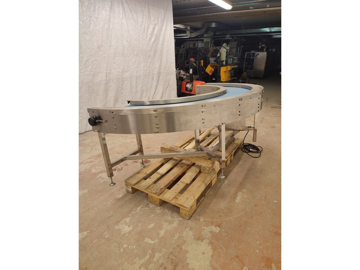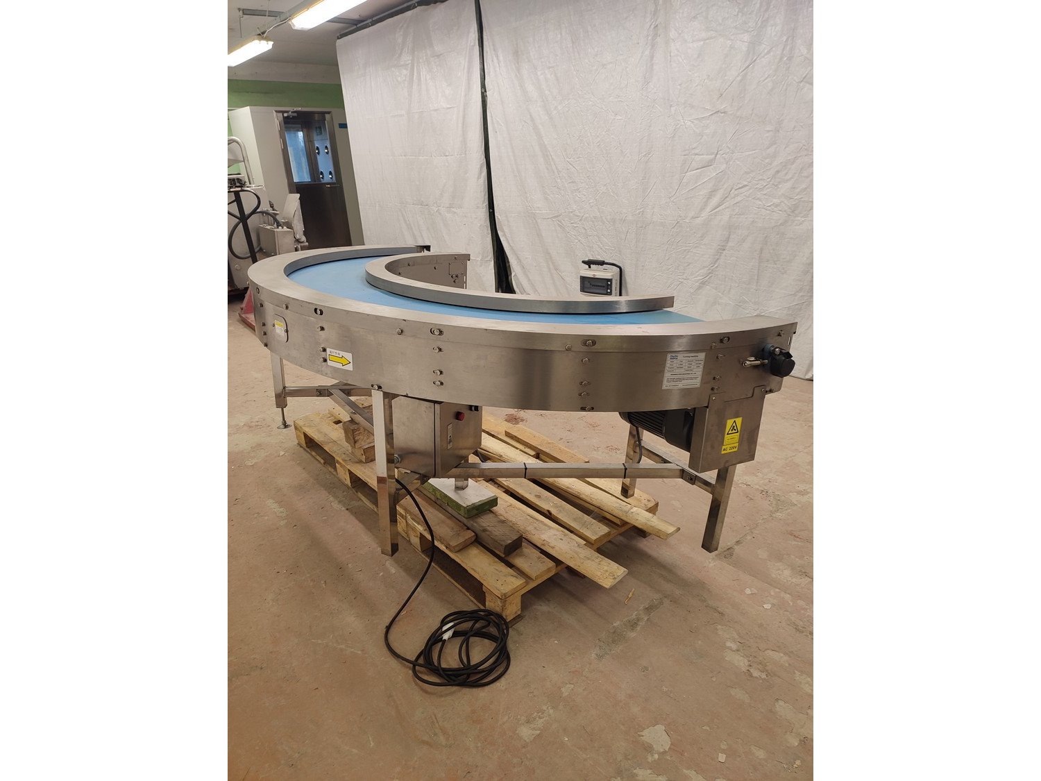 Shanghai Papa Industrial Co, LTD 180° curve conveyor, model: P180, 220/380 V, 50/60 Hz, 0.75 kW, weight: 200 kg, plastic belt, belt width: 300 mm, total dimensions: 1500 mm x 2500 mm x 900 mm.