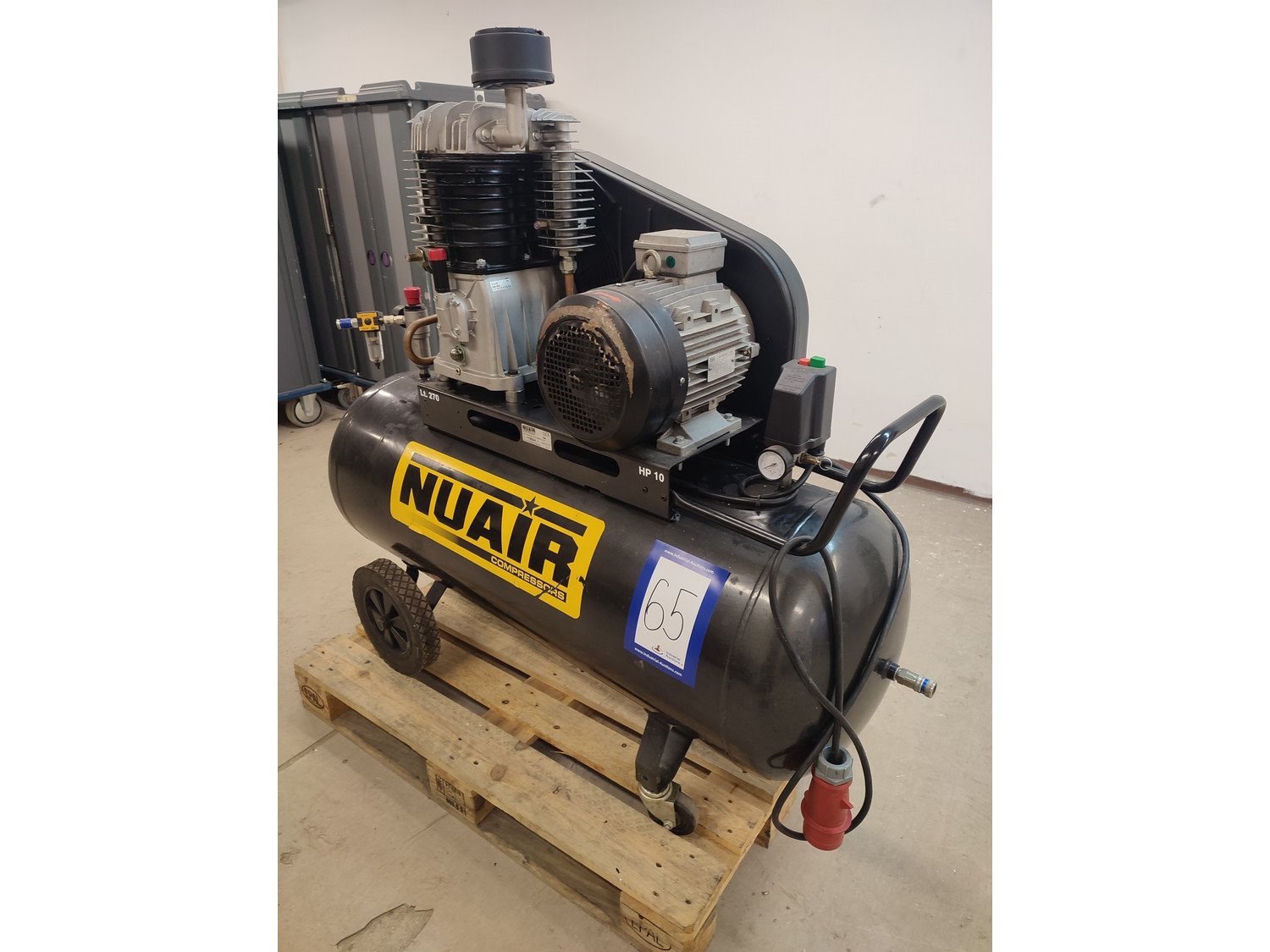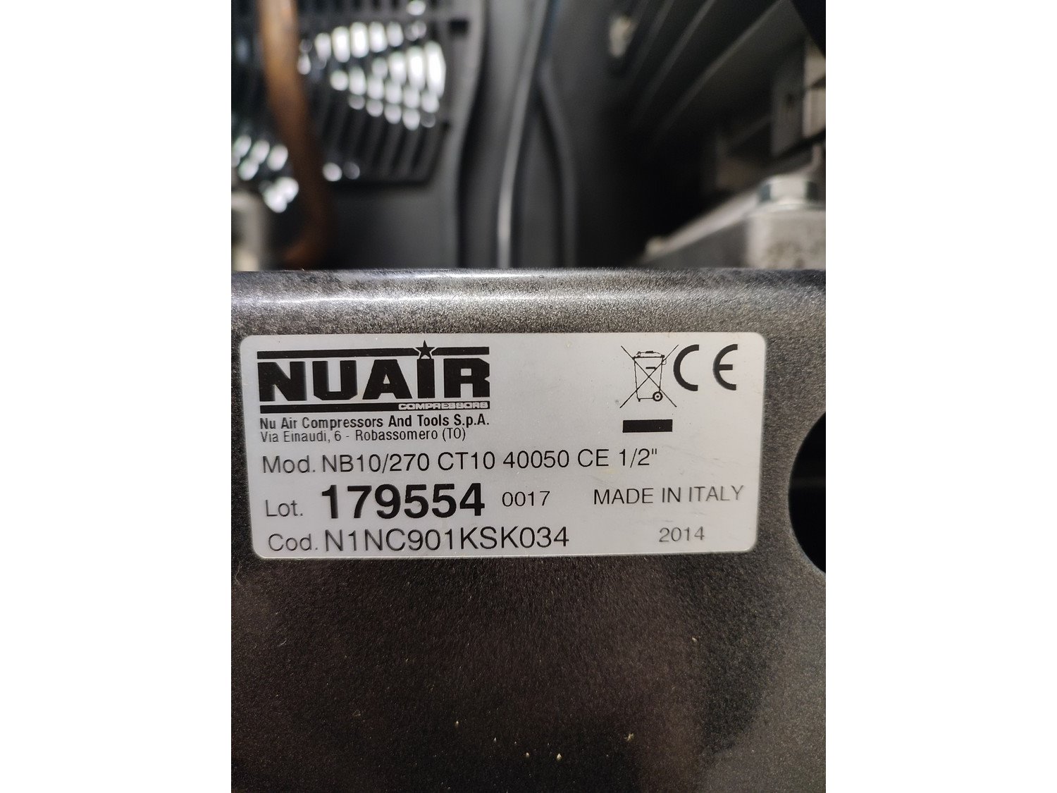 Nu Air Compressors And Tools S.p.A. mobile air compressor with receiver, model: NB10/270 CT10 40050 CE 1/2", year of construction: 2014, dimensions: 1500 mm x 580 mm x 1400 mm.