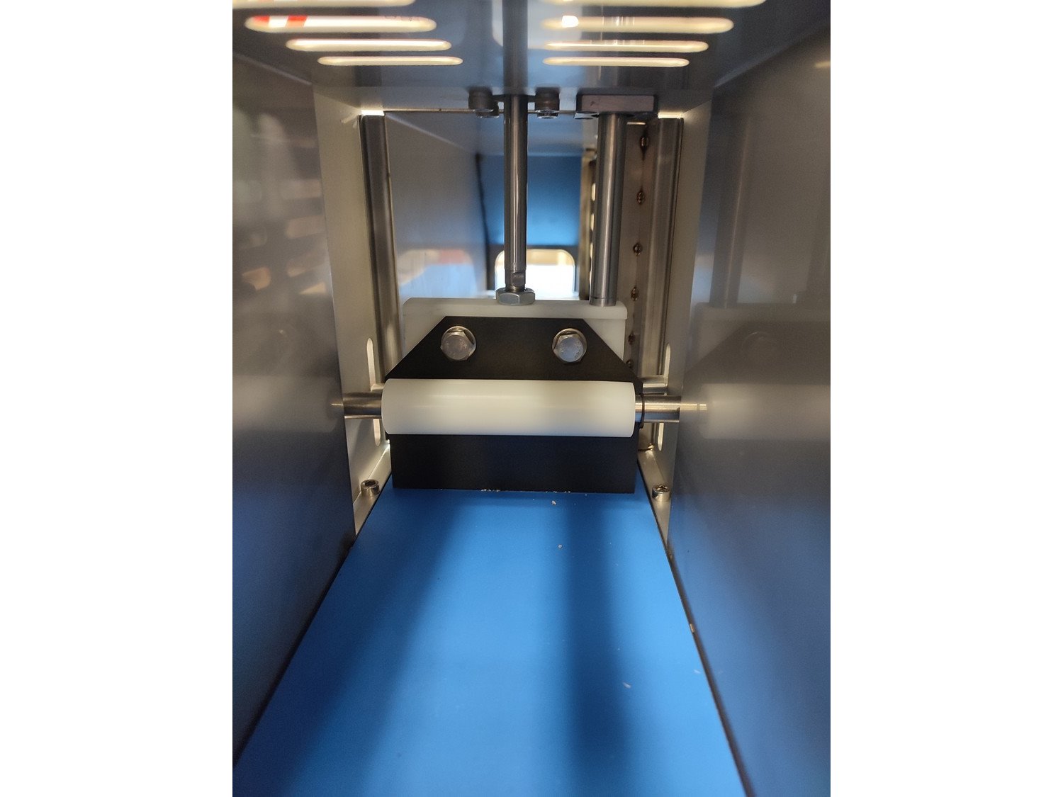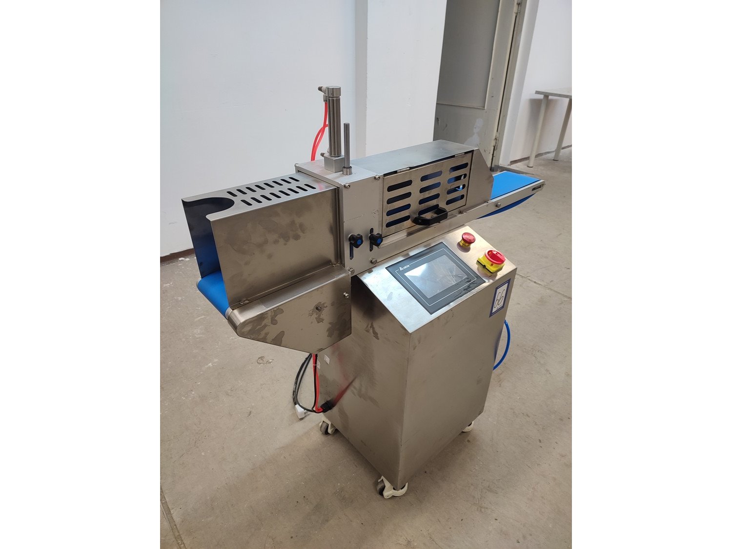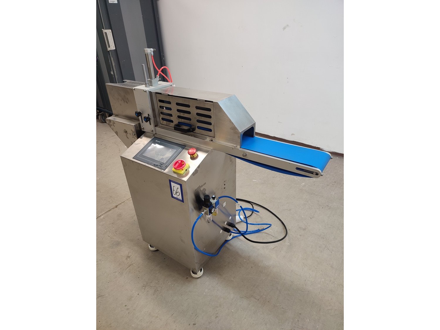 Mobile portioning machine, working width: 130 mm, plastic belt, belt width: 130 mm, total dimensions: 1200 mm x 405 mm x 1130 mm. Screen is broken.