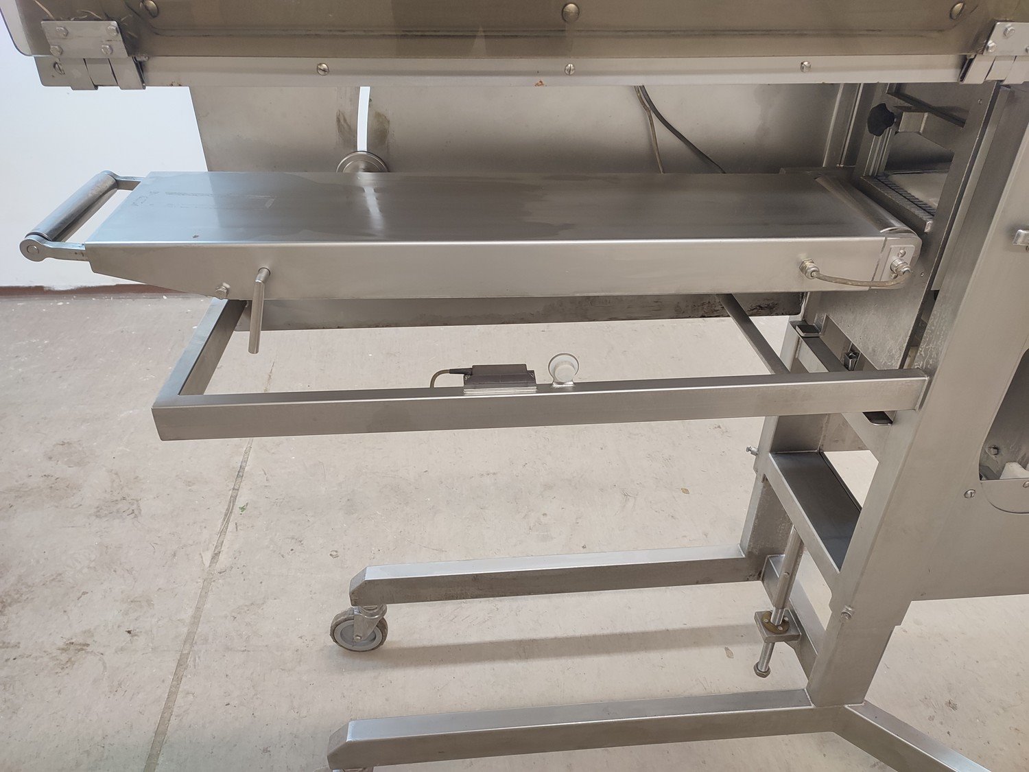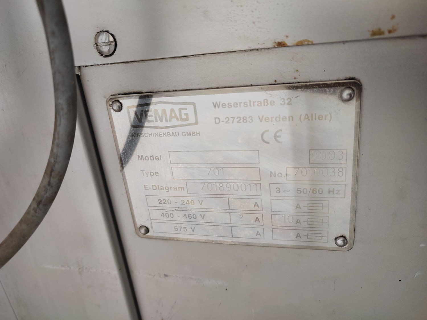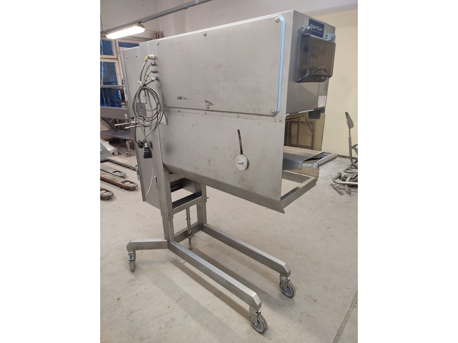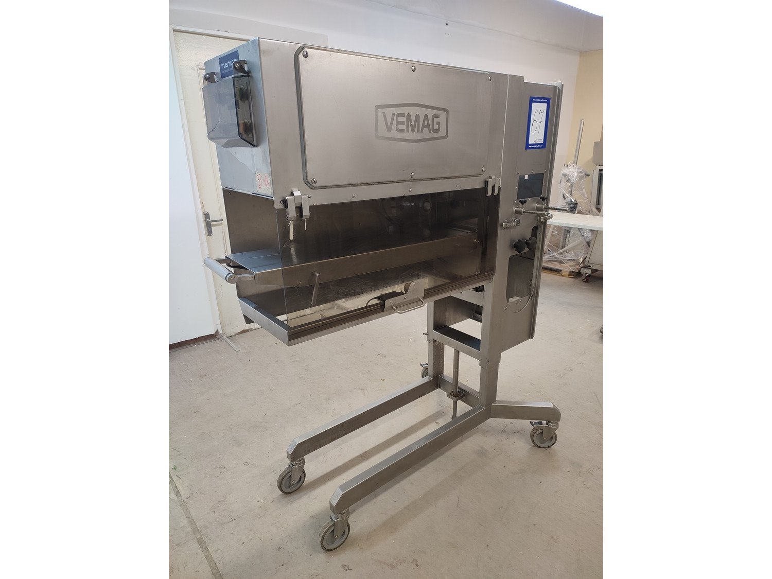 Vemag mobile portioning machine, type: 701, number: 7010038, year of construction: 2003, 400-460 V, 3 Ph, 50/60 Hz, 2 A, plastic belt, belt width: 190 mm, total dimensions: 1500 mm x 860 mm x 1660 mm. Missing belt.