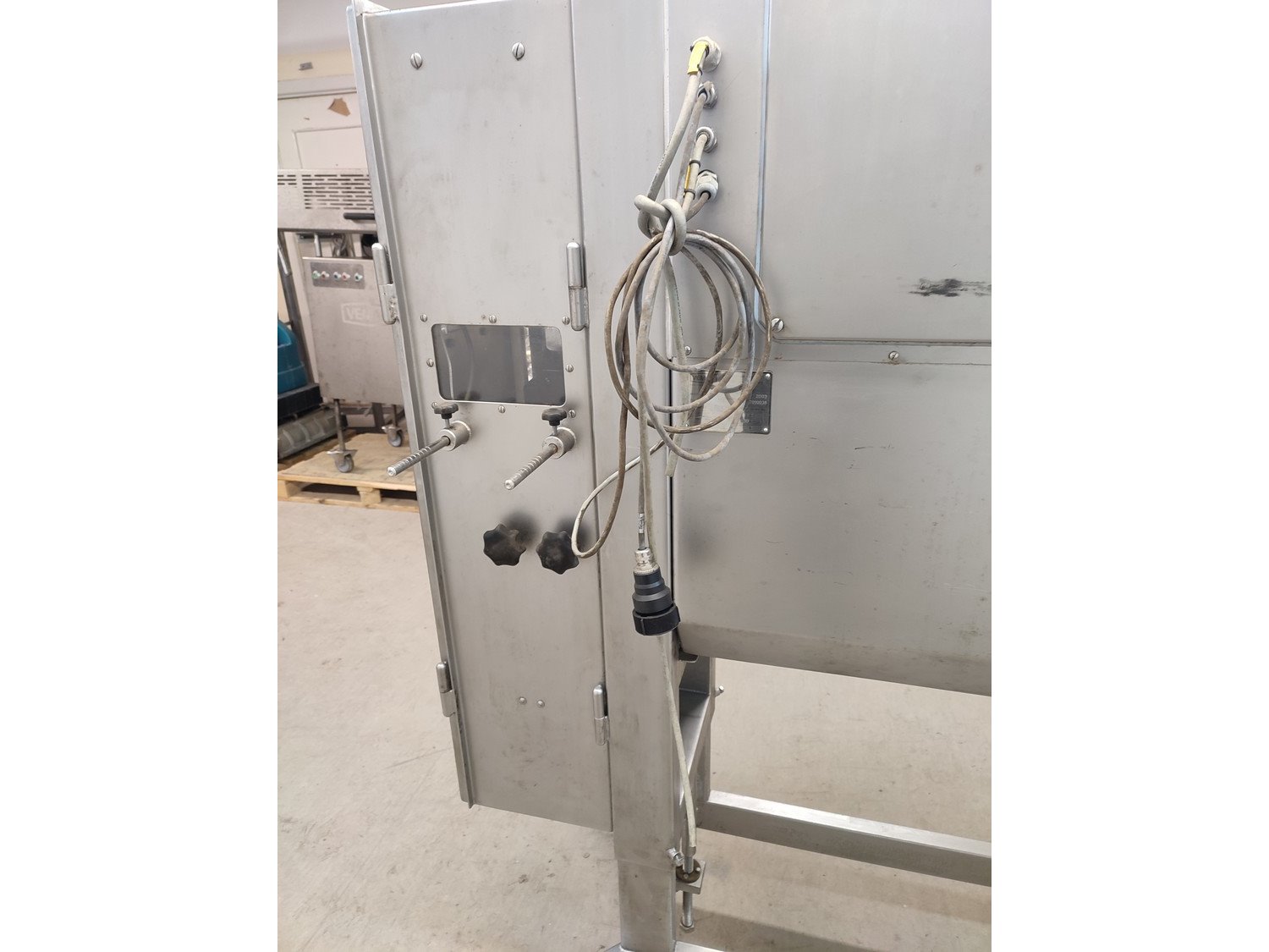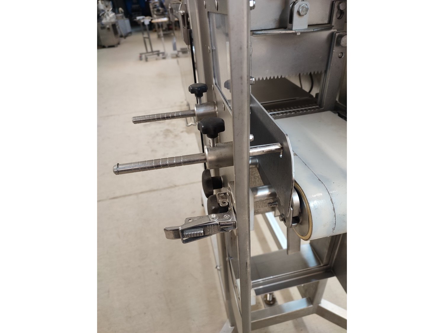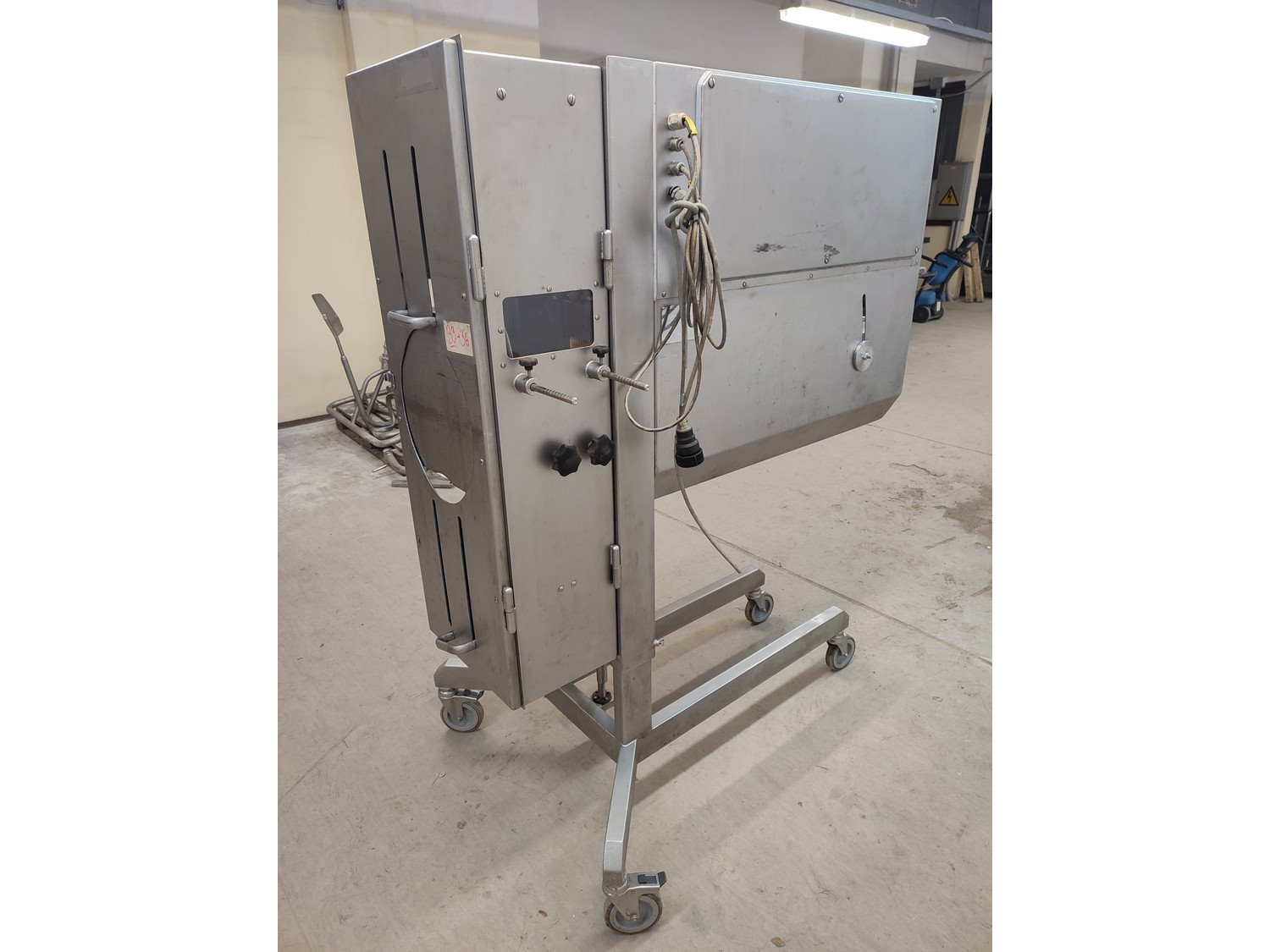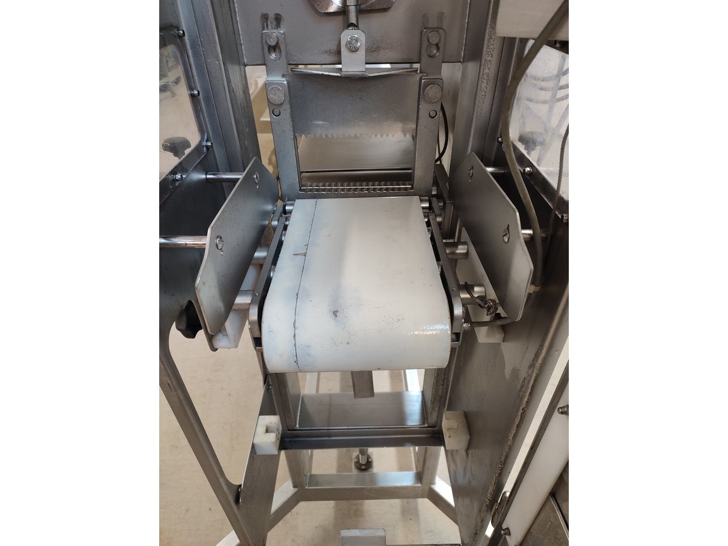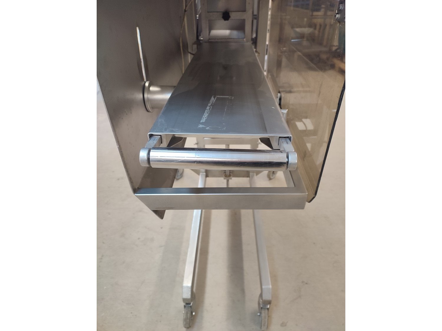 Vemag mobile portioning machine, type: 701, number: 7010038, year of construction: 2003, 400-460 V, 3 Ph, 50/60 Hz, 2 A, plastic belt, belt width: 190 mm, total dimensions: 1500 mm x 860 mm x 1660 mm. Missing belt.