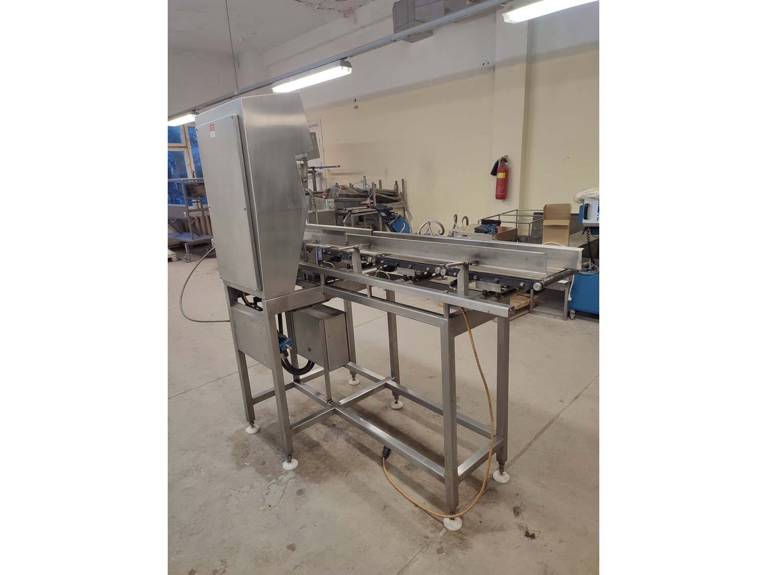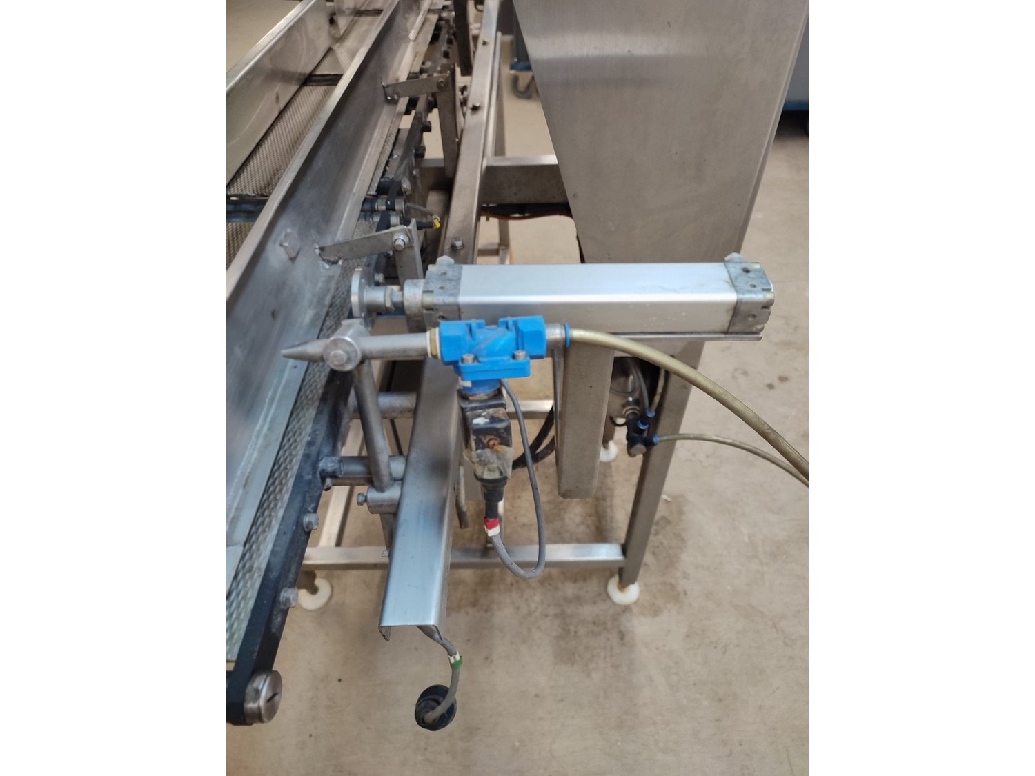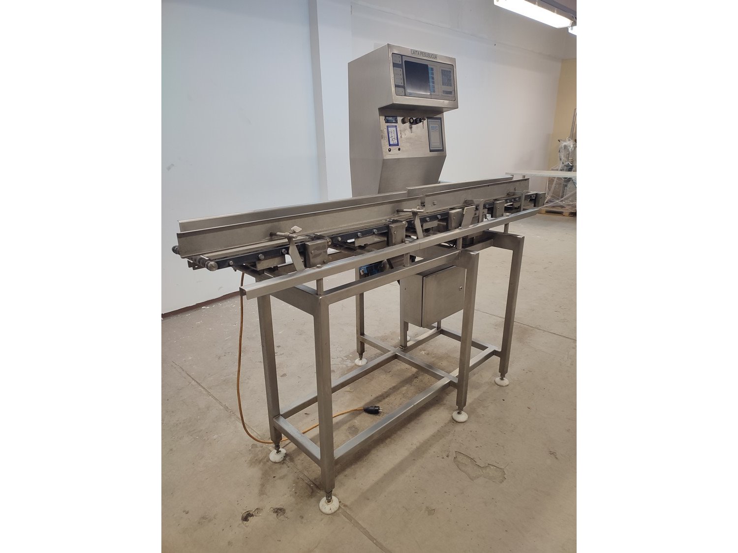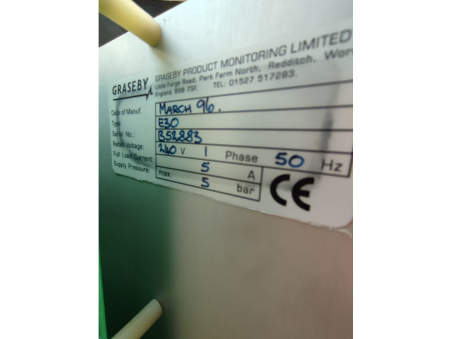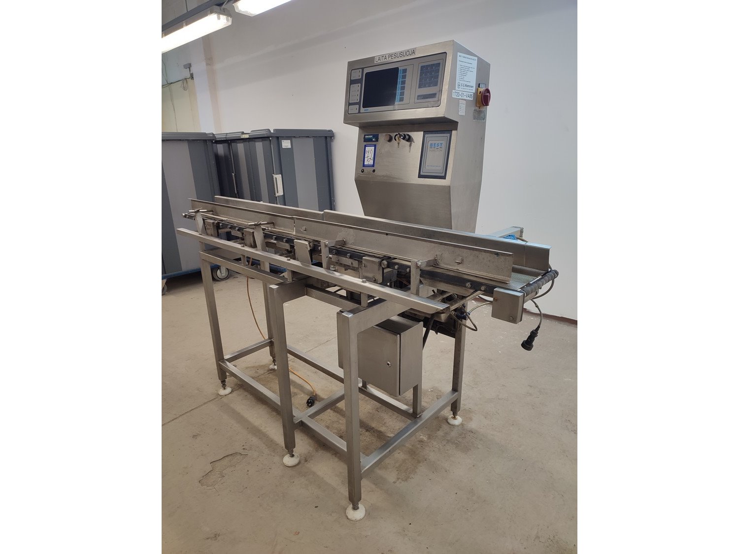 Graseby checkweigher, type: E30, serial number: B52883, year of construction: 03.1996, 240 V, 1 Ph, 50 Hz, 5 A, pressure: 5 bar, belt width: 200 mm, total dimensions: 2140 mm x 800 mm x 1770 mm. Missing belts.