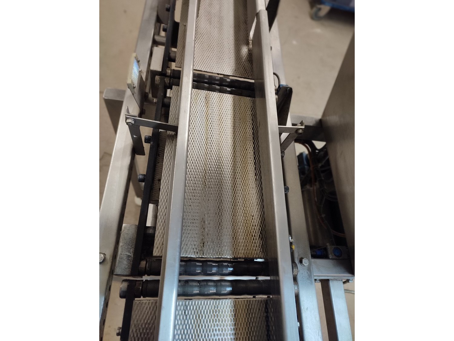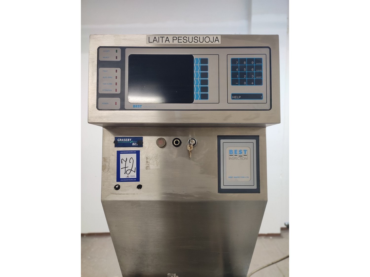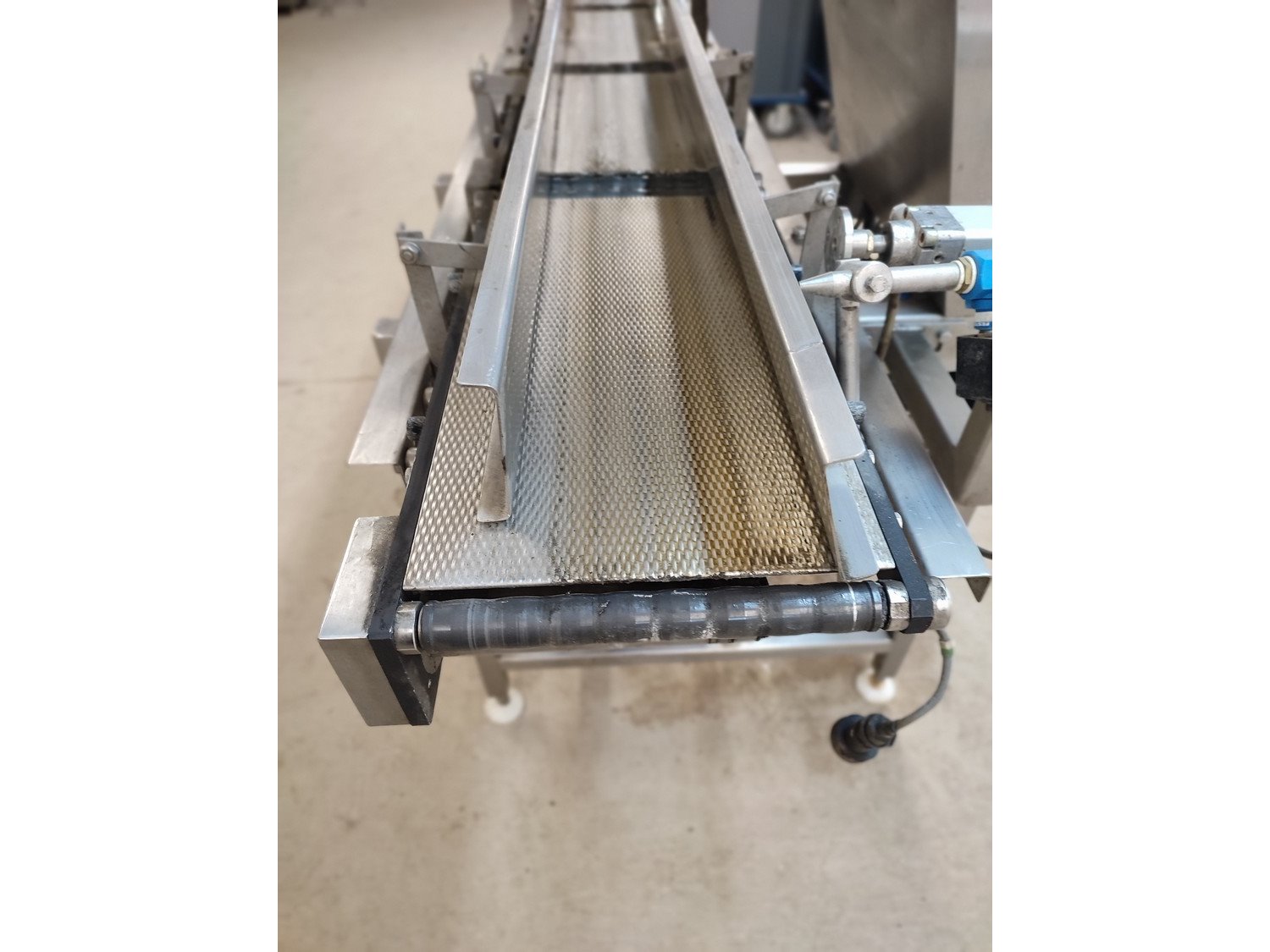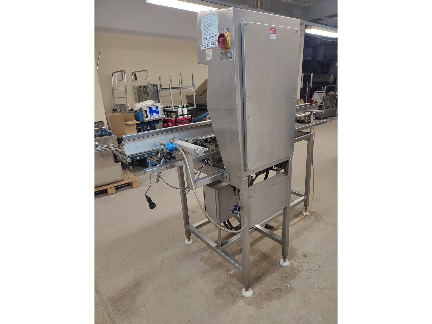 Graseby checkweigher, type: E30, serial number: B52883, year of construction: 03.1996, 240 V, 1 Ph, 50 Hz, 5 A, pressure: 5 bar, belt width: 200 mm, total dimensions: 2140 mm x 800 mm x 1770 mm. Missing belts.