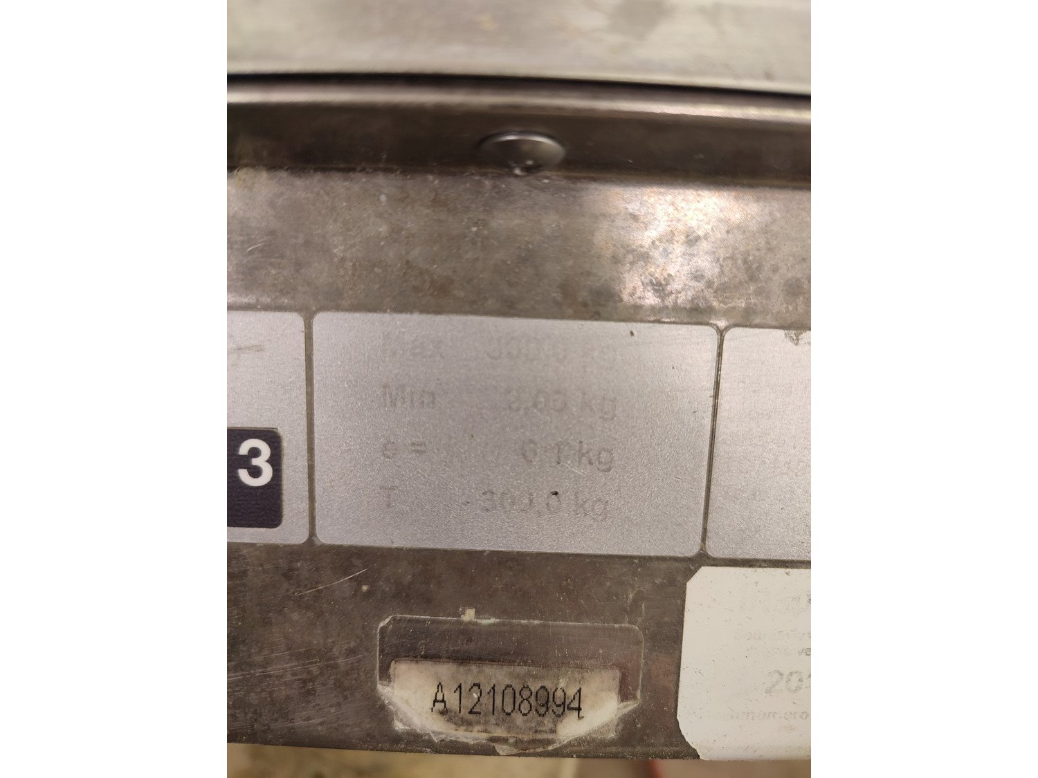 S/s floor weighing scale with K-PZ Waagen indicator, type: KPZ 52E-9-1, number: A12108994, maximum weight: 300 kg, minimum weight: 2 kg, e=: 0.1 kg, T=- 300 kg, dimensions: 800 mm x 1100 mm x 100 mm. Including ramp.