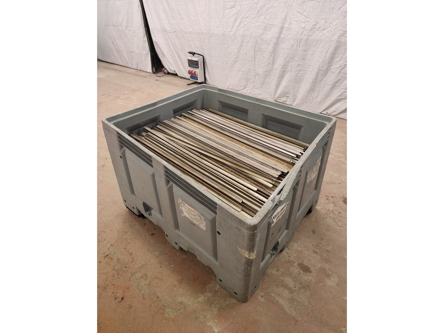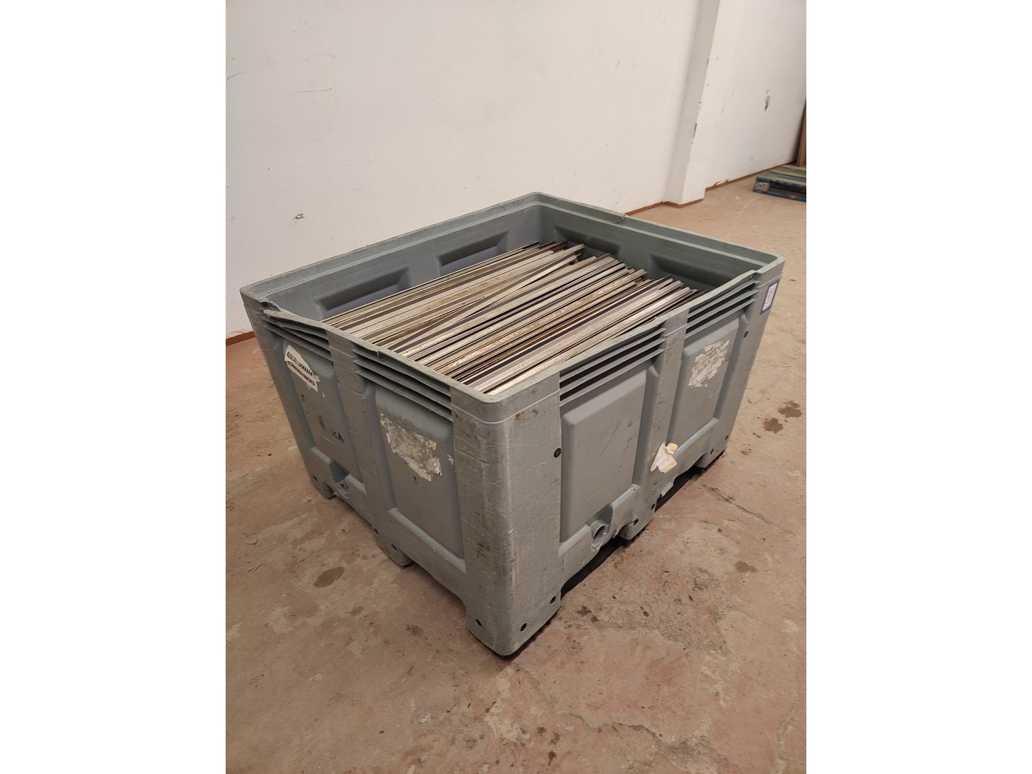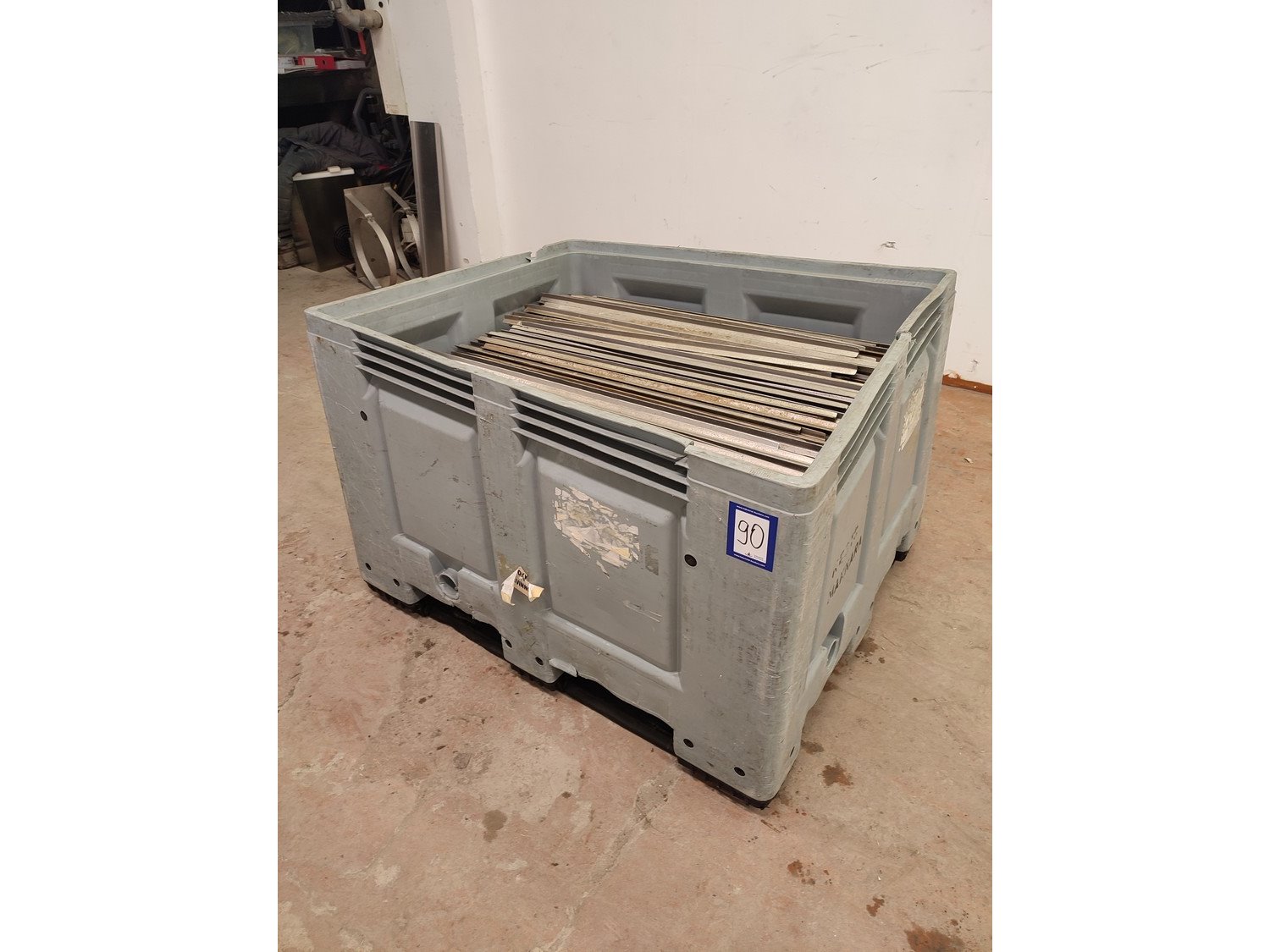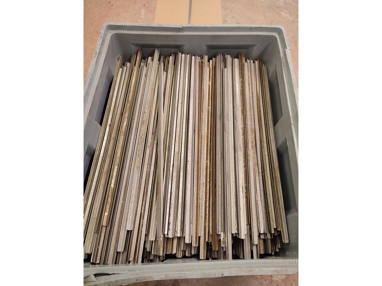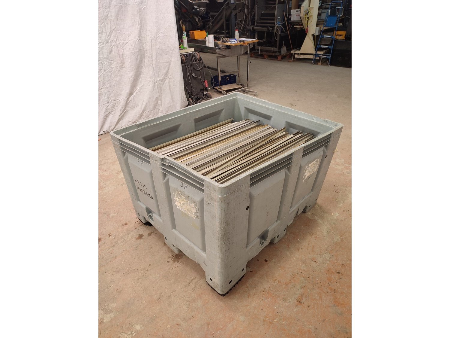 Plastic pallet box with large amount of aluminium smoke sticks, Y-shaped, length: 1000 mm, dimensions pallet box: 1200 mm x 1000 mm x 800 mm.