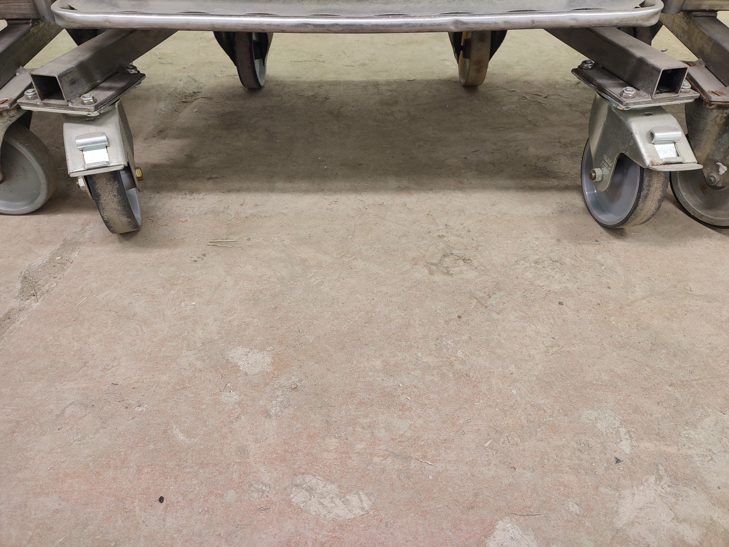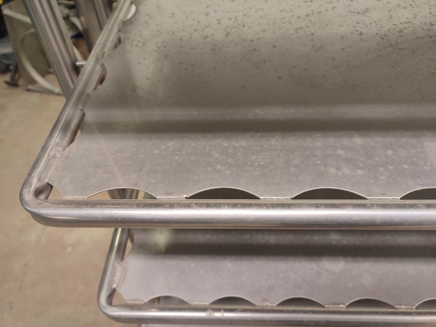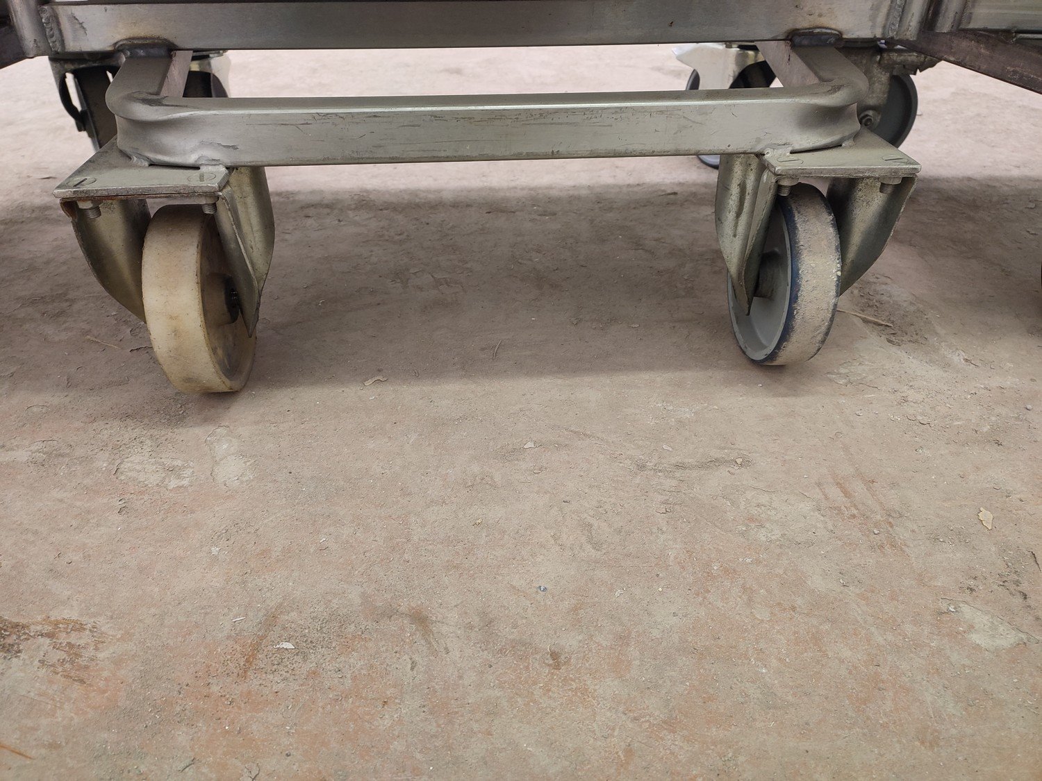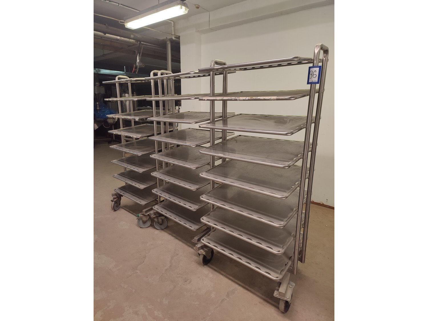 3 s/s defrosting trolleys, 8 floors, floor dimensions: (8x) 750 mm x 600 mm, distance between floors: 180 mm, total dimensions: (3x) 880 mm x 640 mm x 1810 mm.