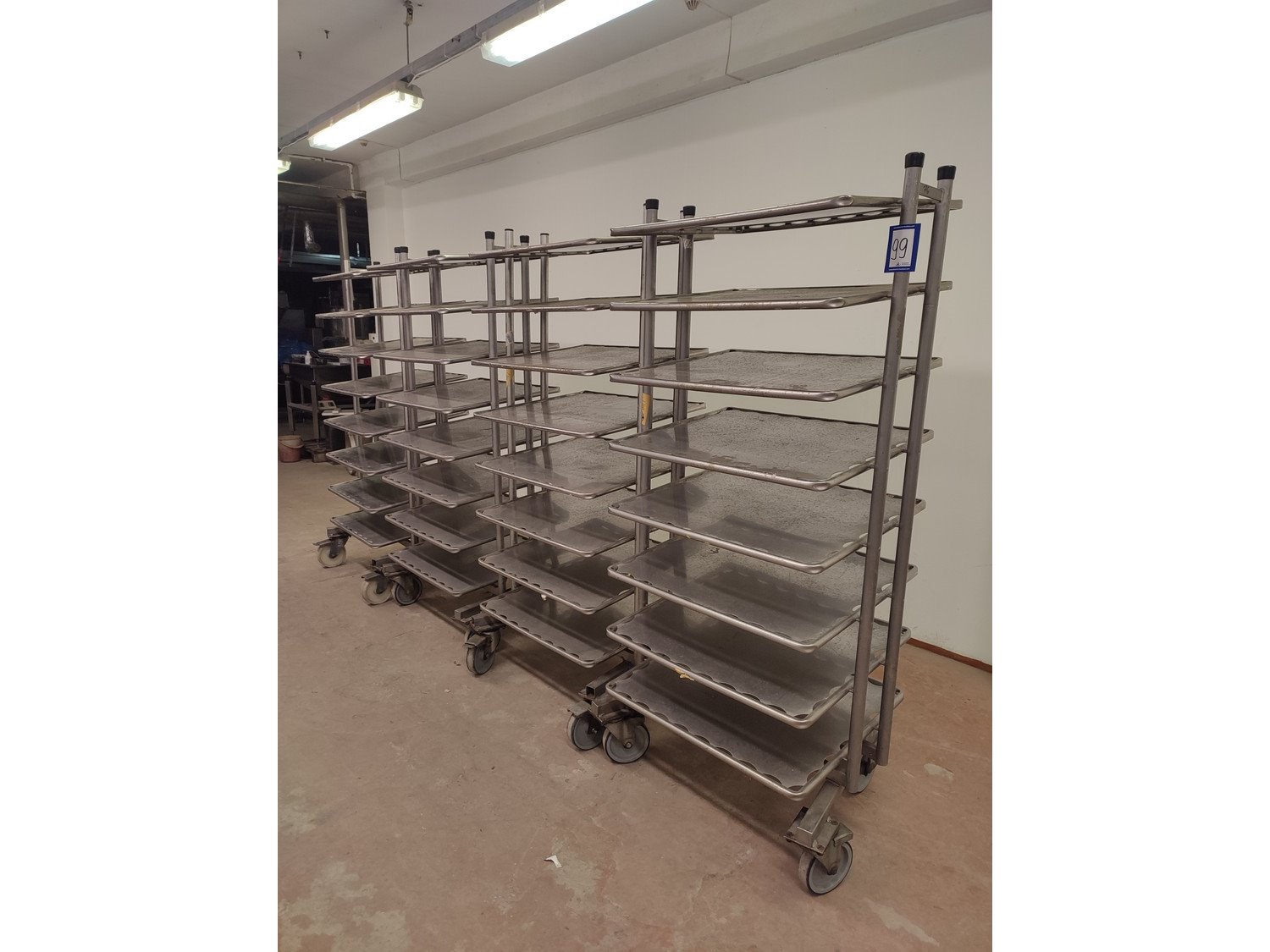 4 s/s defrosting trolleys, 8 floors, floor dimensions: (8x) 750 mm x 600 mm, distance between floors: 180 mm, total dimensions: (4x) 880 mm x 640 mm x 1810 mm.