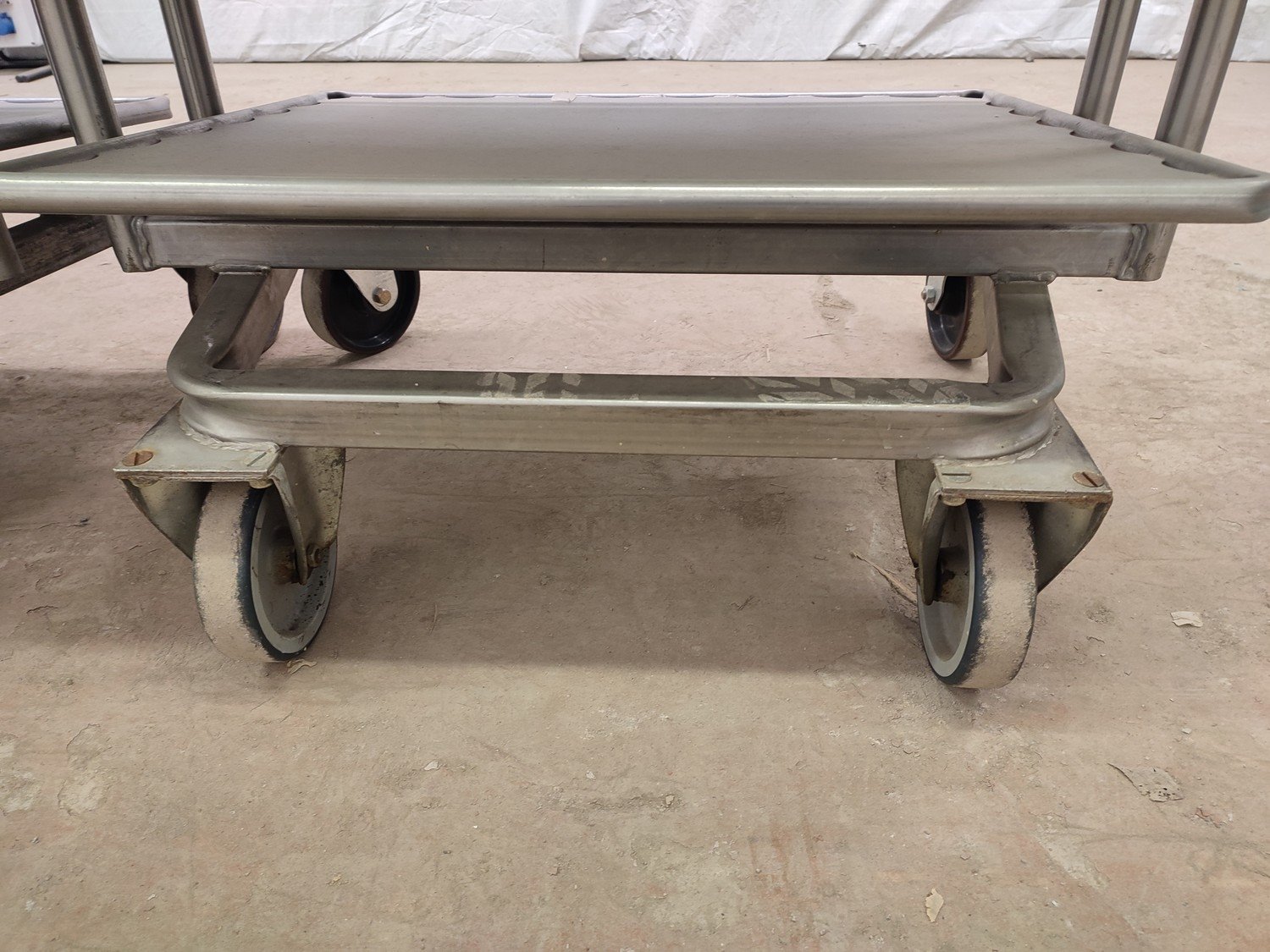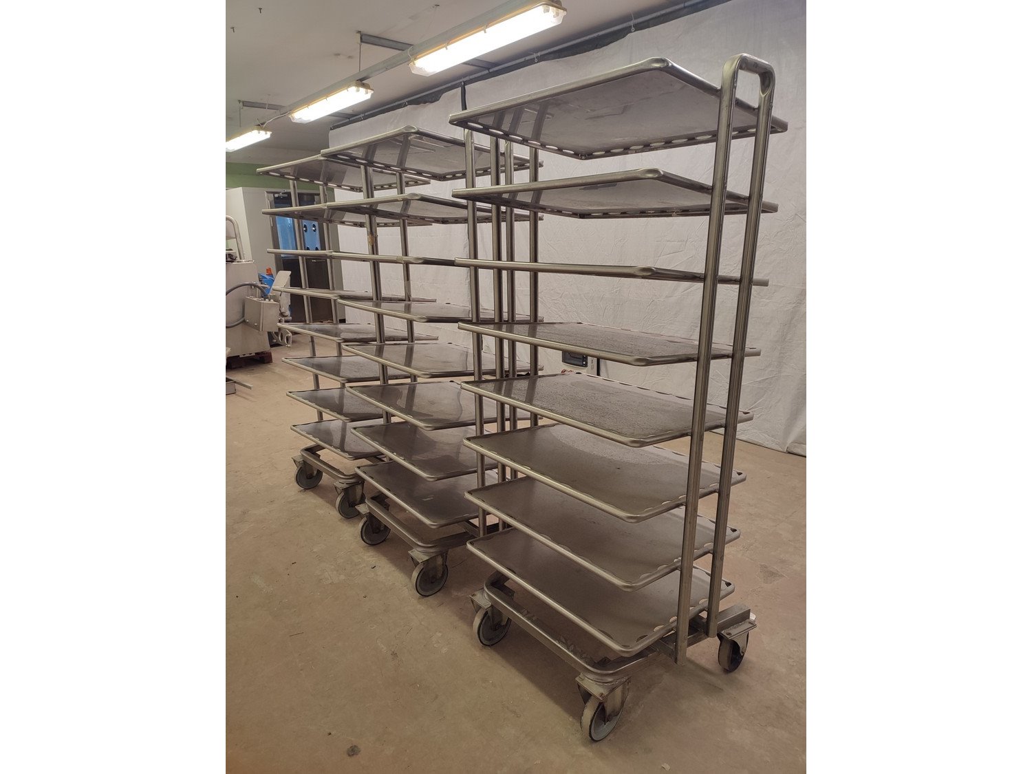 3 s/s defrosting trolleys, 8 floors, floor dimensions: (8x) 750 mm x 600 mm, distance between floors: 180 mm, total dimensions: (3x) 880 mm x 640 mm x 1810 mm.