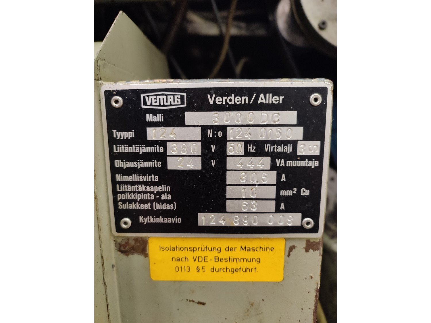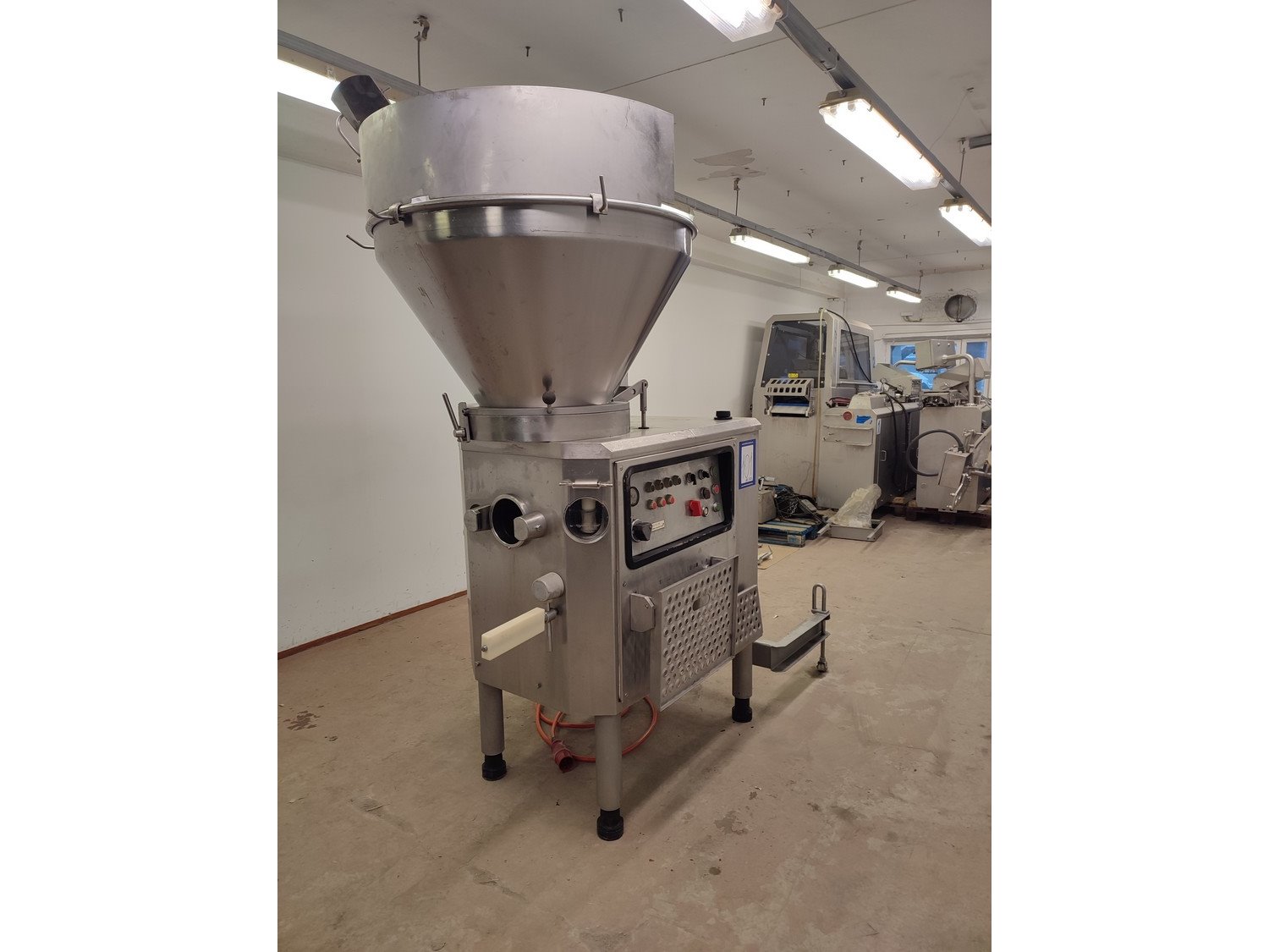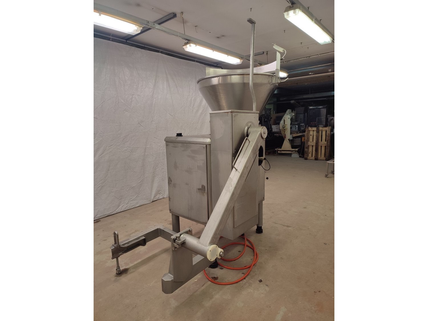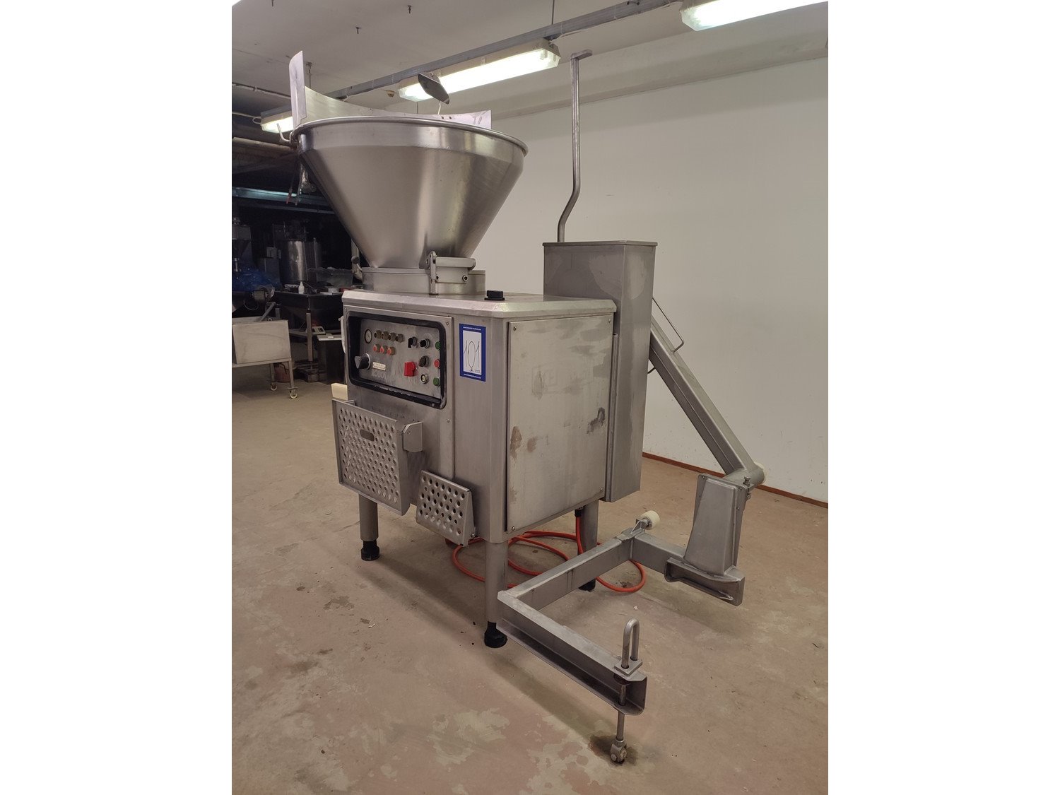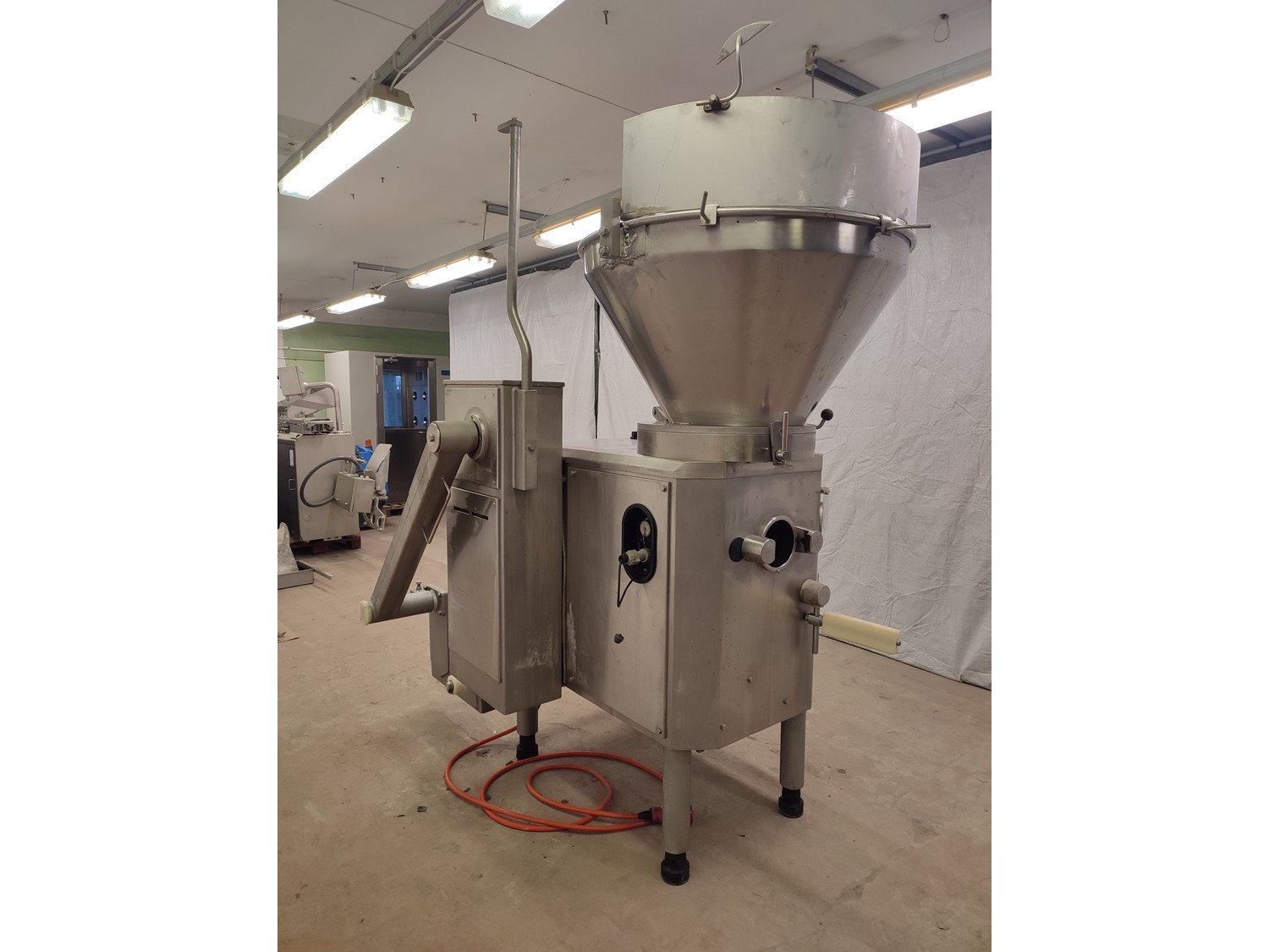 Vemag vacuum filling machine with lifter for 200 liter meat bins, model: 3000 DC, type: 124, number: 124 0160, 380 V, 3 Ph, 50 Hz, 30,5 A, dimensions: 2300 mm x 1300 mm x 2400 mm.