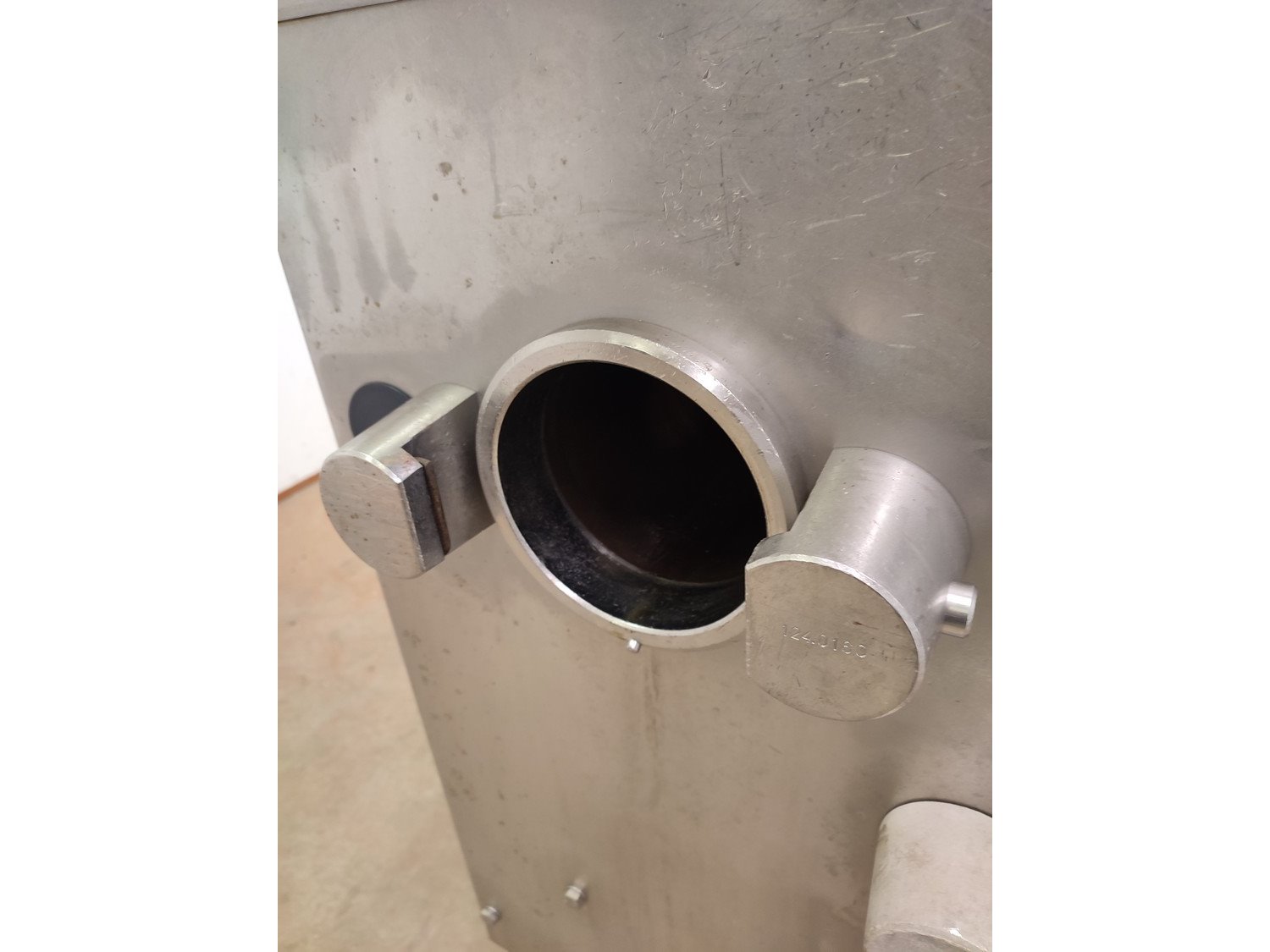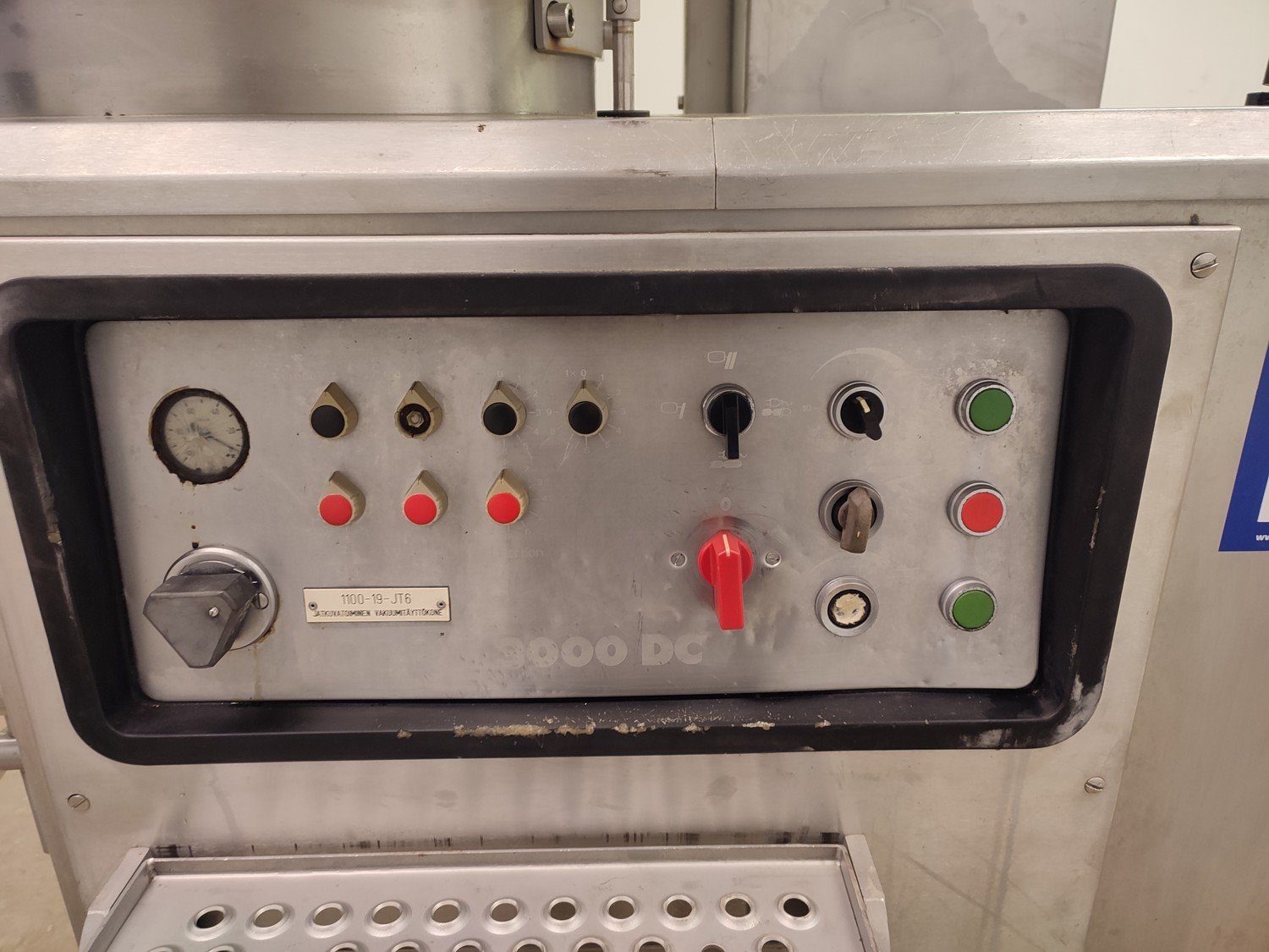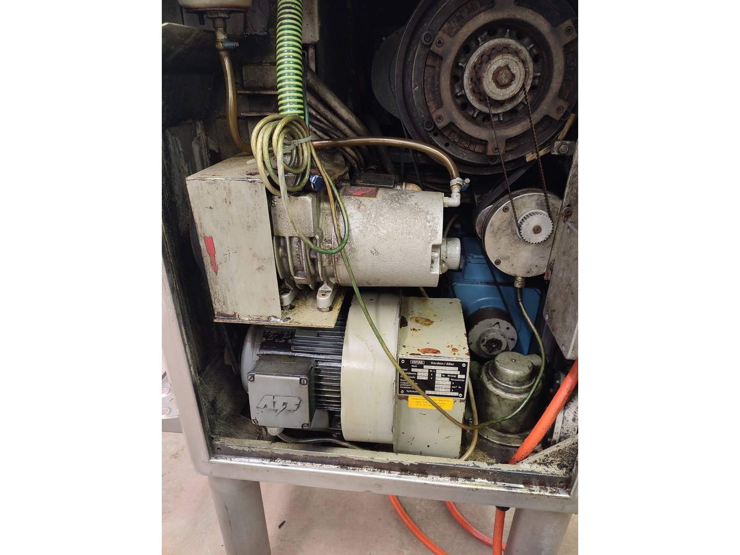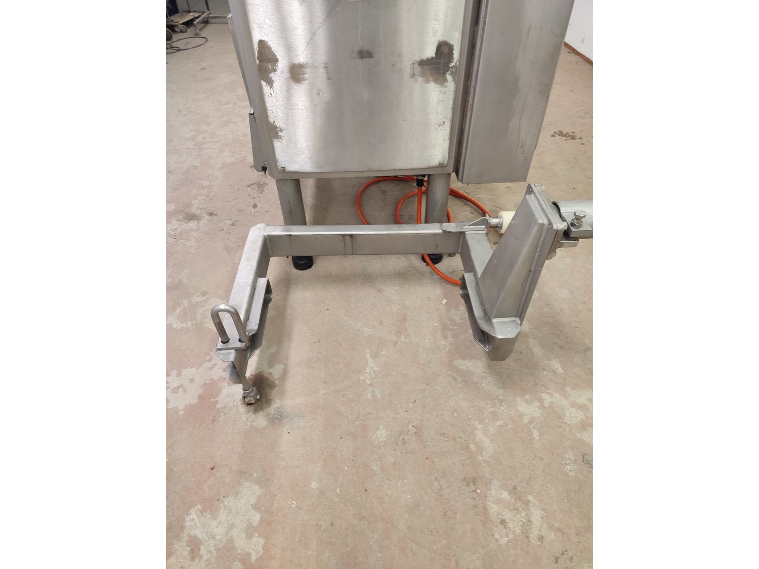 Vemag vacuum filling machine with lifter for 200 liter meat bins, model: 3000 DC, type: 124, number: 124 0160, 380 V, 3 Ph, 50 Hz, 30,5 A, dimensions: 2300 mm x 1300 mm x 2400 mm.