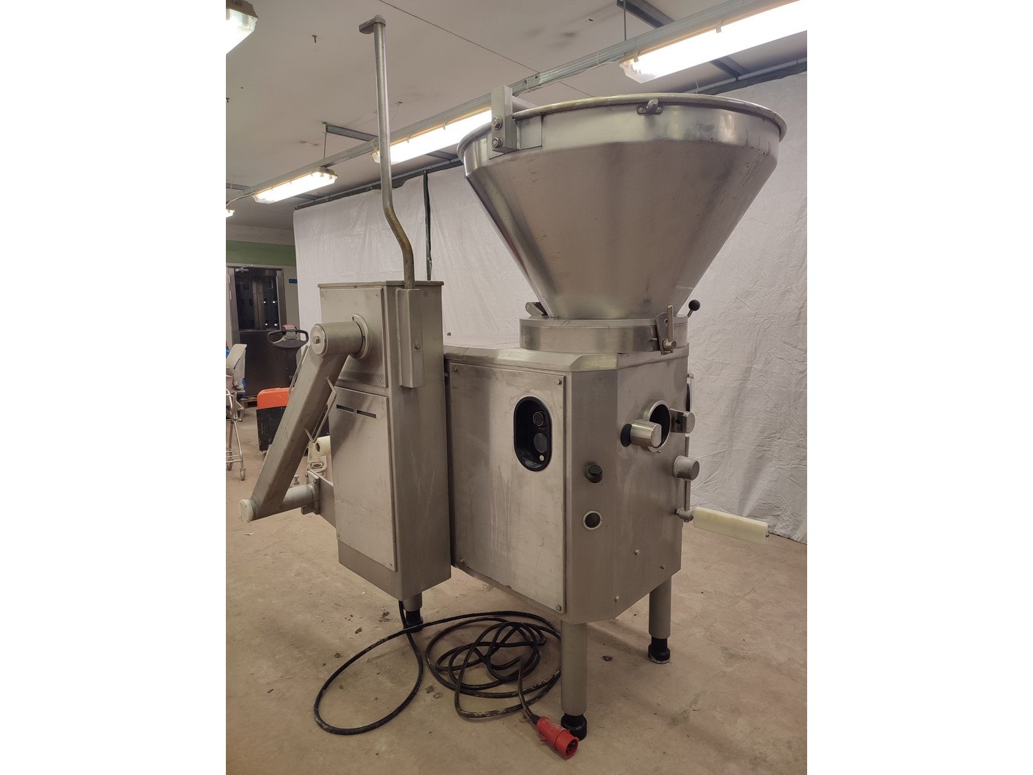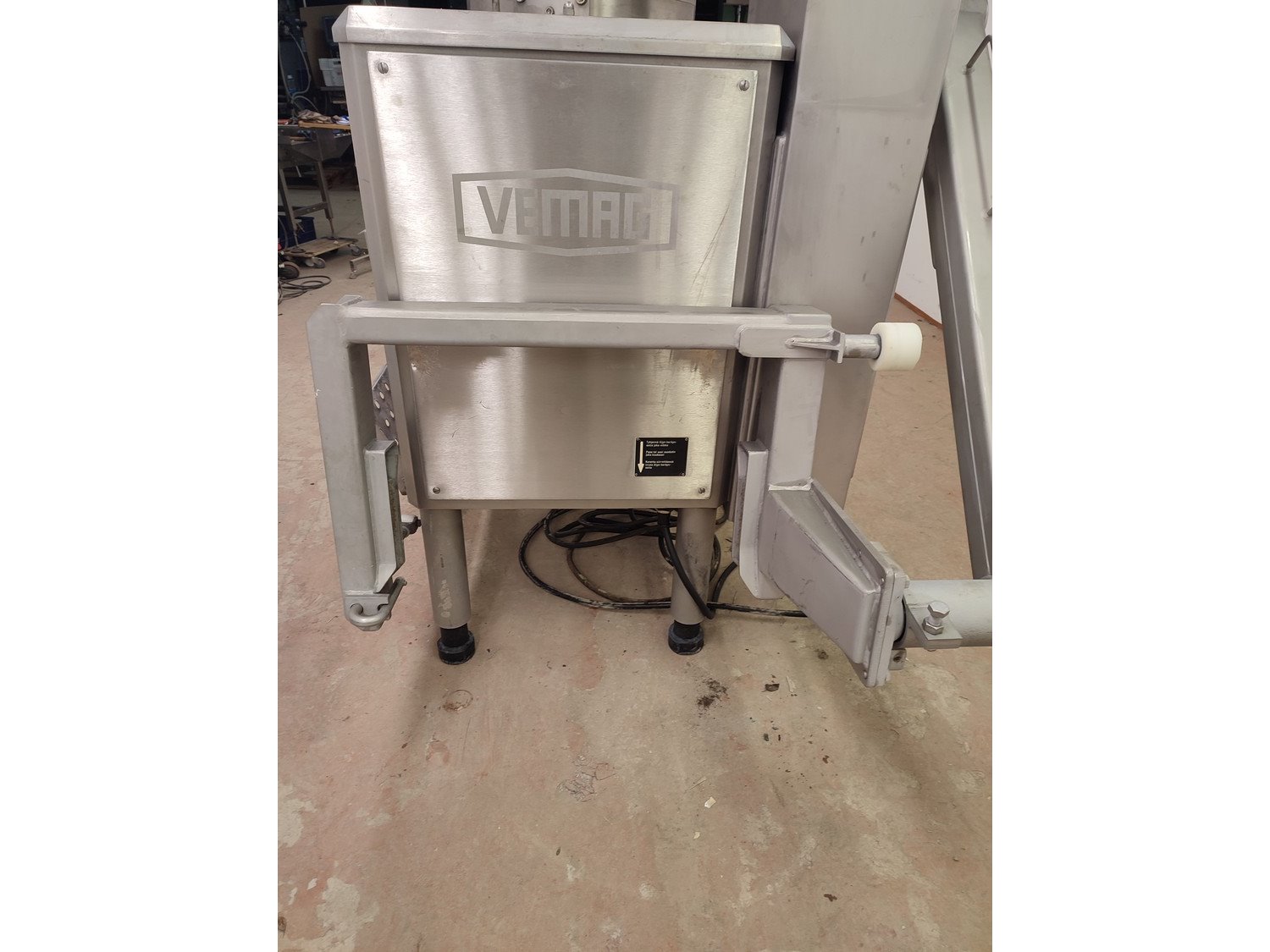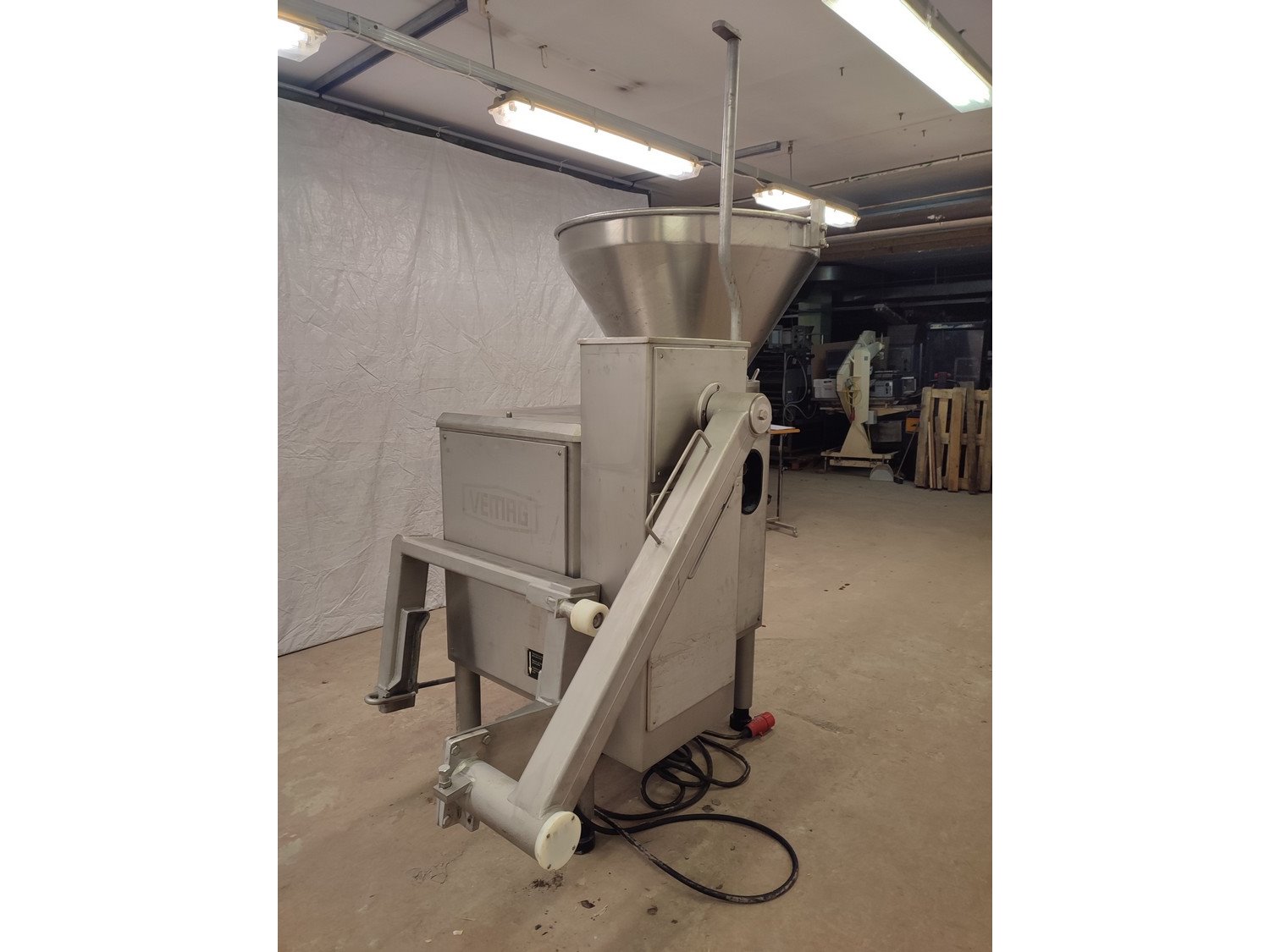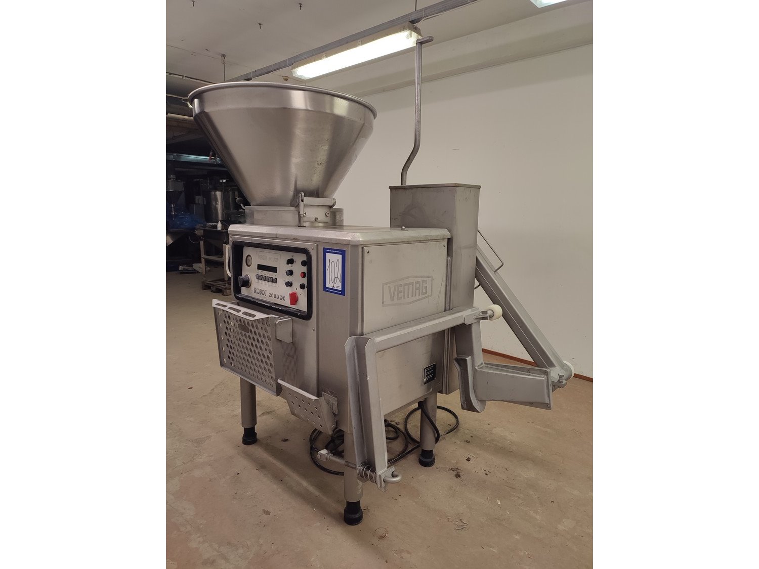 Vemag vacuum filling machine with lifter for 200 liter meat bins, model: 2000 DC, type: 132, number: 1320154-1, 380 V, 3 Ph, 50 Hz, 42 A, dimensions: 2200 mm x 1300 mm x 2400 mm.
