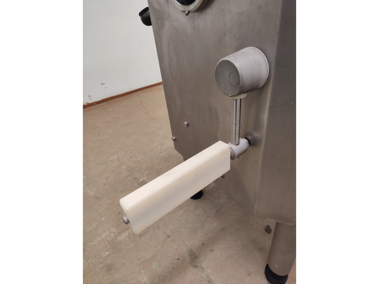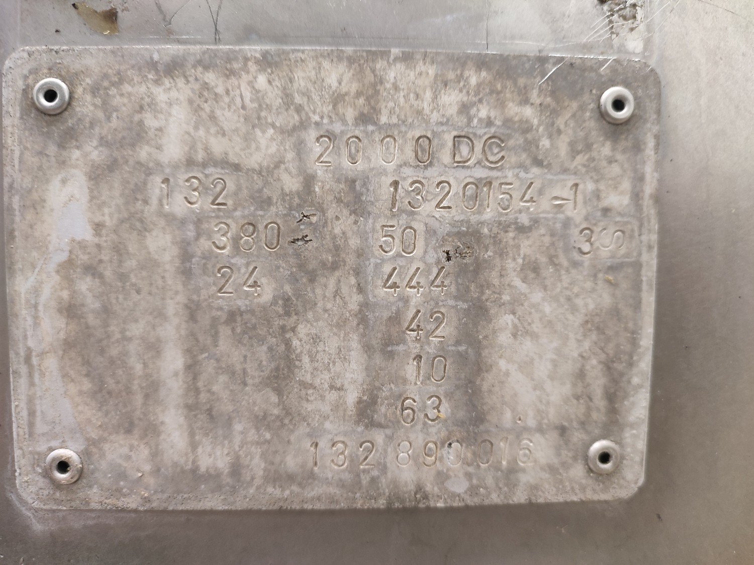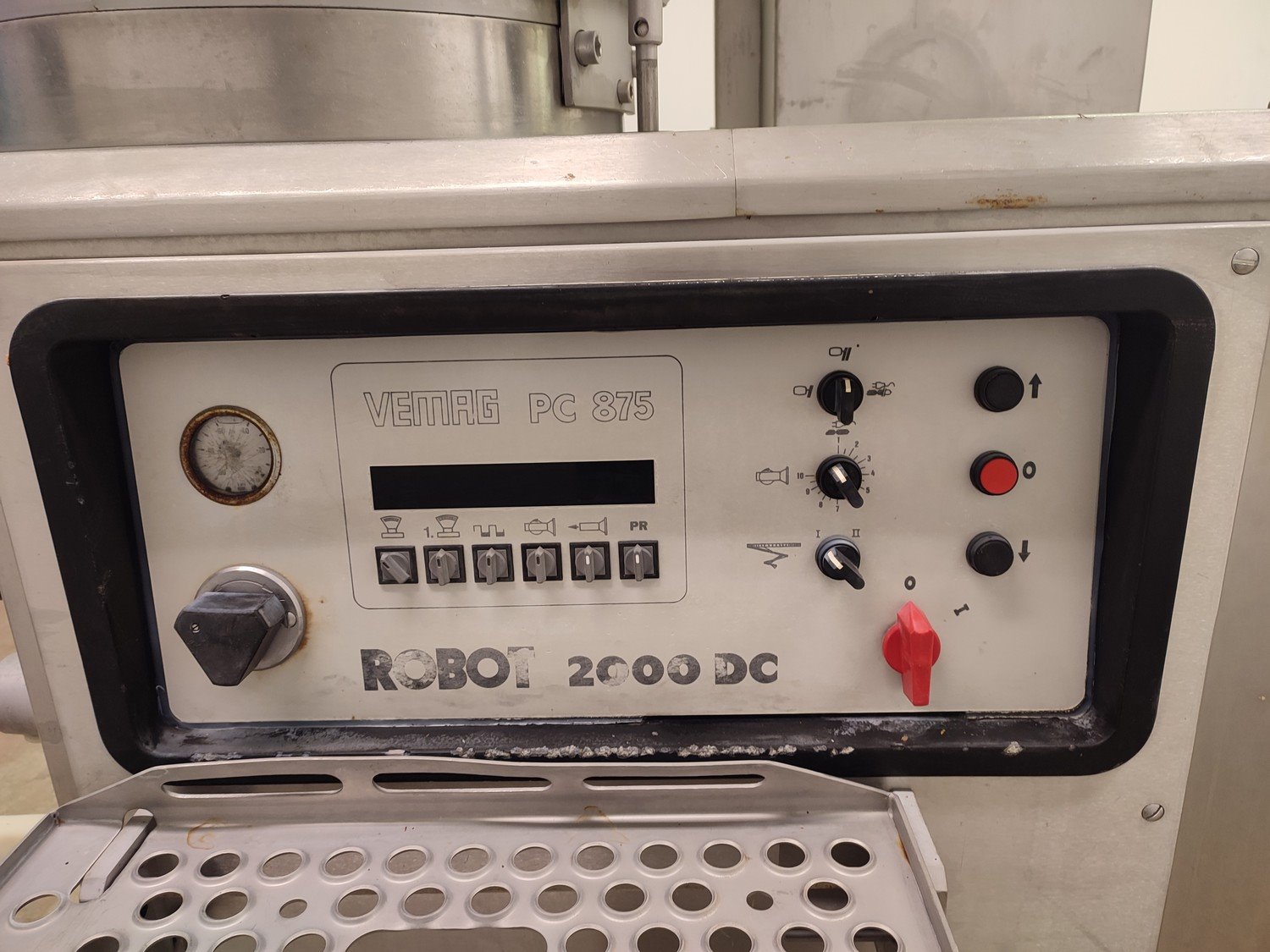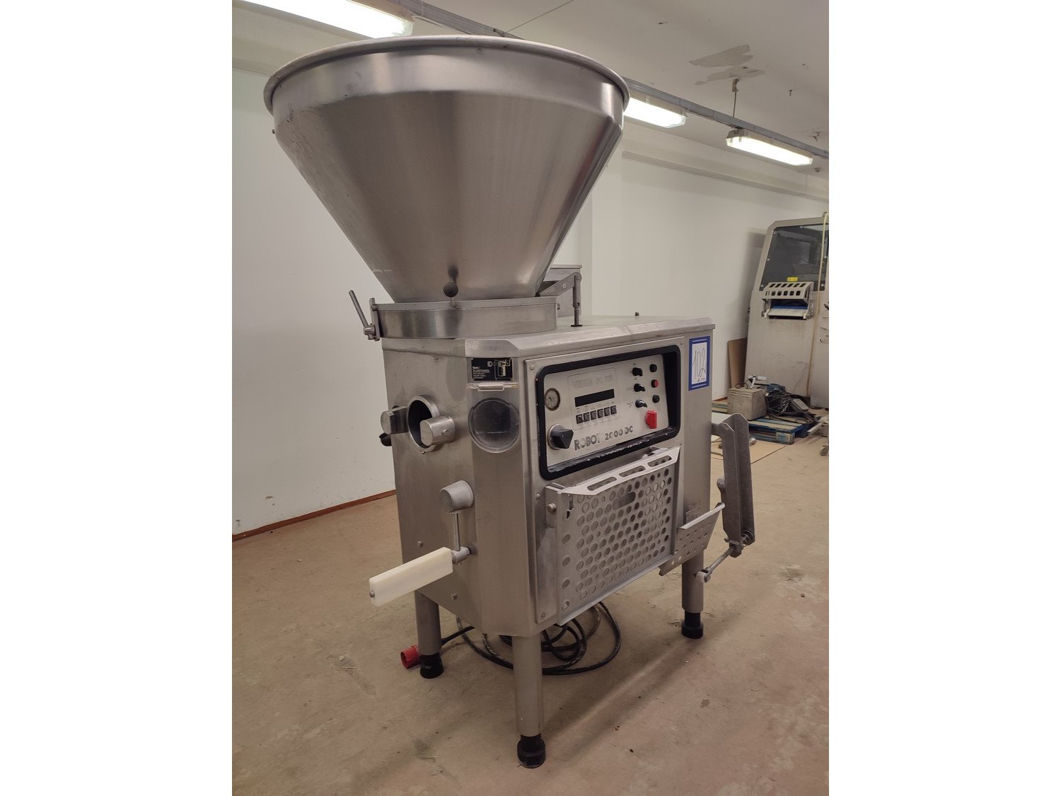 Vemag vacuum filling machine with lifter for 200 liter meat bins, model: 2000 DC, type: 132, number: 1320154-1, 380 V, 3 Ph, 50 Hz, 42 A, dimensions: 2200 mm x 1300 mm x 2400 mm.