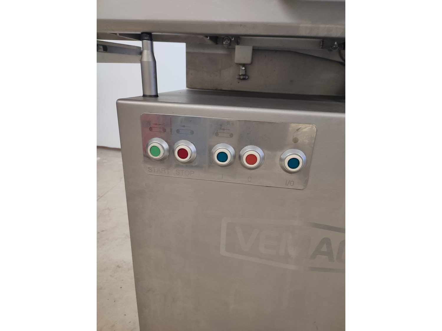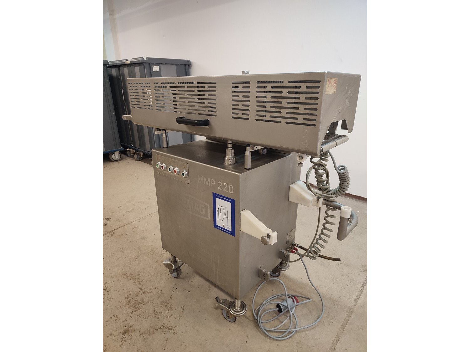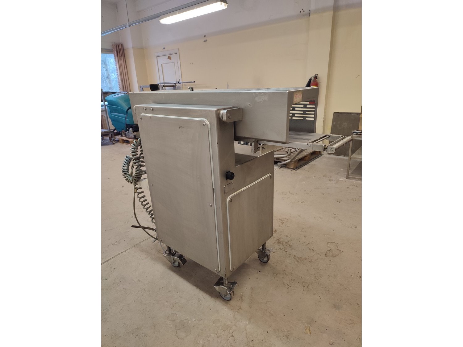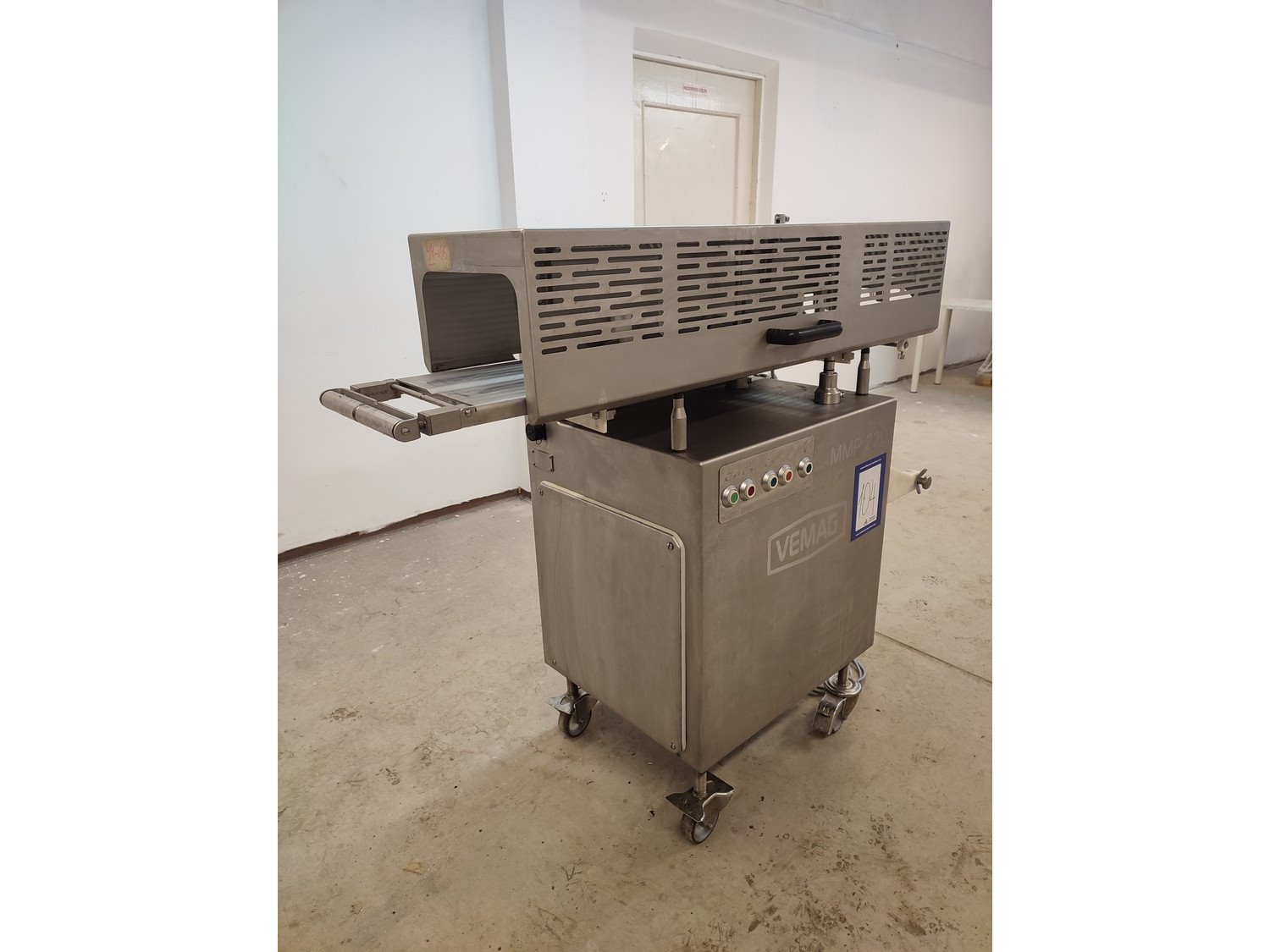 Vemag mobile portioning machine, model: MMP 220, number: 2200198, year of construction: 2008, 400-460 V, 3 Ph, 50/60 Hz, 3.5 A, 1.5 kW, pressure: 6 bar, belt width: 260 mm, total dimensions: 1630 mm x 600 mm x 1400 mm. Missing belts.