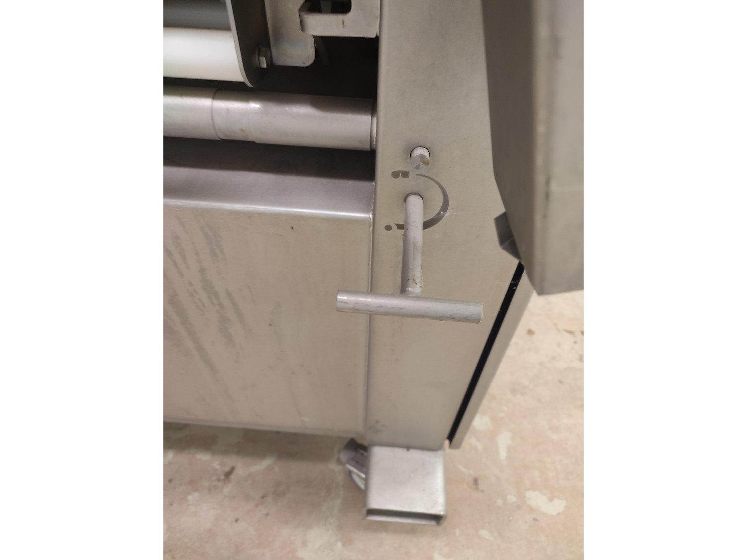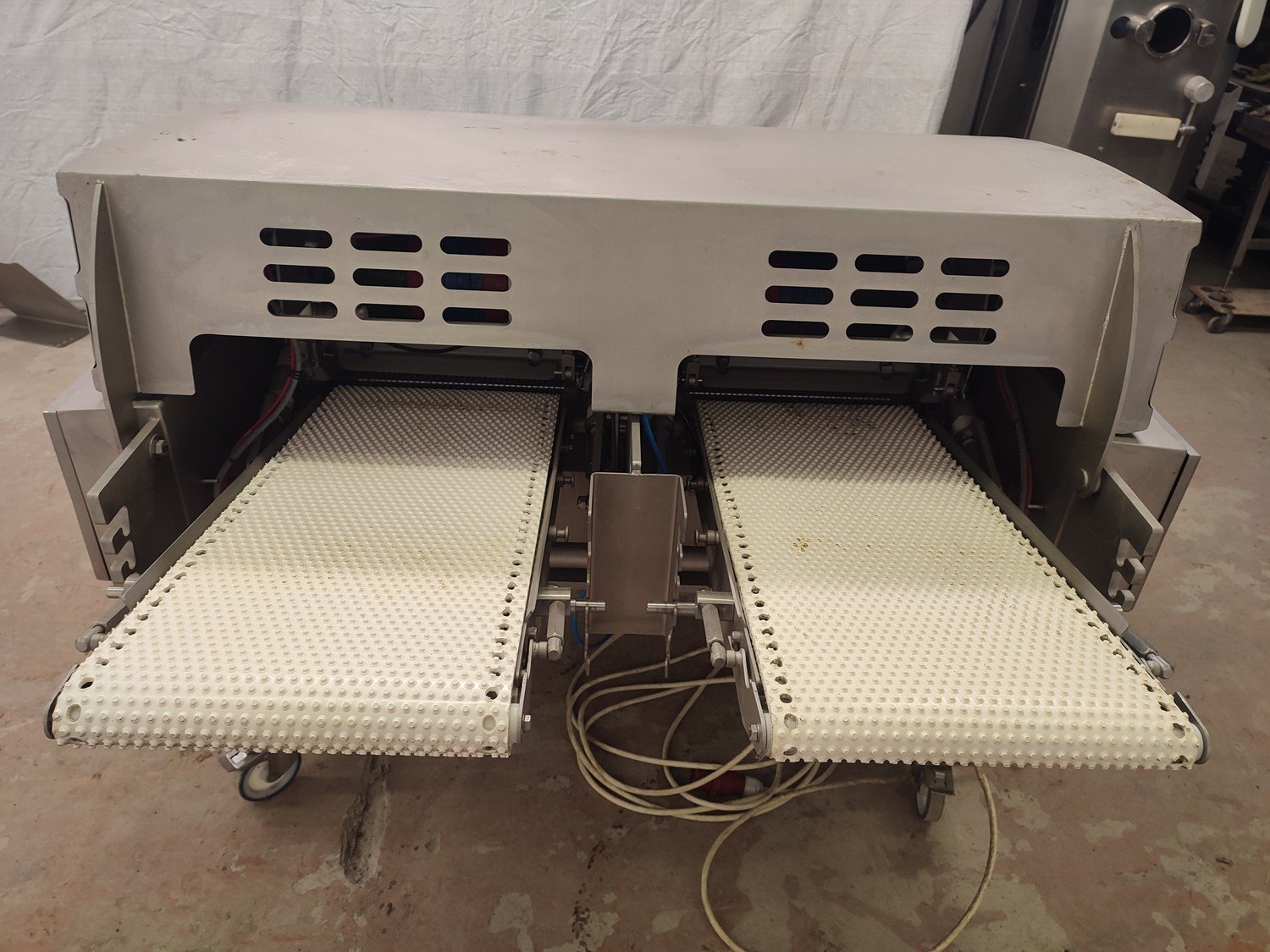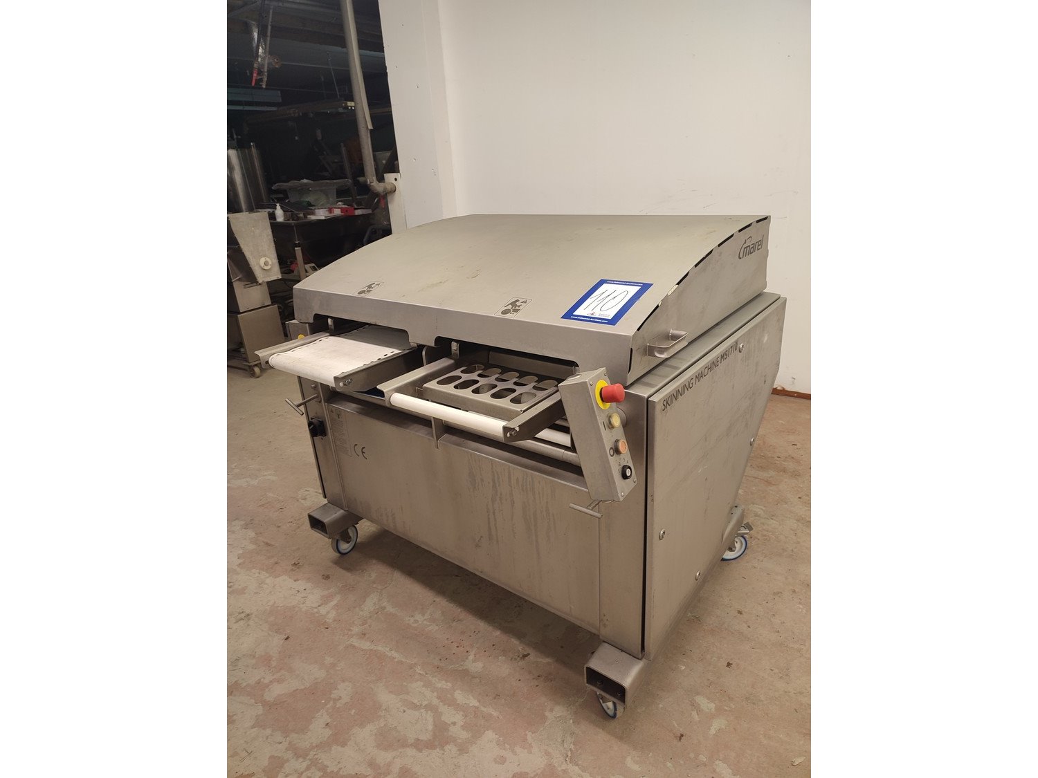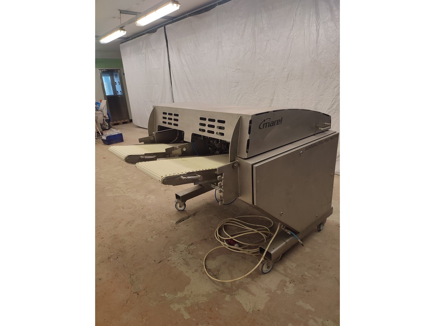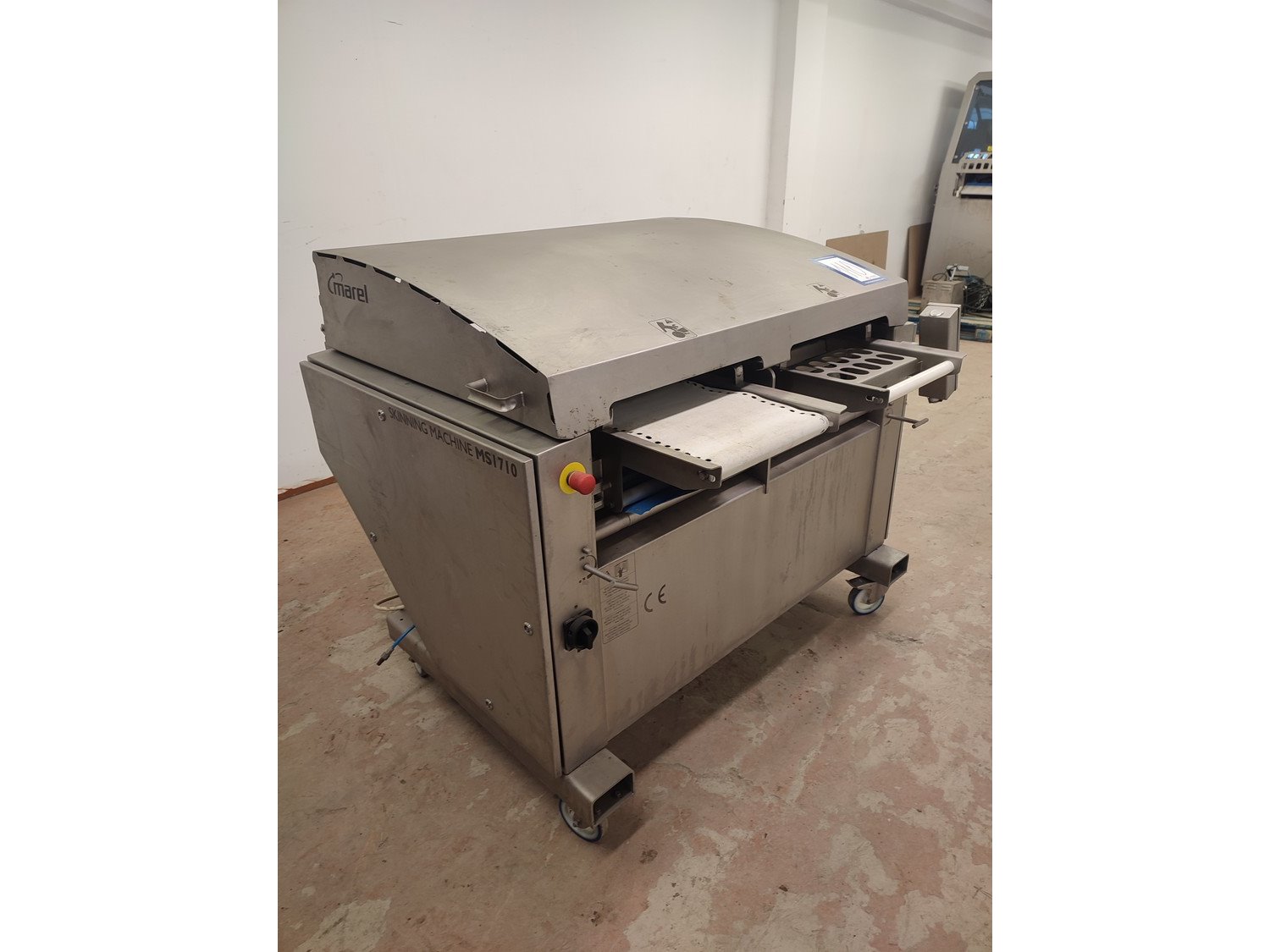 Marel mobile double skinning machine for fish, model: MS1710, type: 9830844AA, machine number: 10392514, year of construction: 2016, 400 V, 3 Ph, 50 Hz, 5 A, plastic belt, belt width: 355 mm, working width: (2x) 365 mm, skinning machine dimensions: 1430 mm x 1740 mm x 1260 mm. Including s/s trolley, dimensions: 1700 mm x 600 mm x 1420 mm. Missing belt.
