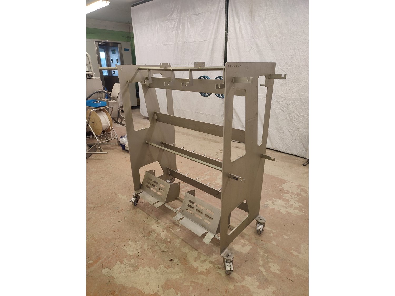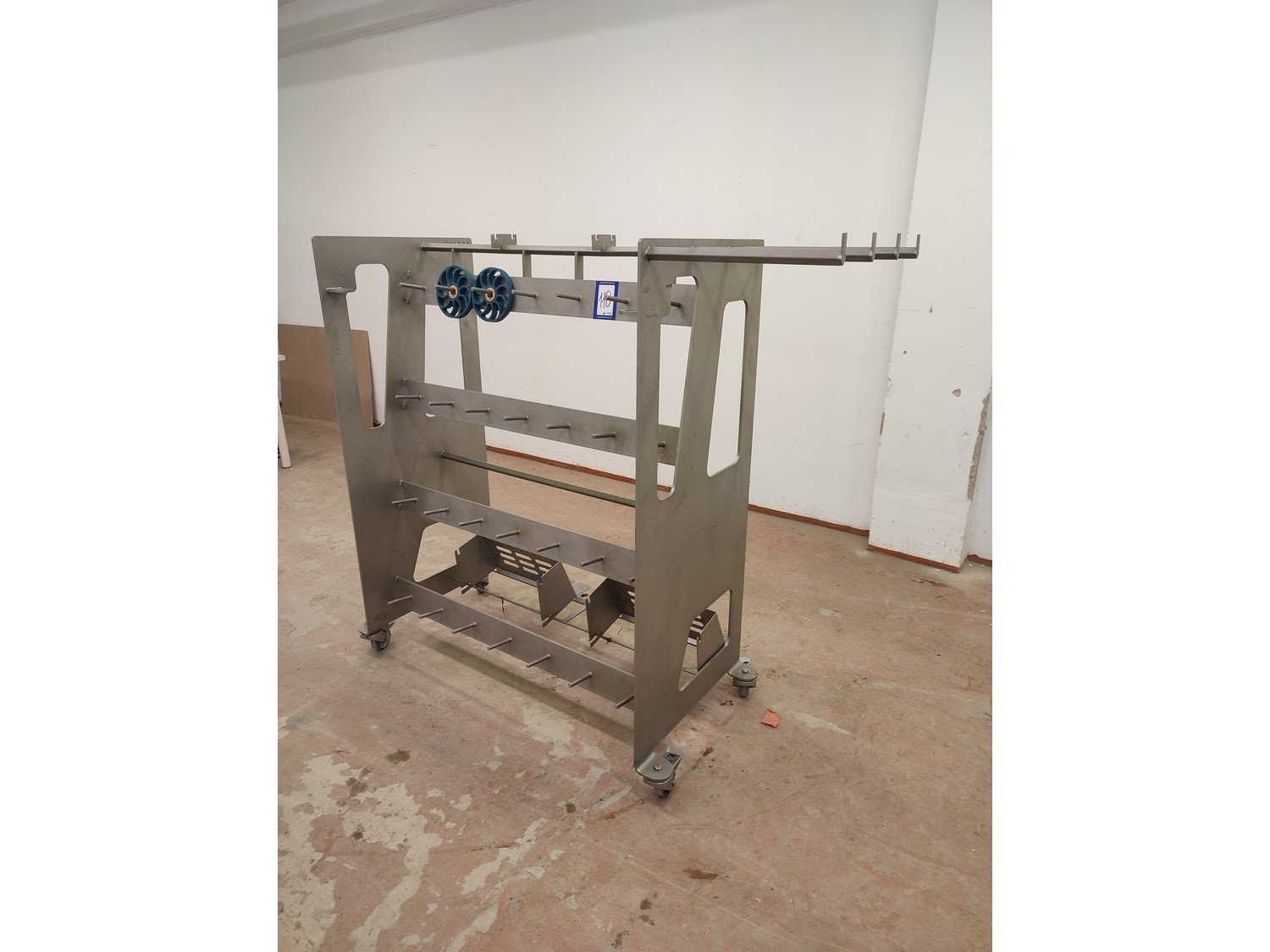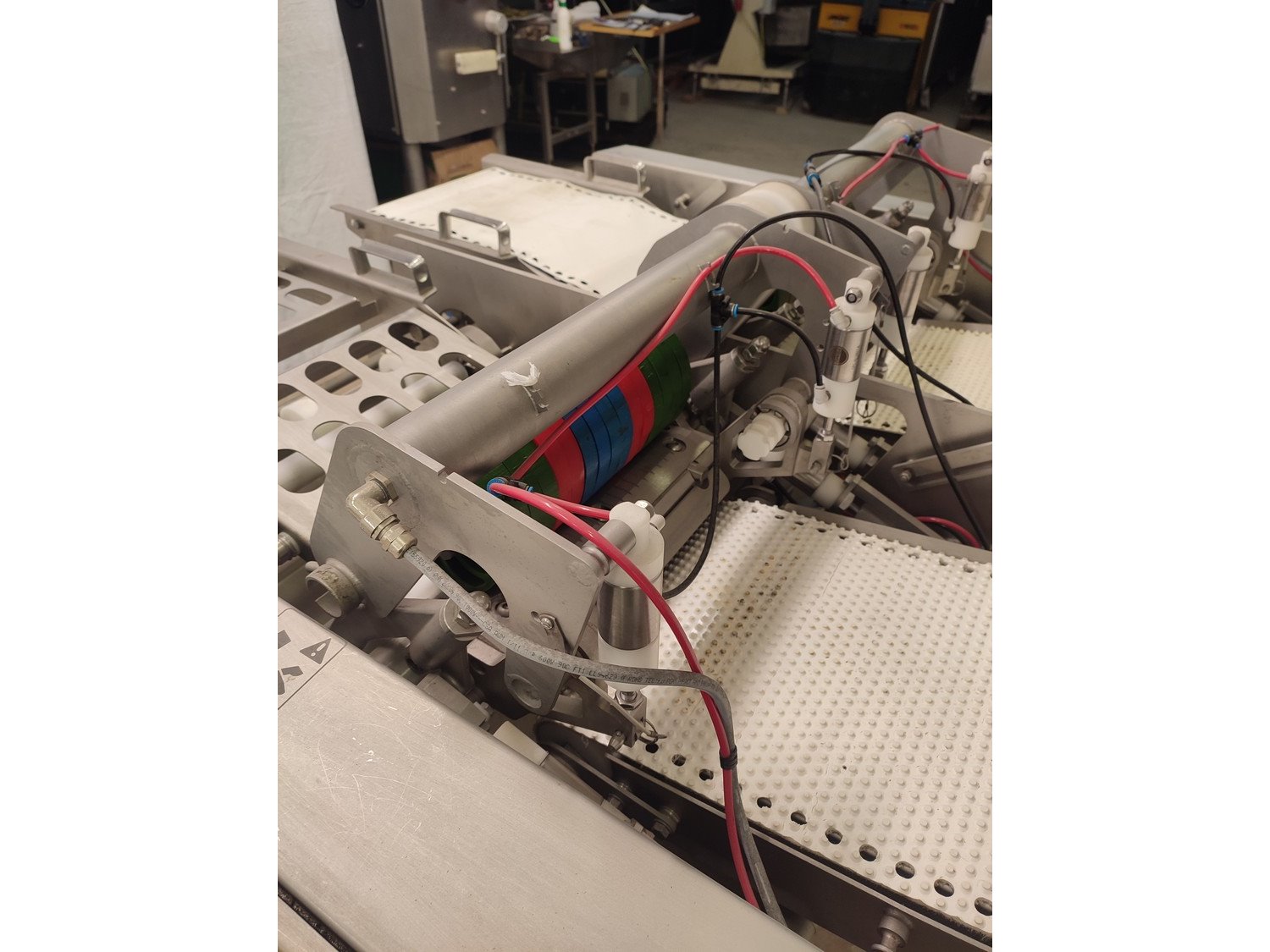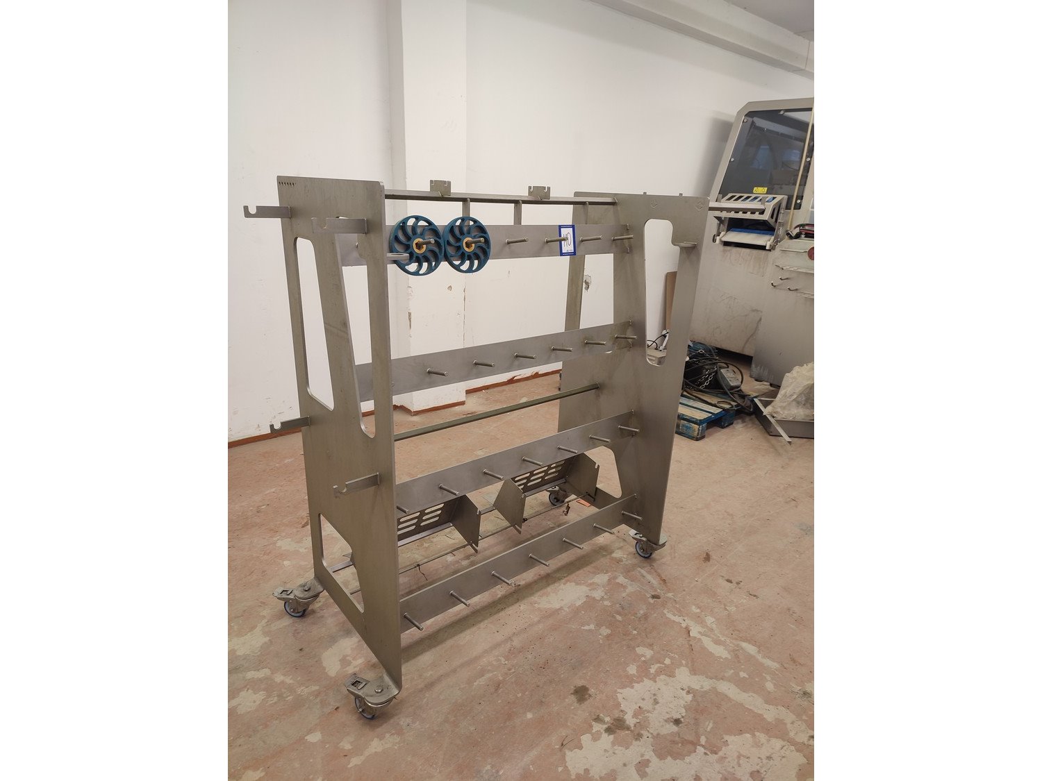 Marel mobile double skinning machine for fish, model: MS1710, type: 9830844AA, machine number: 10392514, year of construction: 2016, 400 V, 3 Ph, 50 Hz, 5 A, plastic belt, belt width: 355 mm, working width: (2x) 365 mm, skinning machine dimensions: 1430 mm x 1740 mm x 1260 mm. Including s/s trolley, dimensions: 1700 mm x 600 mm x 1420 mm. Missing belt.