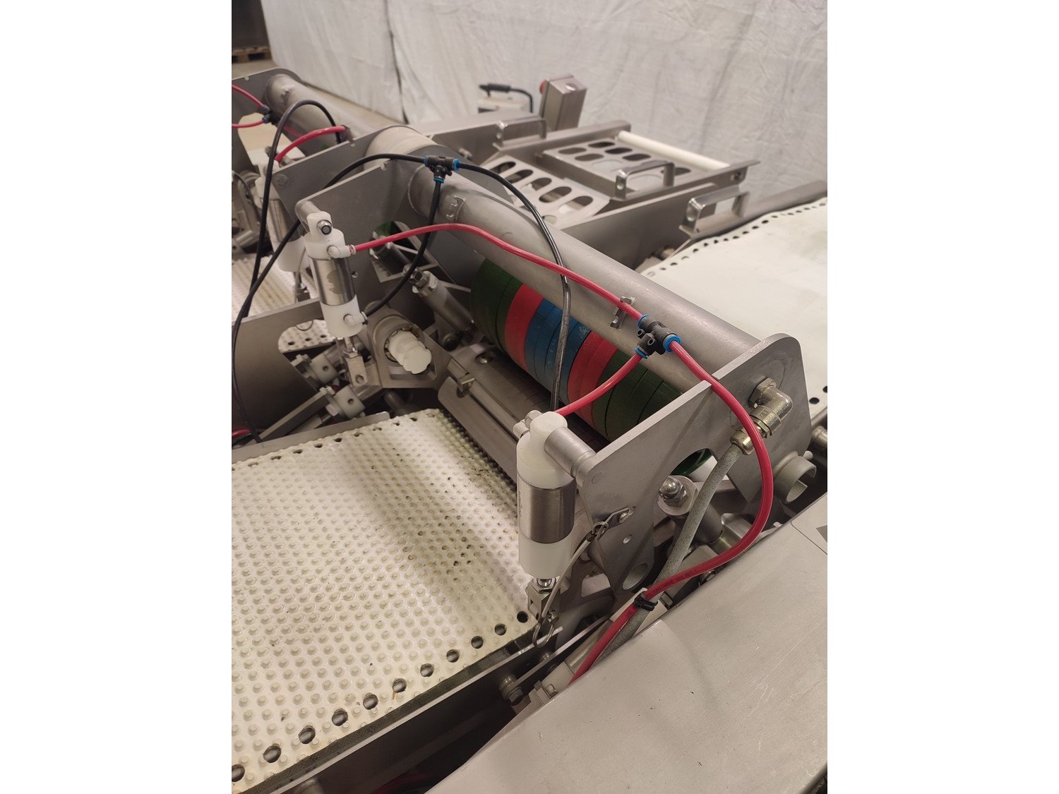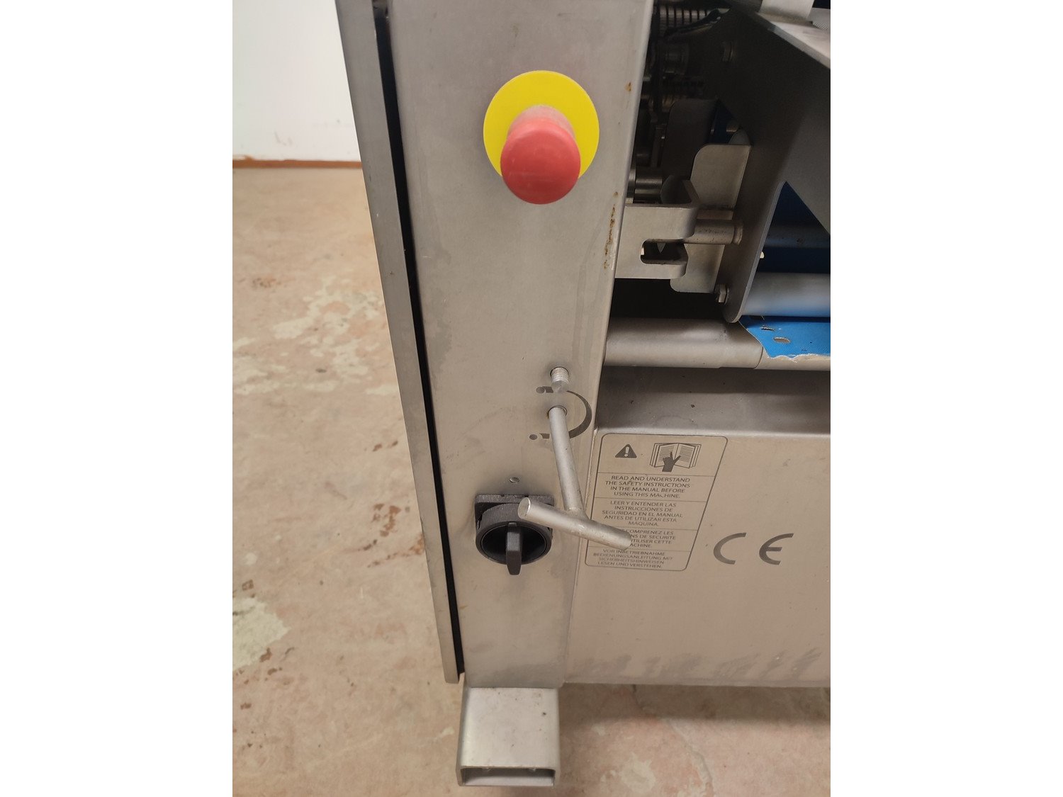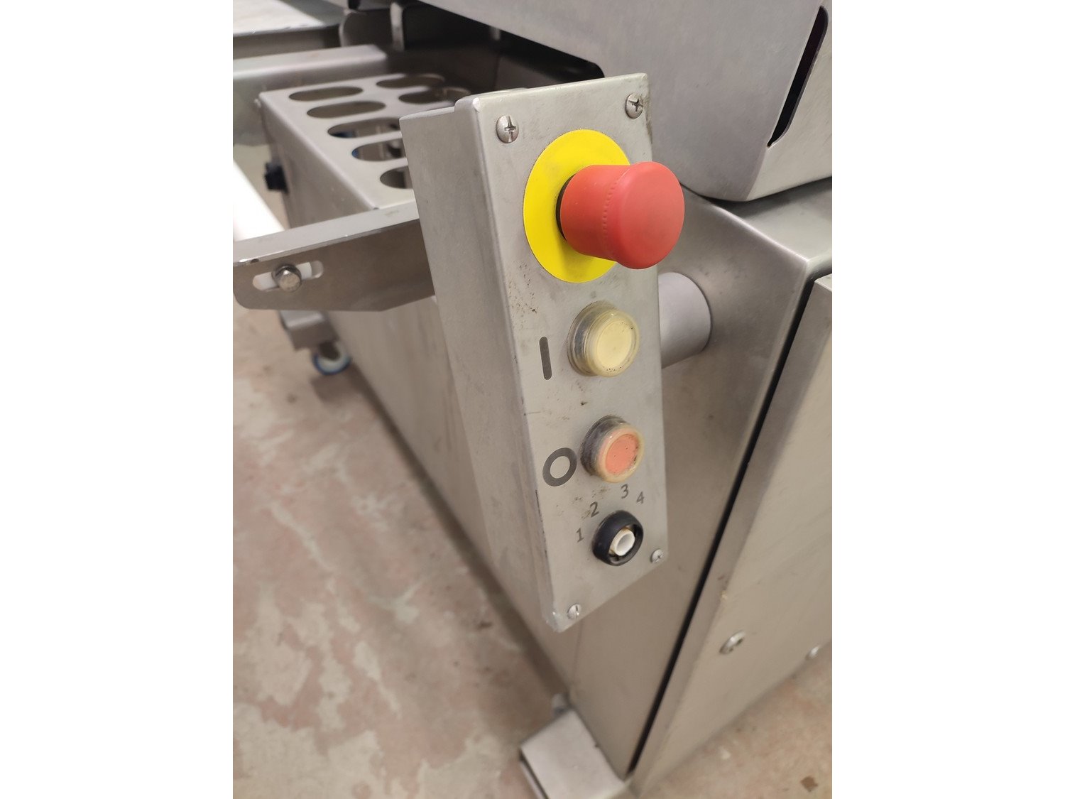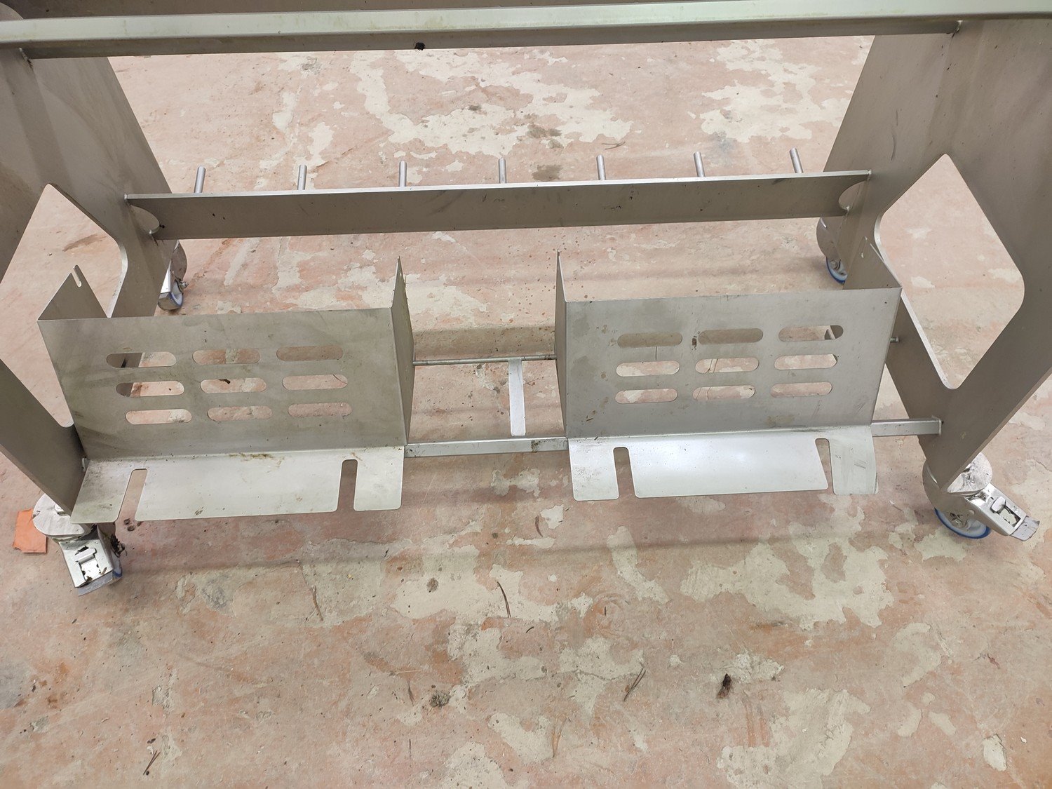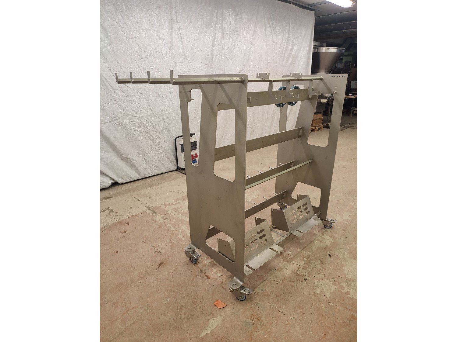 Marel mobile double skinning machine for fish, model: MS1710, type: 9830844AA, machine number: 10392514, year of construction: 2016, 400 V, 3 Ph, 50 Hz, 5 A, plastic belt, belt width: 355 mm, working width: (2x) 365 mm, skinning machine dimensions: 1430 mm x 1740 mm x 1260 mm. Including s/s trolley, dimensions: 1700 mm x 600 mm x 1420 mm. Missing belt.