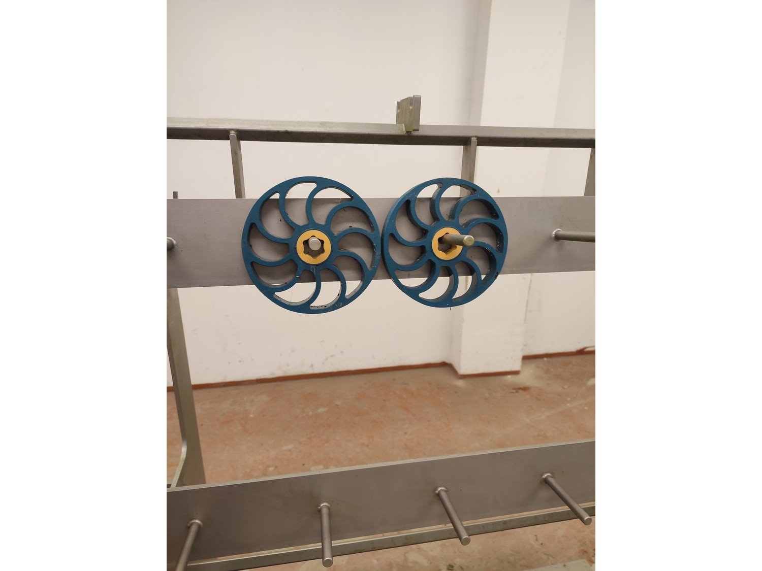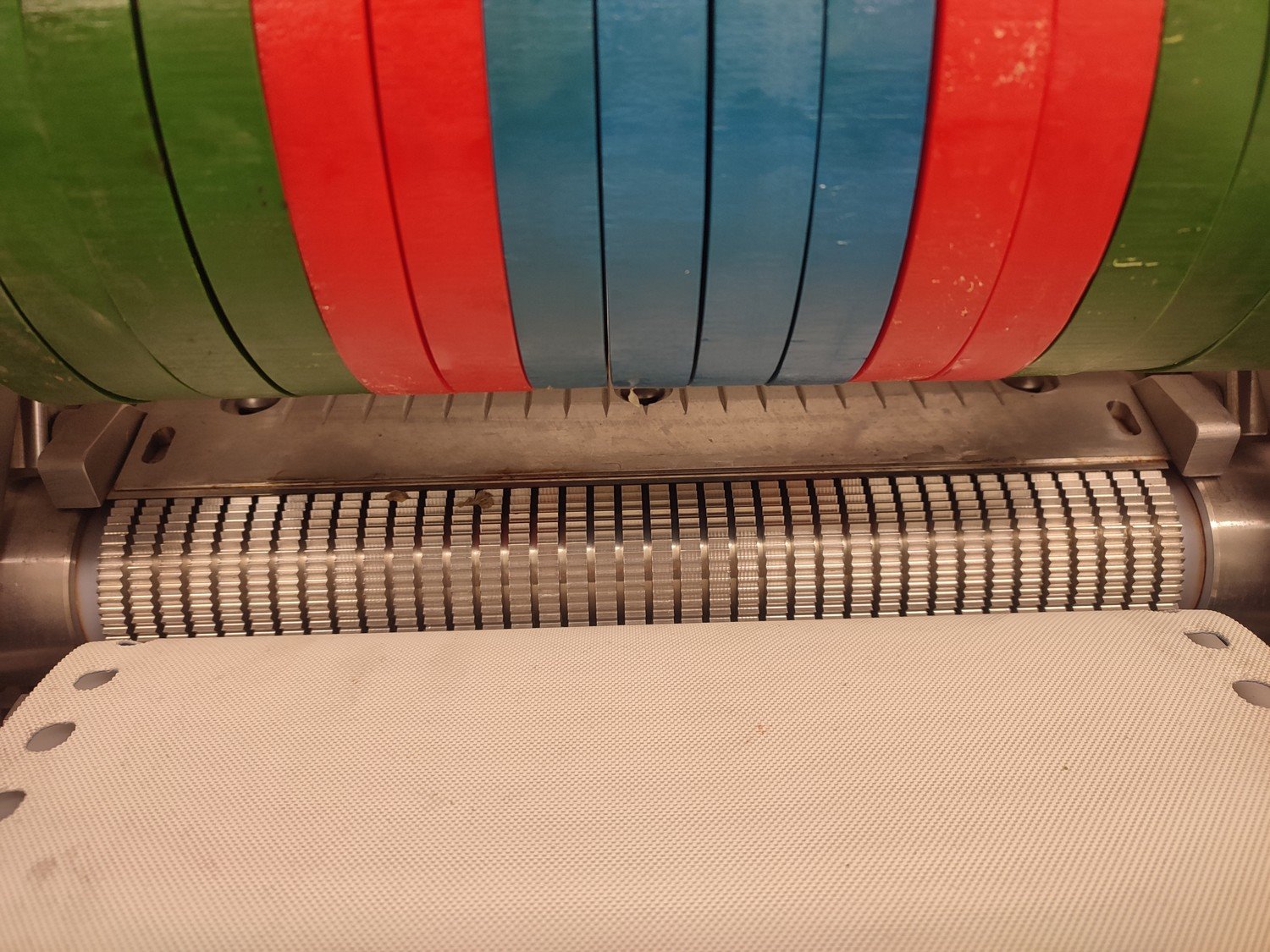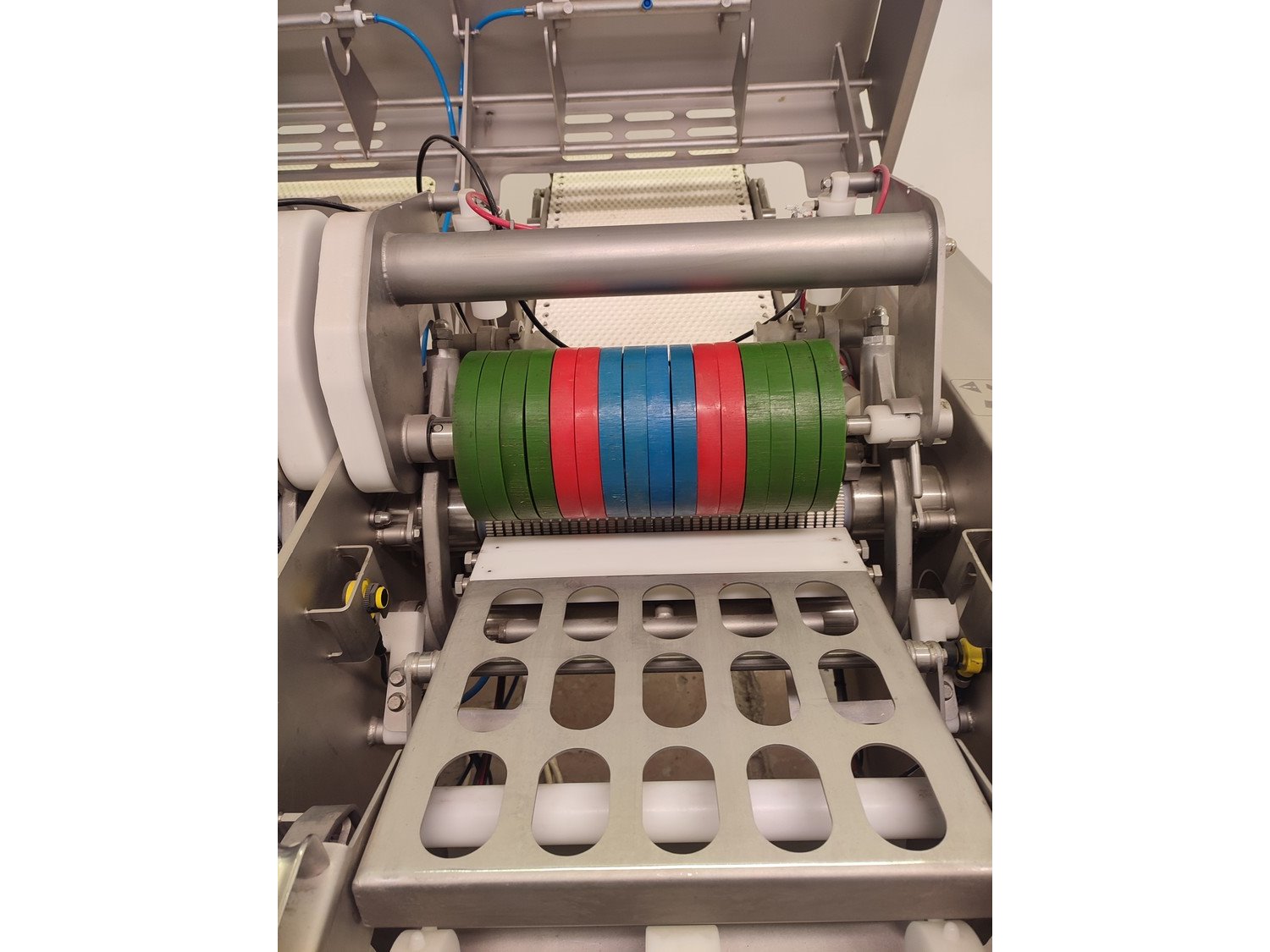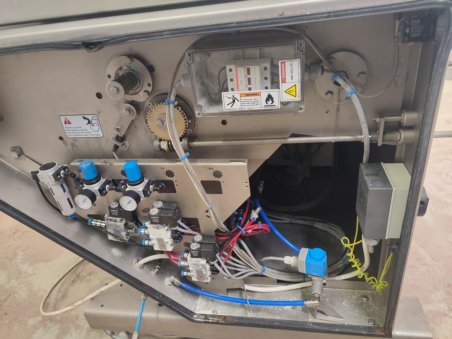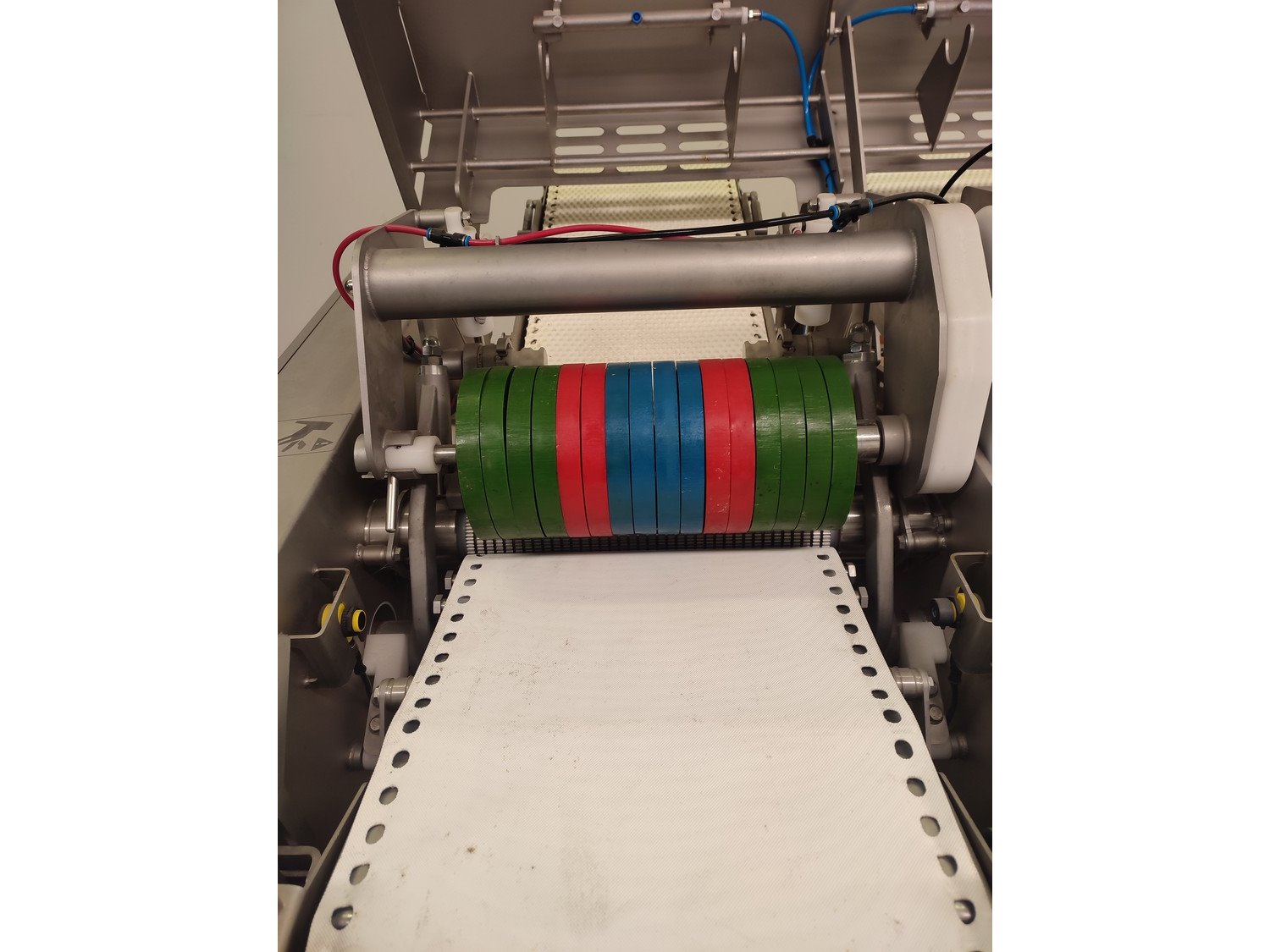 Marel mobile double skinning machine for fish, model: MS1710, type: 9830844AA, machine number: 10392514, year of construction: 2016, 400 V, 3 Ph, 50 Hz, 5 A, plastic belt, belt width: 355 mm, working width: (2x) 365 mm, skinning machine dimensions: 1430 mm x 1740 mm x 1260 mm. Including s/s trolley, dimensions: 1700 mm x 600 mm x 1420 mm. Missing belt.