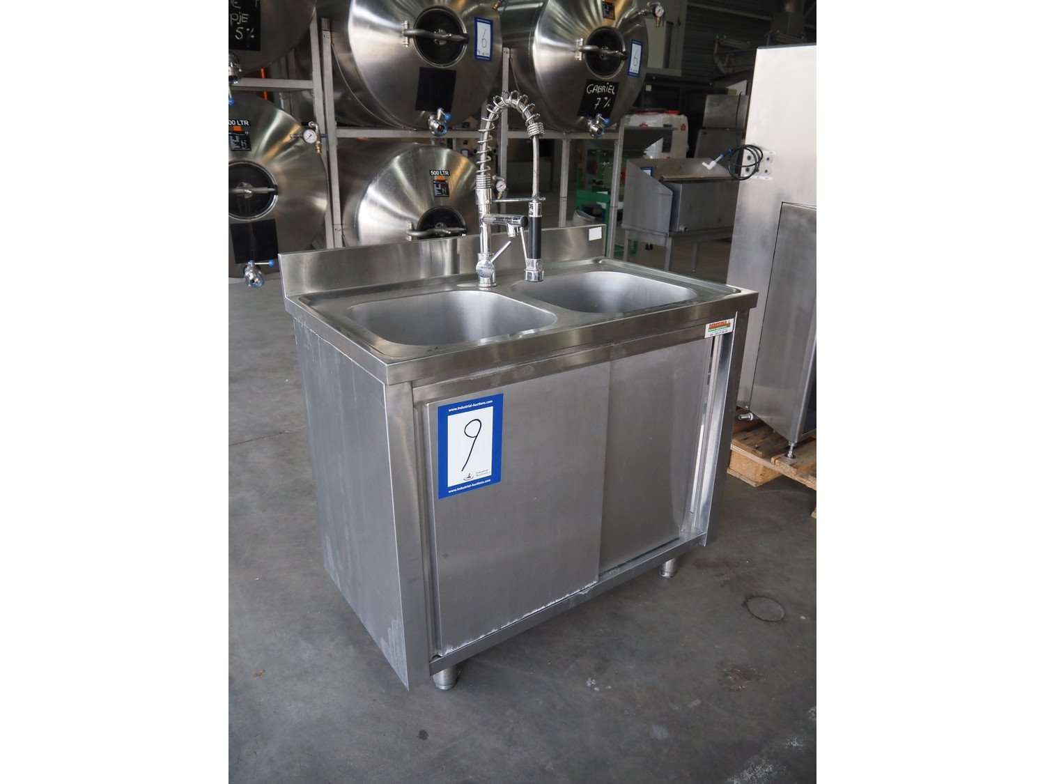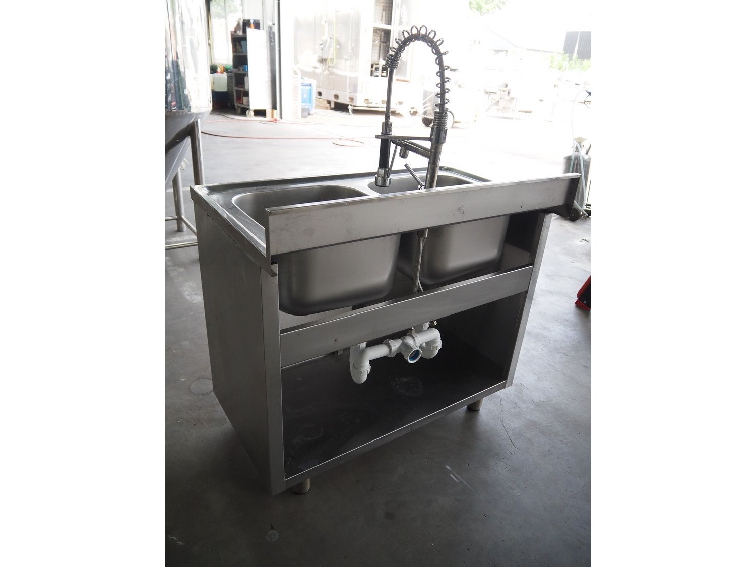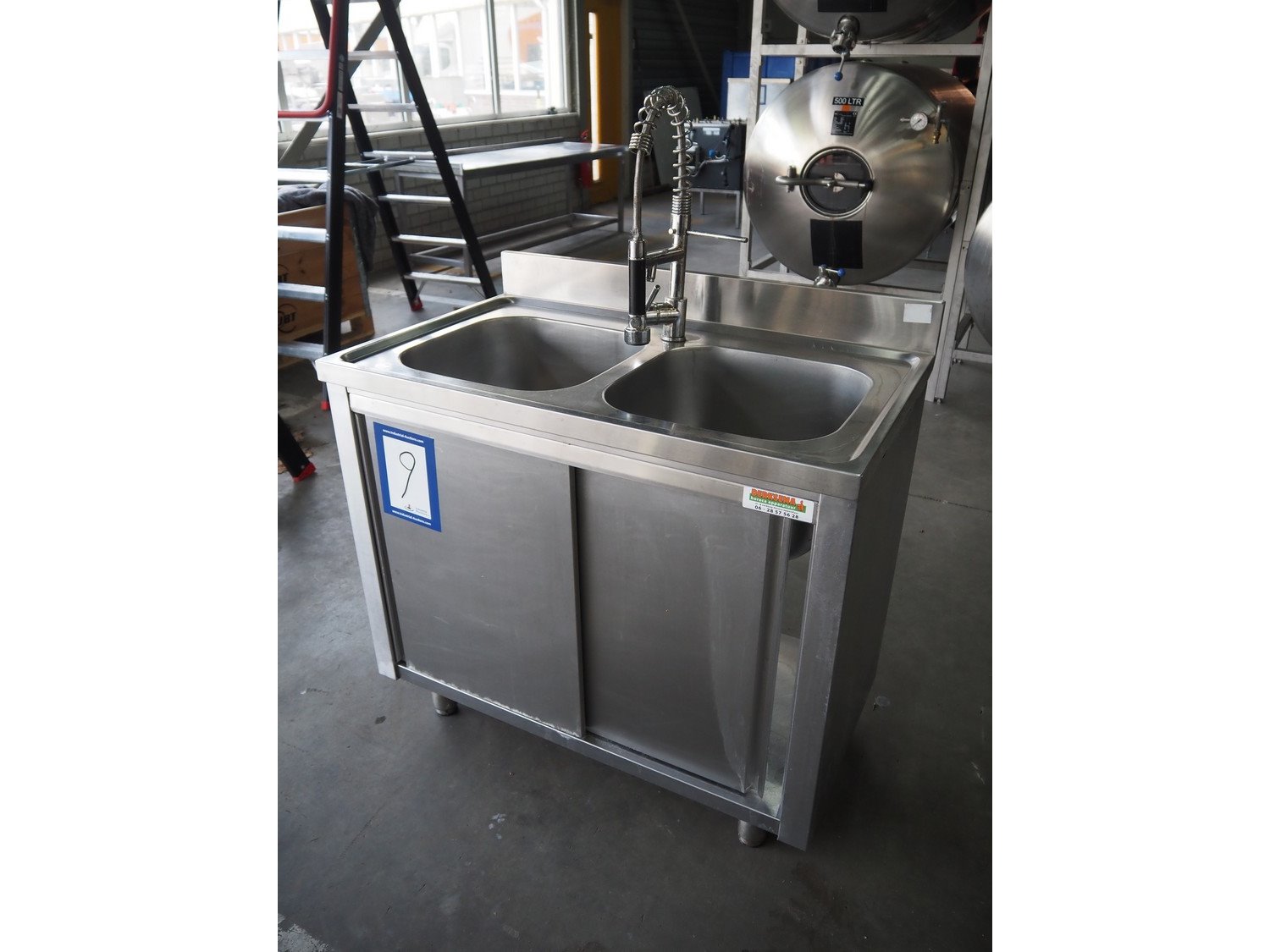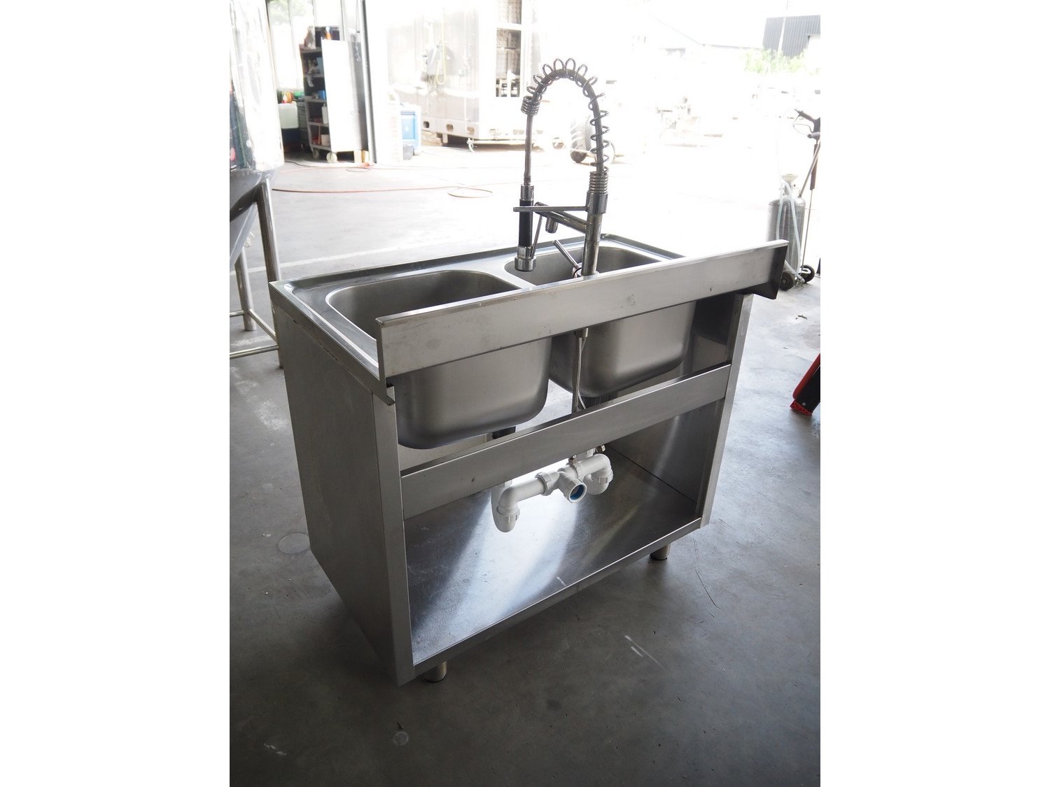 S/s cabinet with 2 sinks and pre-rinse faucet, dimensions: 1000 mm x 600 mm x 1300 mm.
