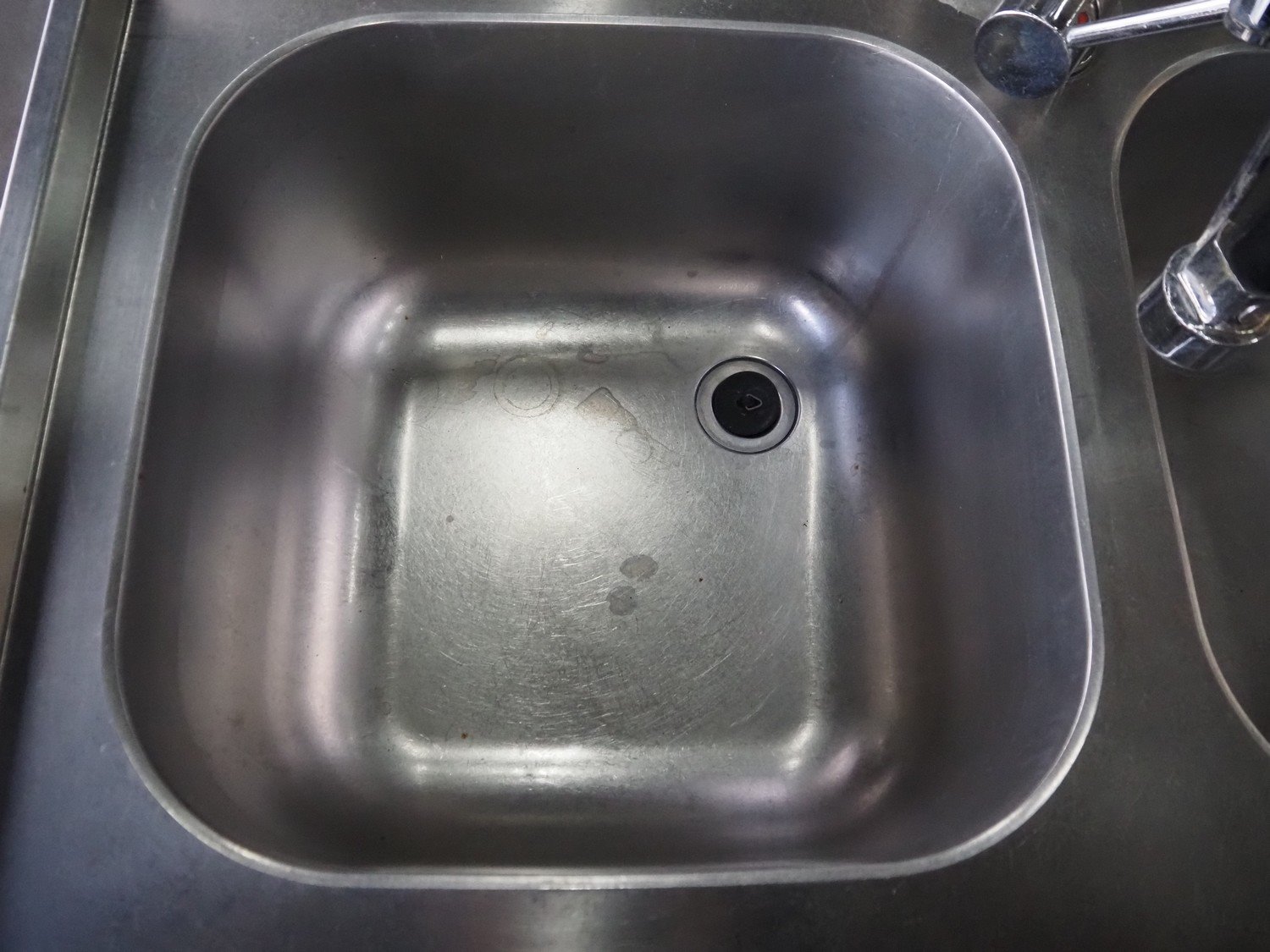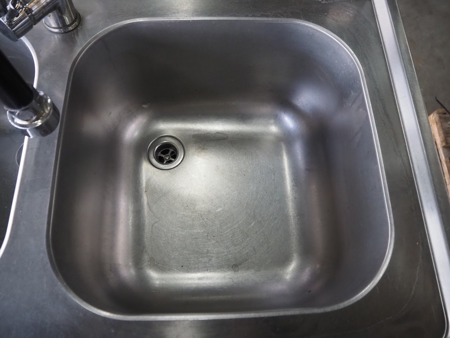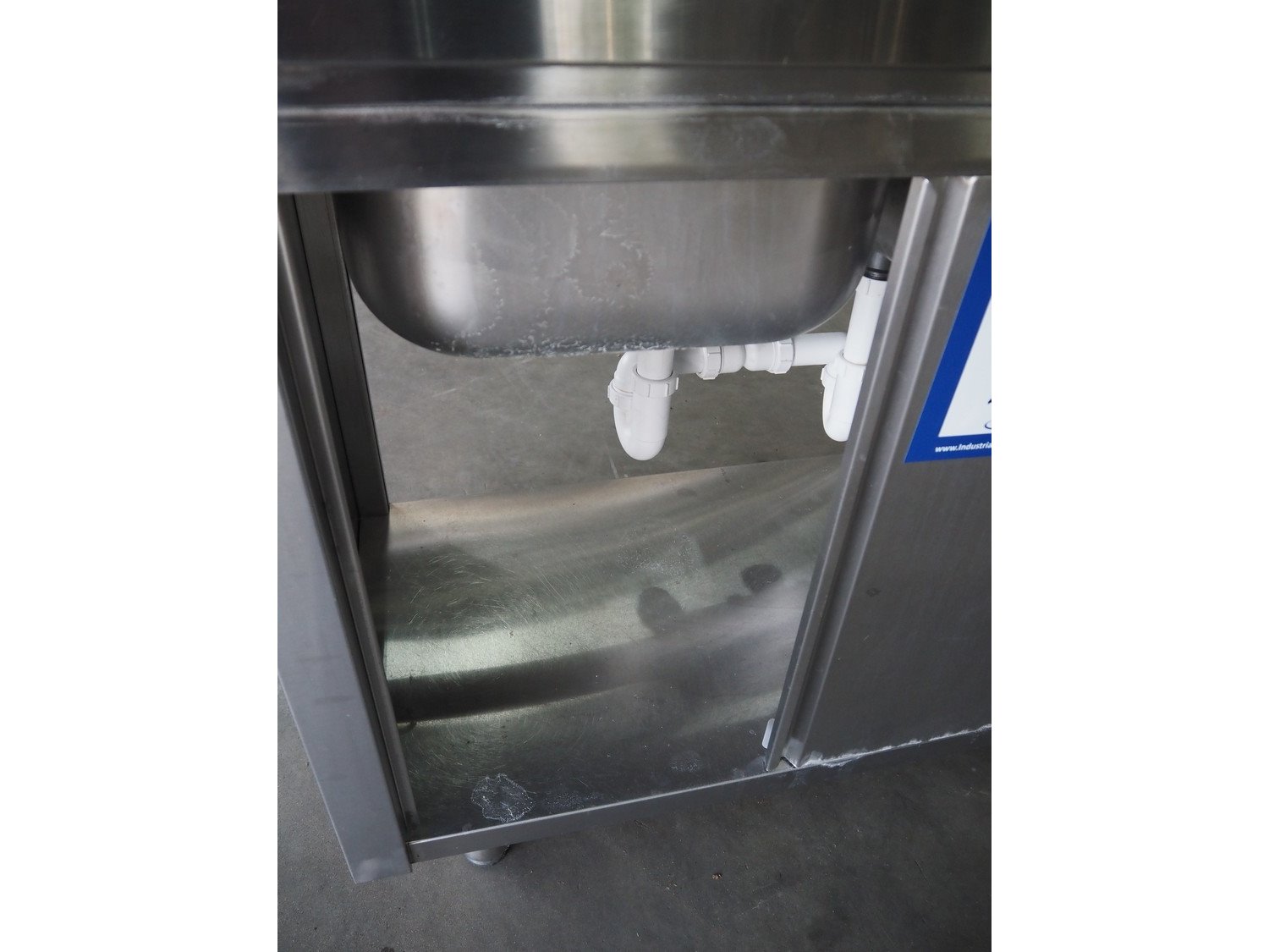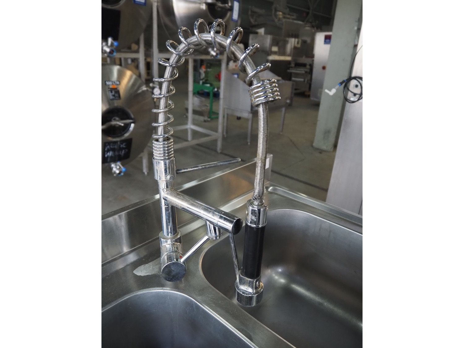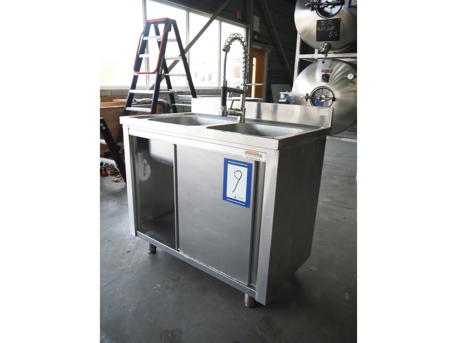 S/s cabinet with 2 sinks and pre-rinse faucet, dimensions: 1000 mm x 600 mm x 1300 mm.