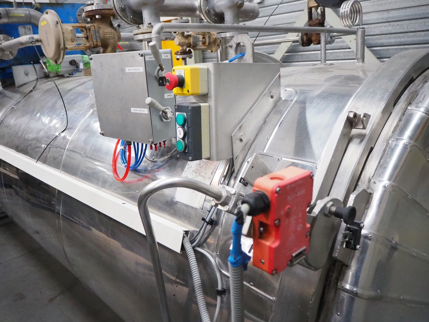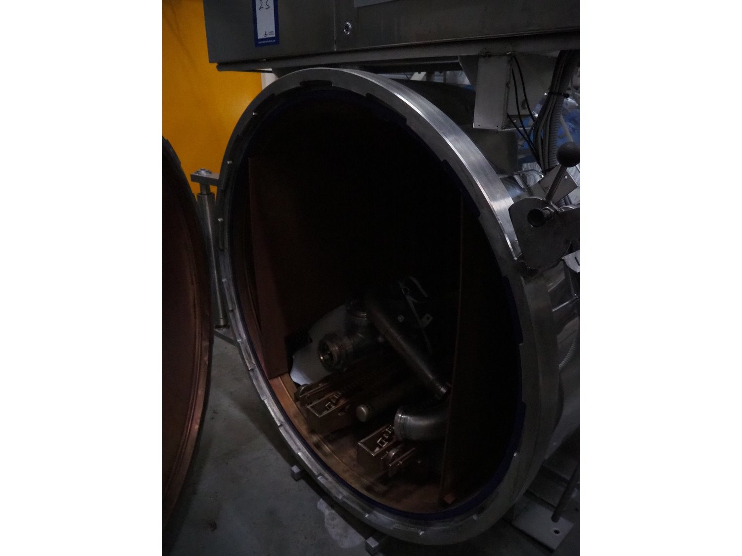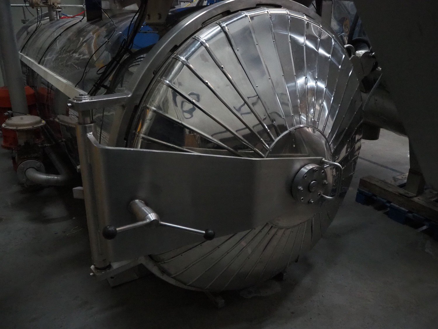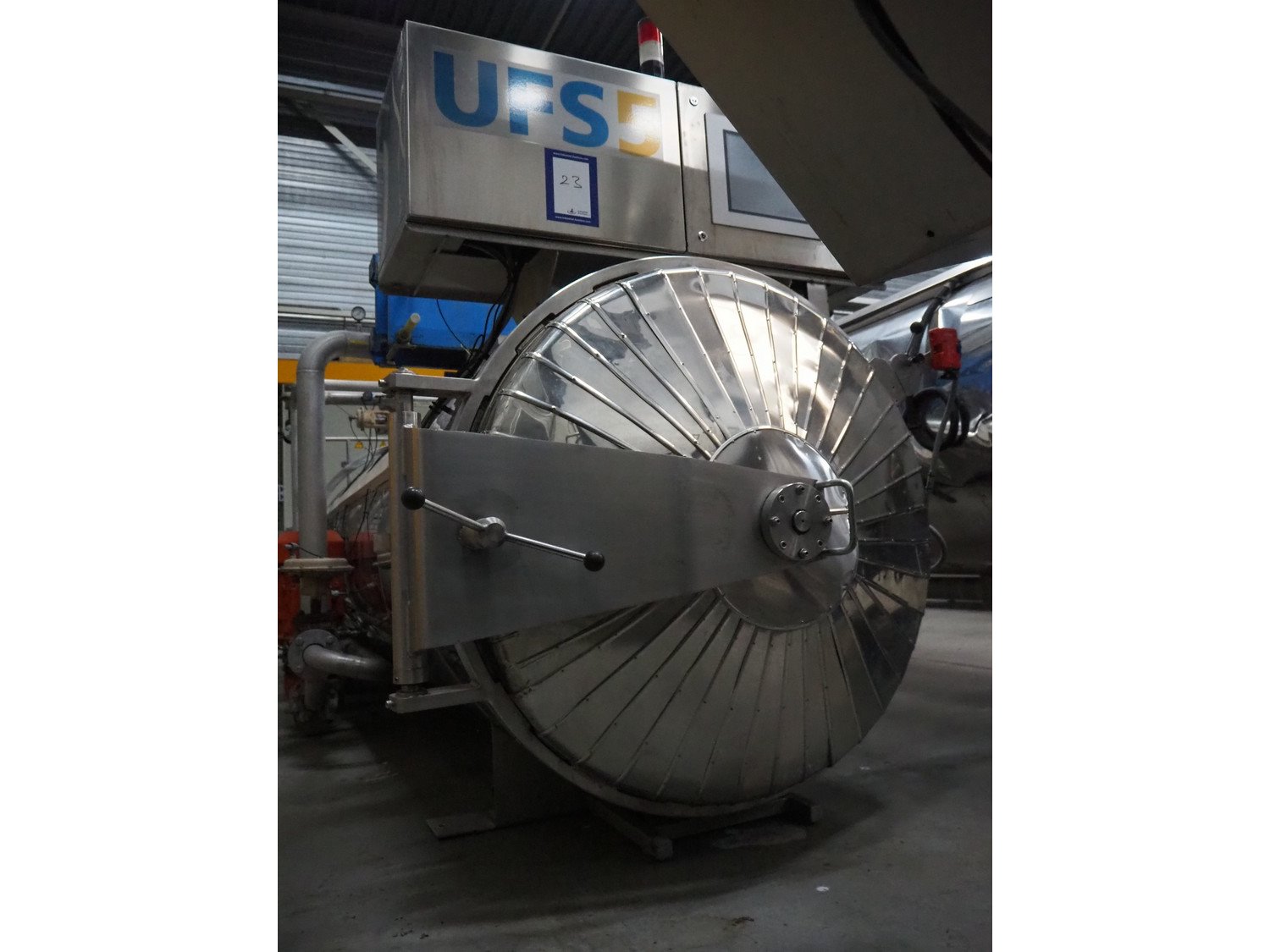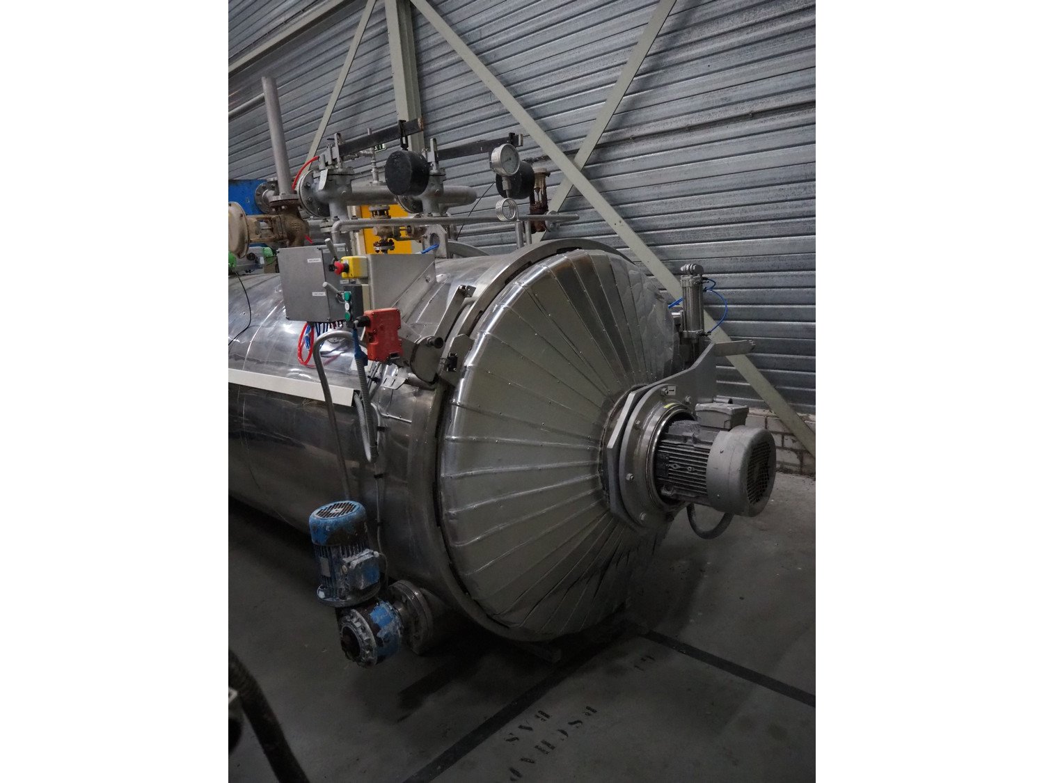 J. Lagarde autoclave, year of construction: 1994, diameter: 1300 mm, content: 6450 litres, 3 x 400 V, 50 Hz, 25.5 kW, heating: steam, working pressure: 5 bar, working temperature: 158 °C, Vicarb heat exchanger, type: V28-5054, automatic transport inside autoclave, 2-doors, total dimensions: 5800 mm x 1900 mm x 2400 mm.