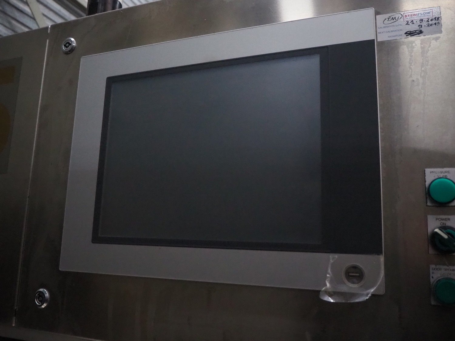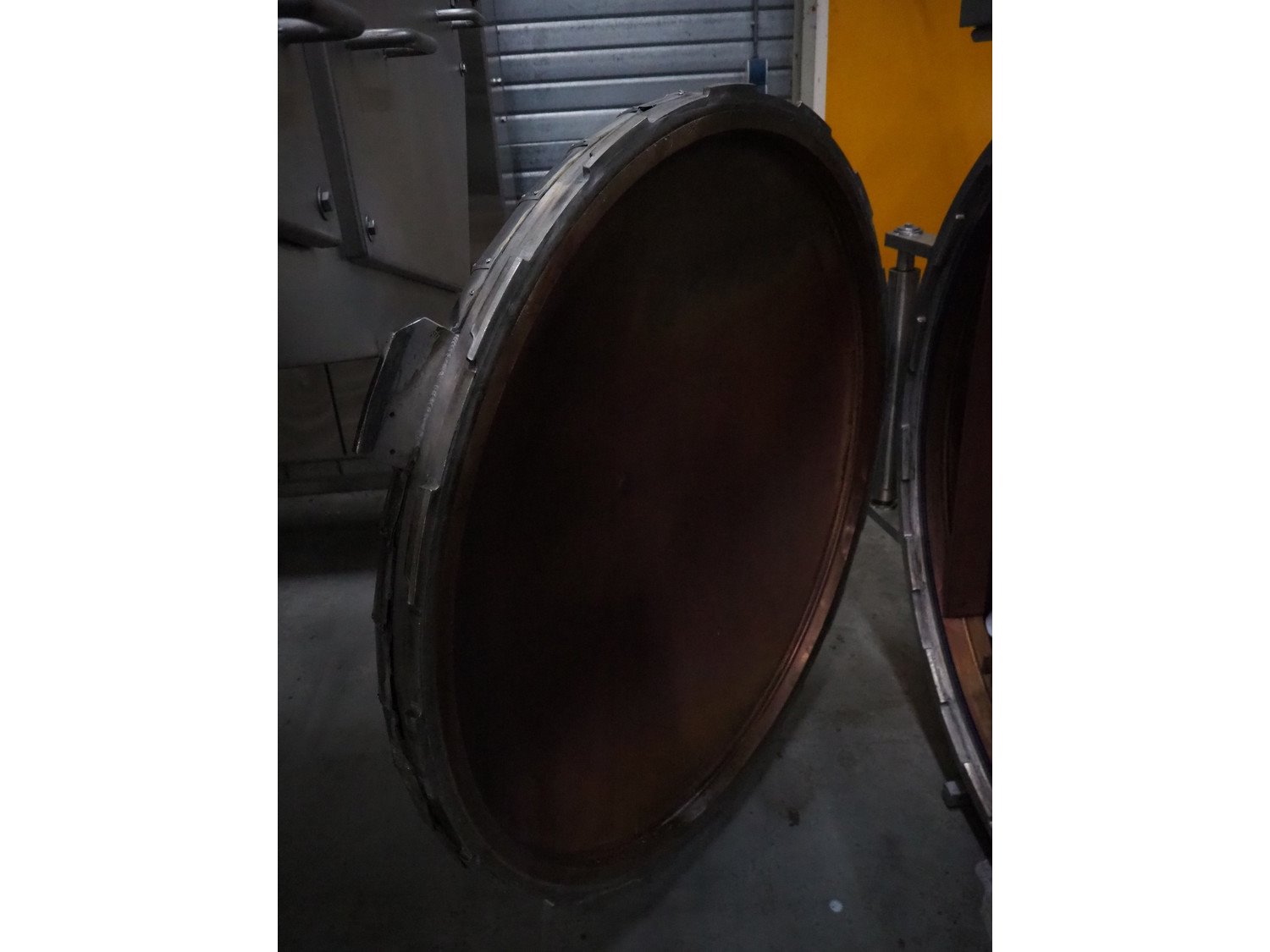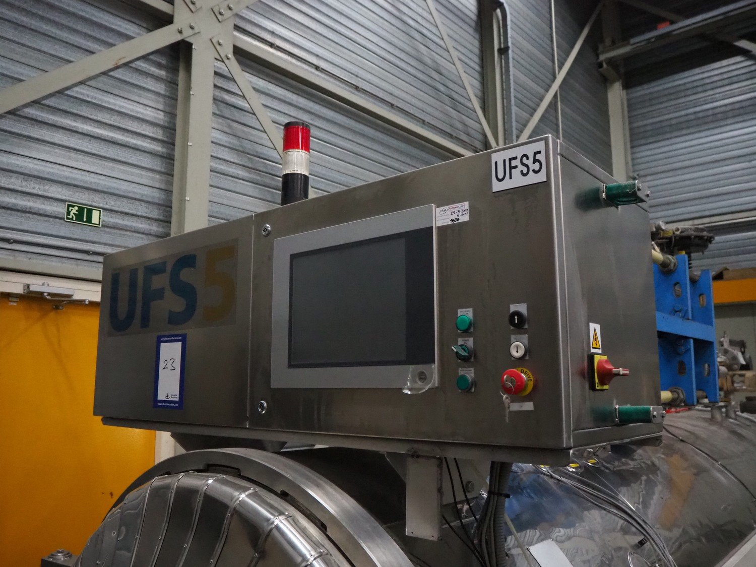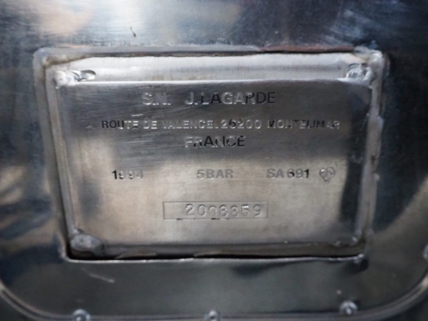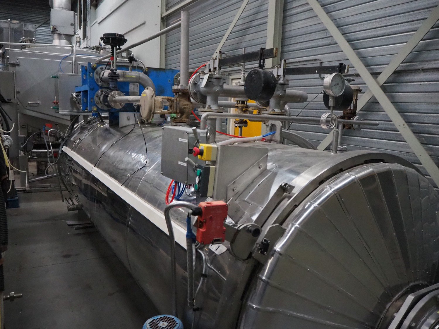 J. Lagarde autoclave, year of construction: 1994, diameter: 1300 mm, content: 6450 litres, 3 x 400 V, 50 Hz, 25.5 kW, heating: steam, working pressure: 5 bar, working temperature: 158 °C, Vicarb heat exchanger, type: V28-5054, automatic transport inside autoclave, 2-doors, total dimensions: 5800 mm x 1900 mm x 2400 mm.