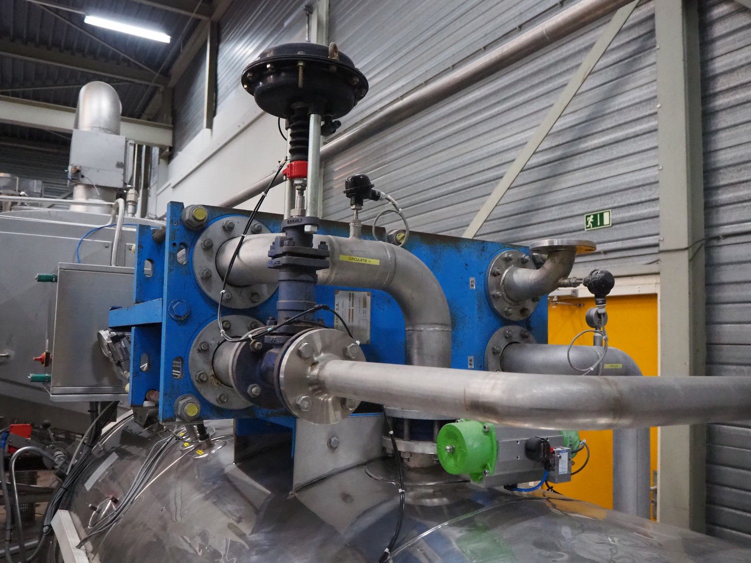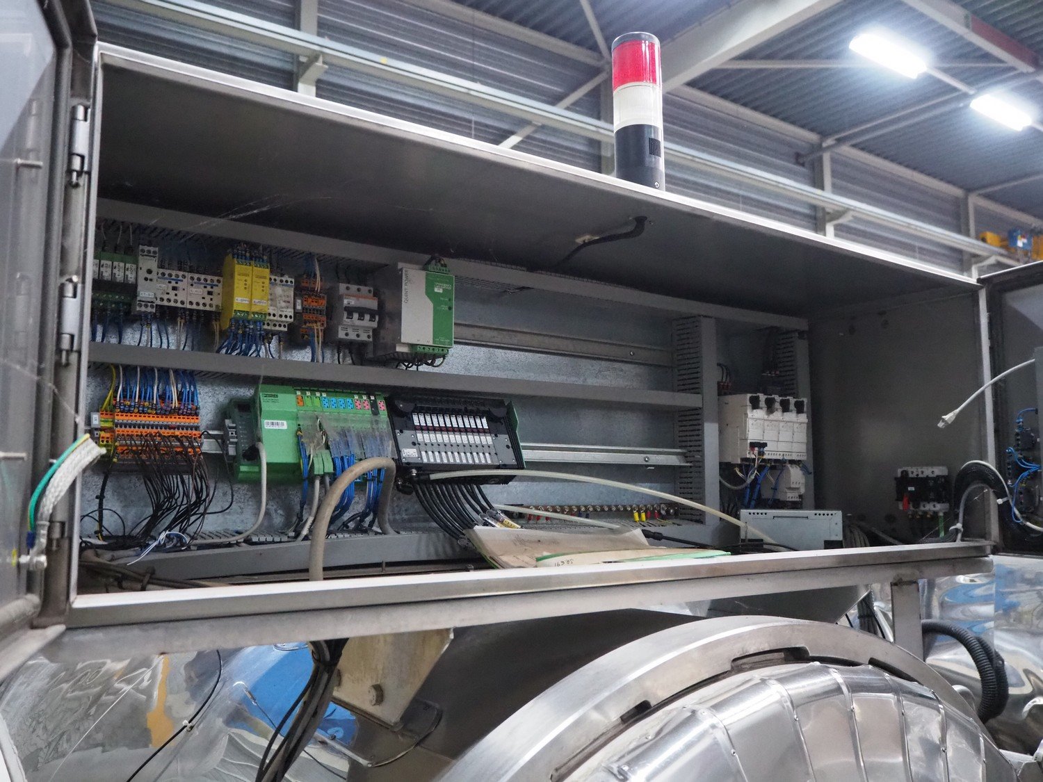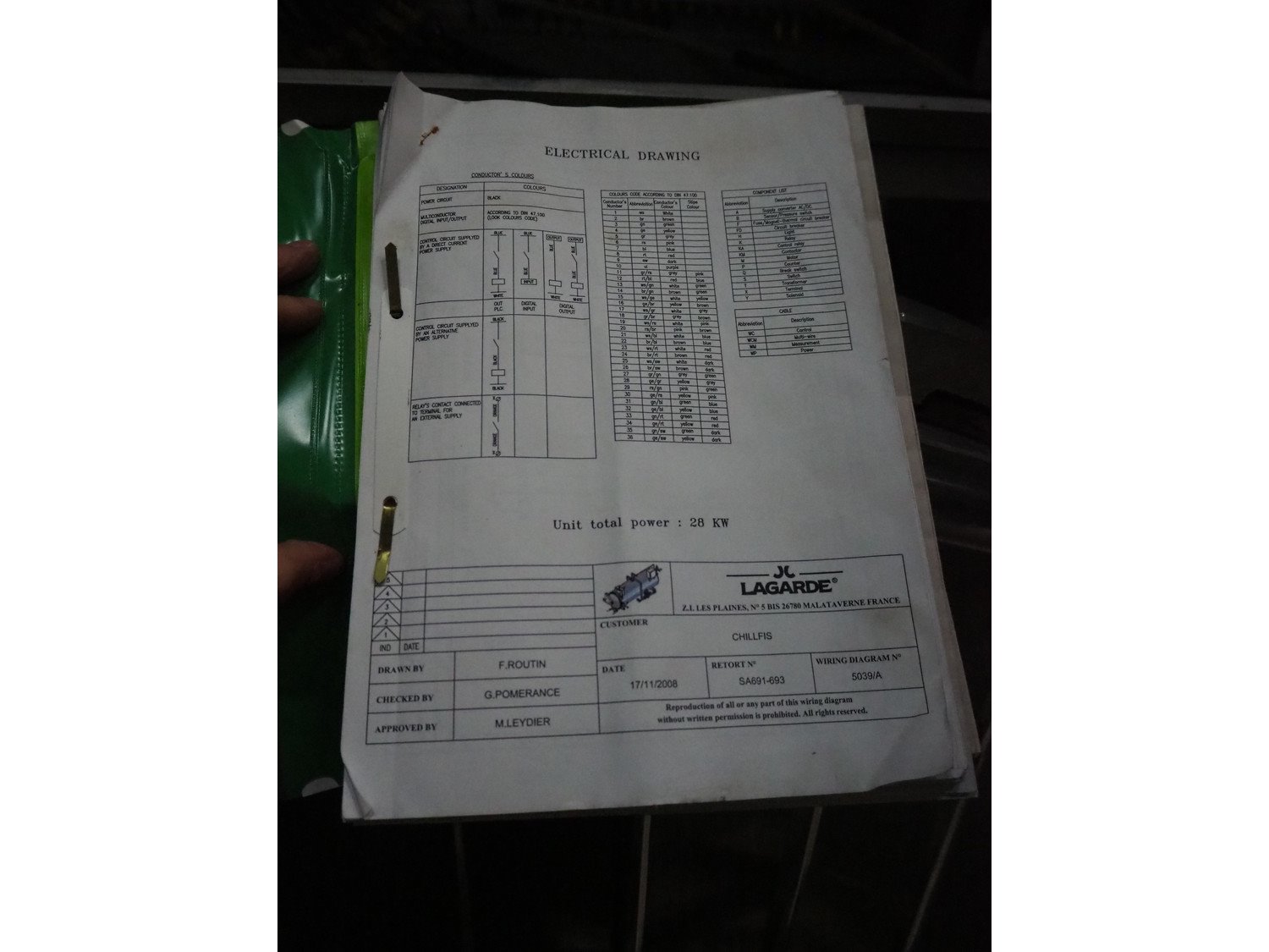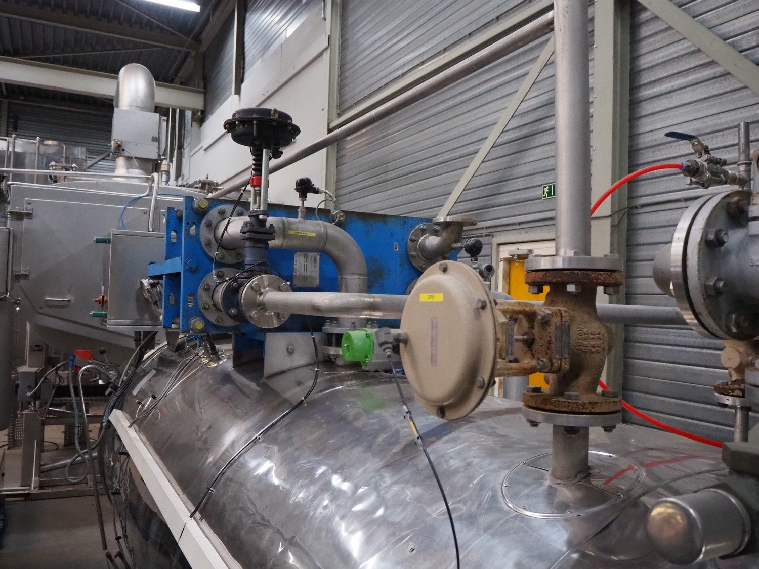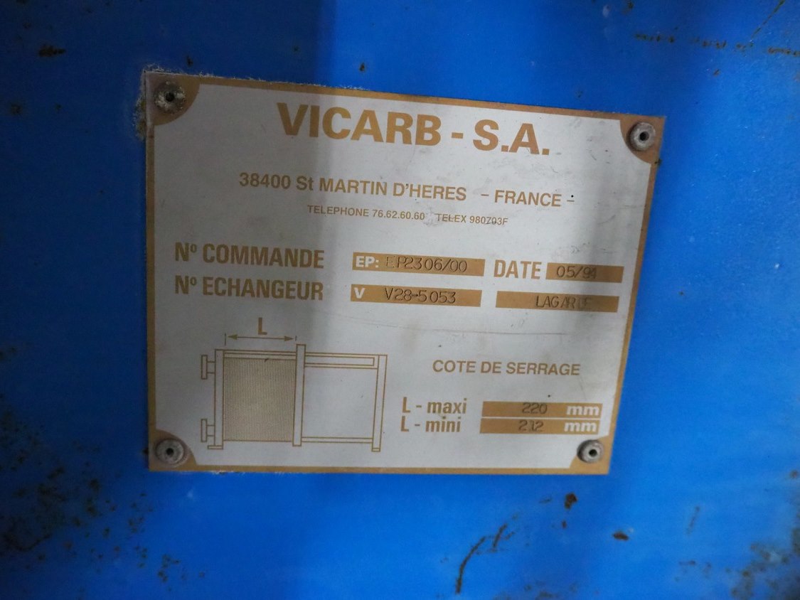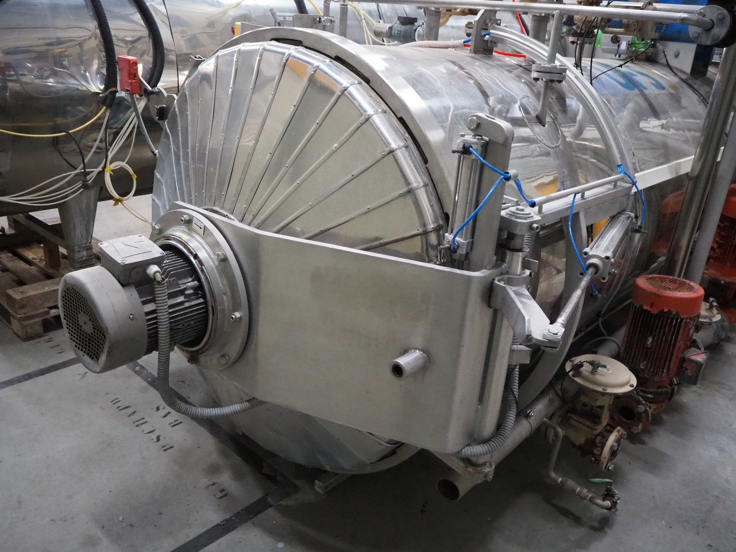 J. Lagarde autoclave, year of construction: 1994, diameter: 1300 mm, content: 6450 litres, 3 x 400 V, 50 Hz, 25.5 kW, heating: steam, working pressure: 5 bar, working temperature: 158 °C, Vicarb heat exchanger, type: V28-5054, automatic transport inside autoclave, 2-doors, total dimensions: 5800 mm x 1900 mm x 2400 mm.