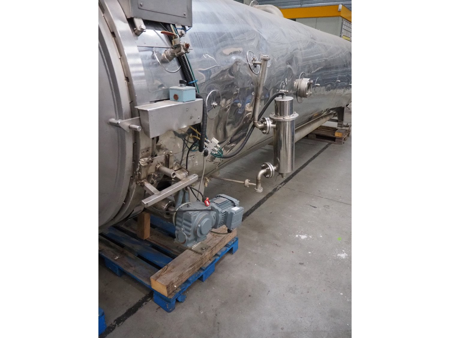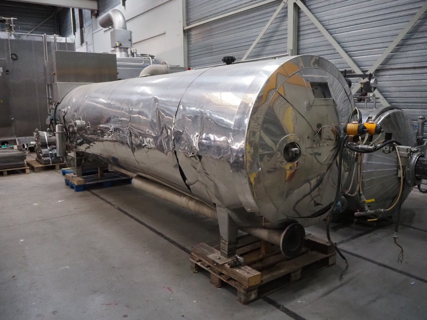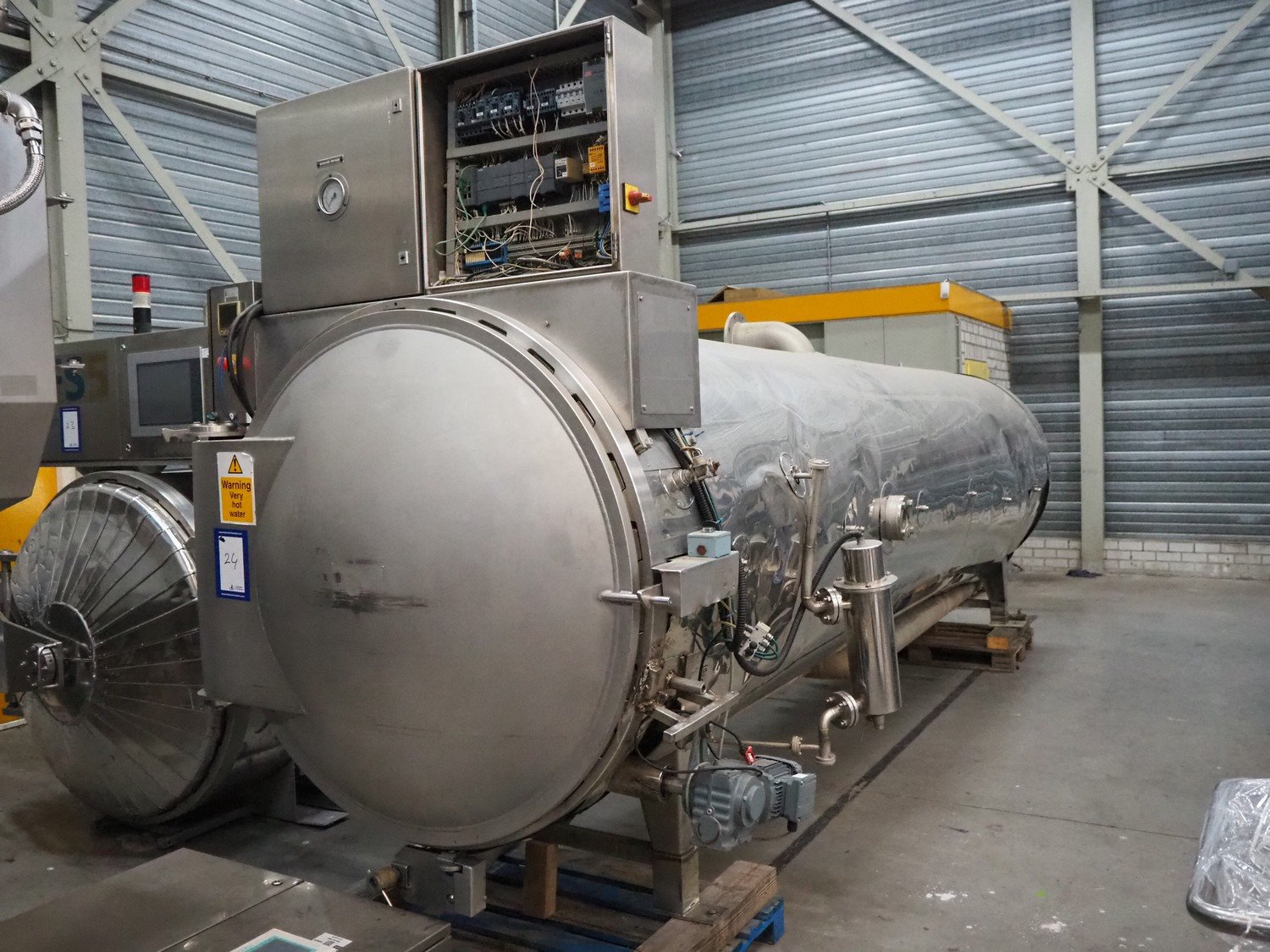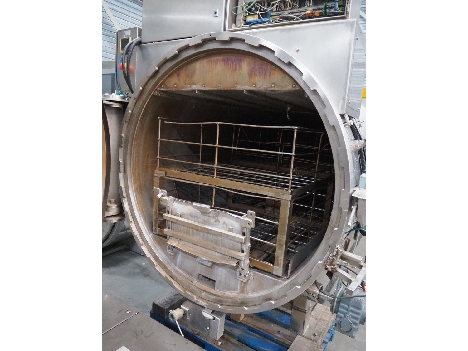 Longclose autoclave, machine number: 13966, year of construction: 5-6-1995, inside diameter autoclave: 1280 mm, test pressure: 8.7 bar, design pressure: 5.5 bar, design temperature: 140˚C, dimensions: 6500 mm x 1750 mm x 2600 mm. Including 10 s/s autoclave racks, dimensions: (10x) 870 mm x 870 mm x 330 mm. Switch cabinet is missing cover.
