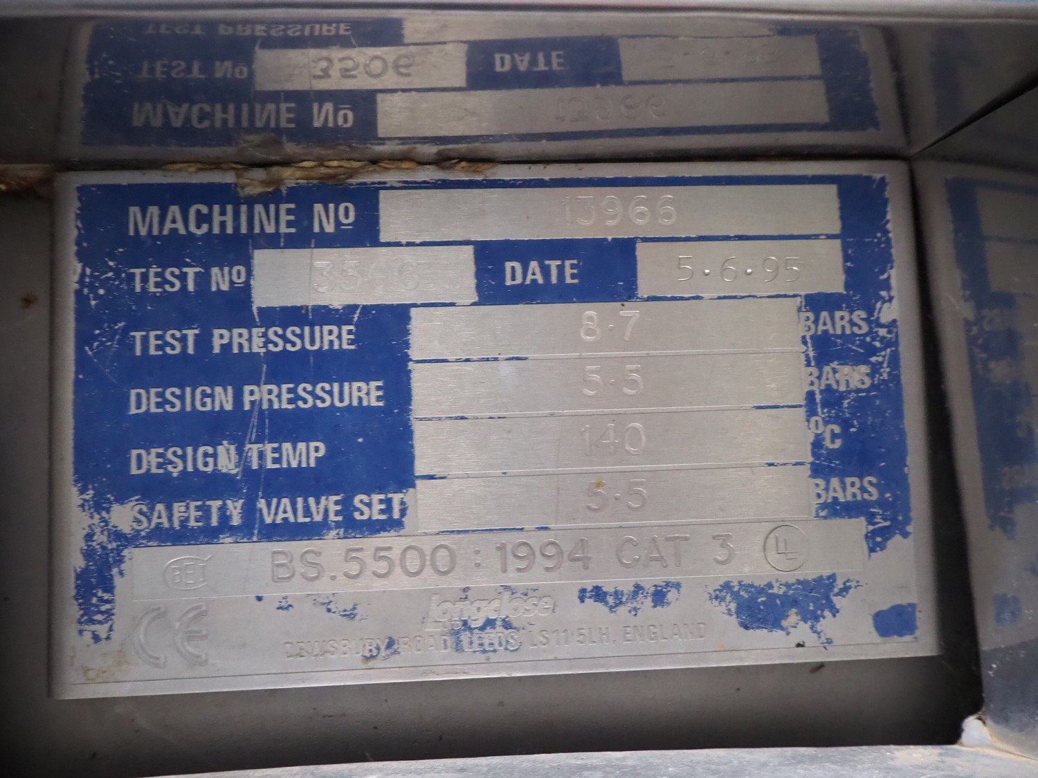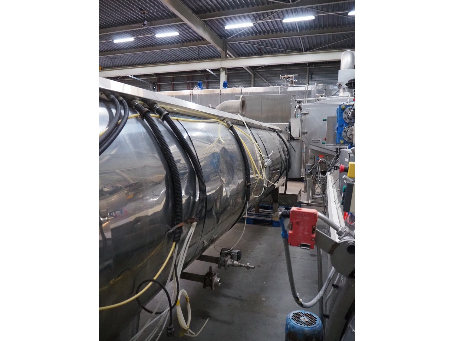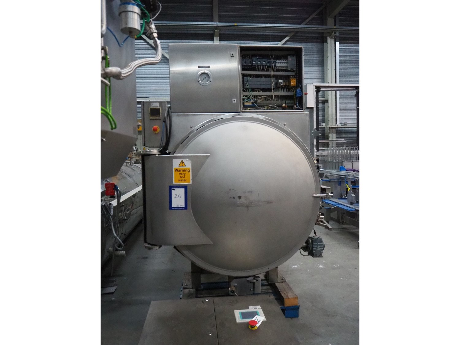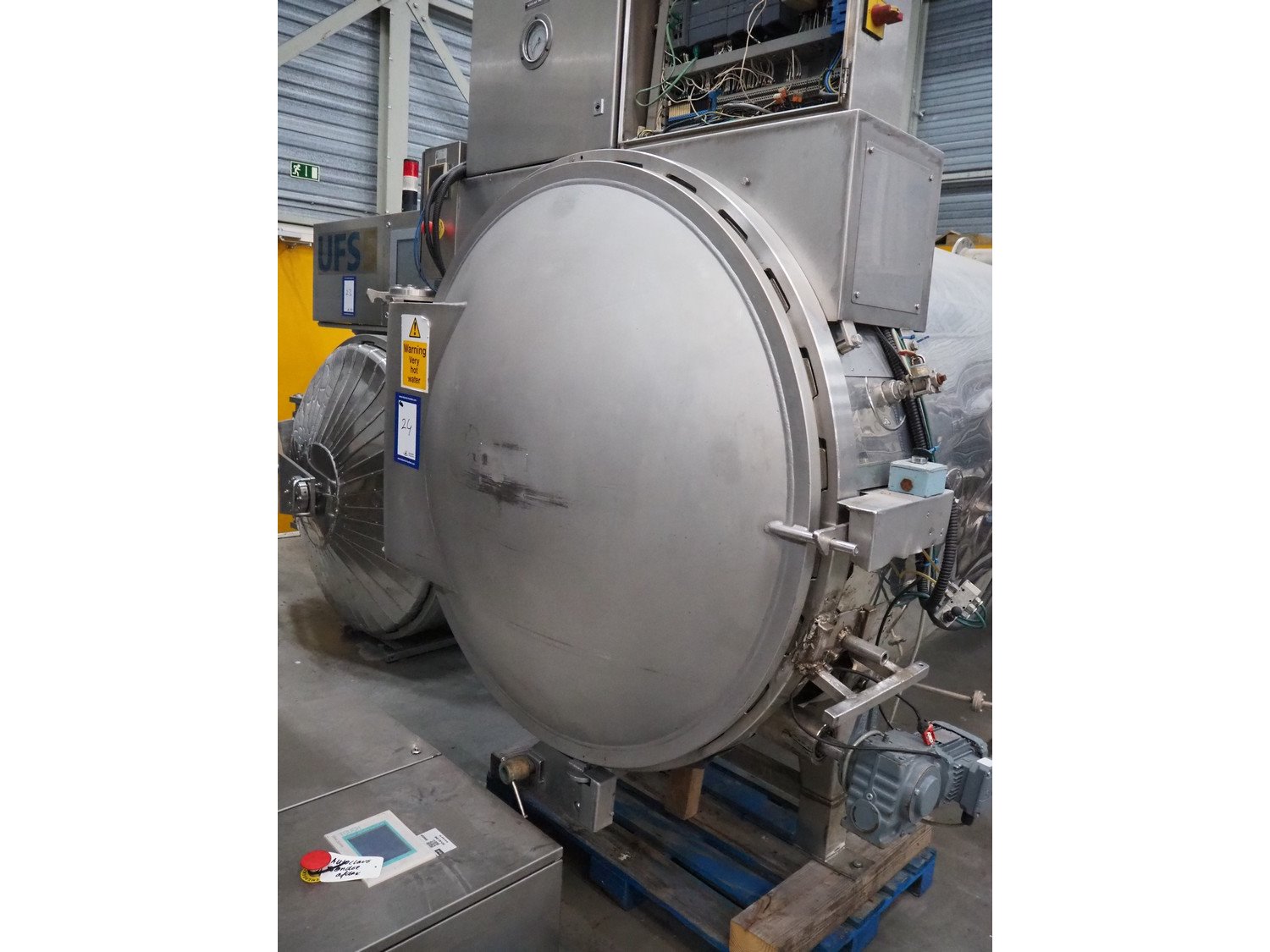 Longclose autoclave, machine number: 13966, year of construction: 5-6-1995, inside diameter autoclave: 1280 mm, test pressure: 8.7 bar, design pressure: 5.5 bar, design temperature: 140˚C, dimensions: 6500 mm x 1750 mm x 2600 mm. Including 10 s/s autoclave racks, dimensions: (10x) 870 mm x 870 mm x 330 mm. Switch cabinet is missing cover.