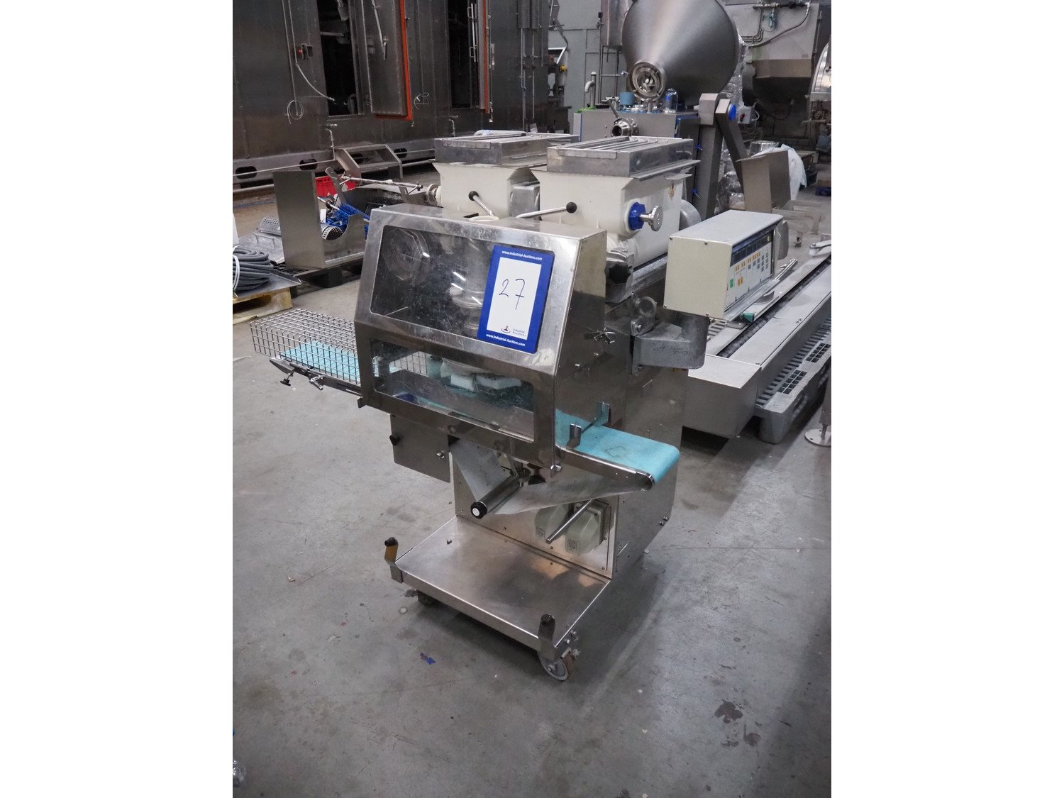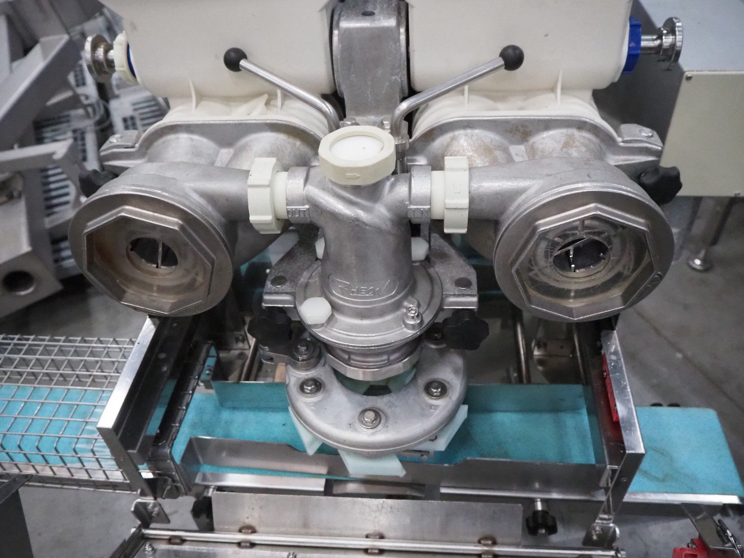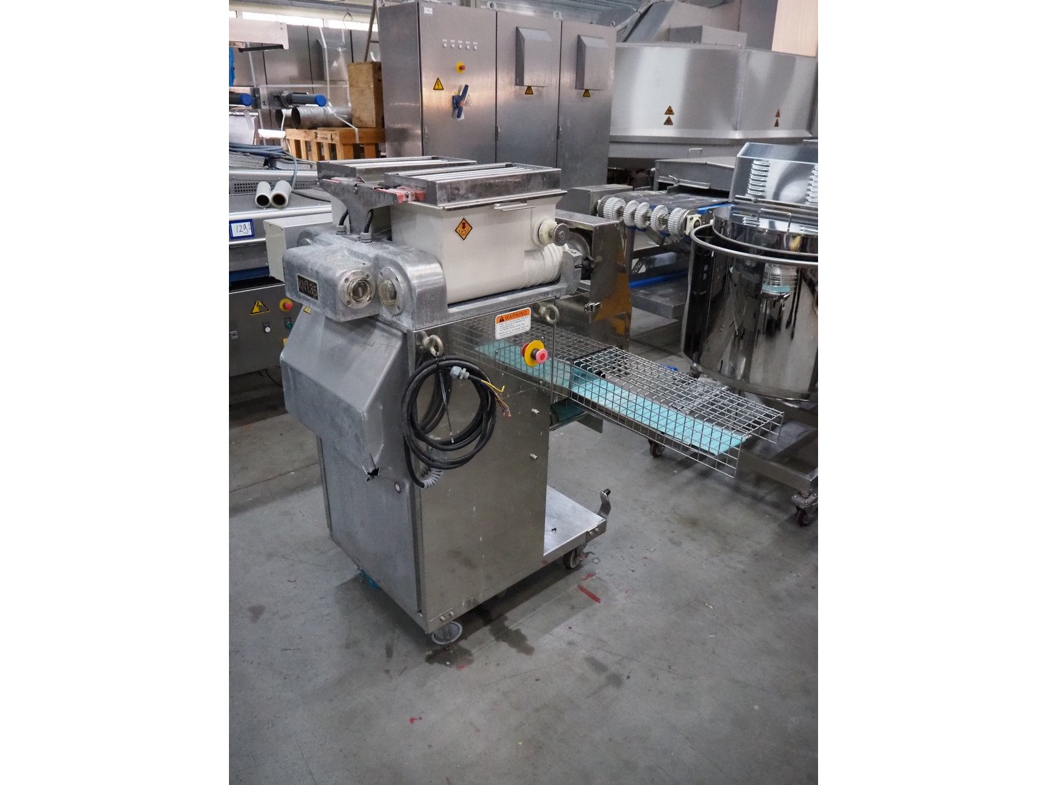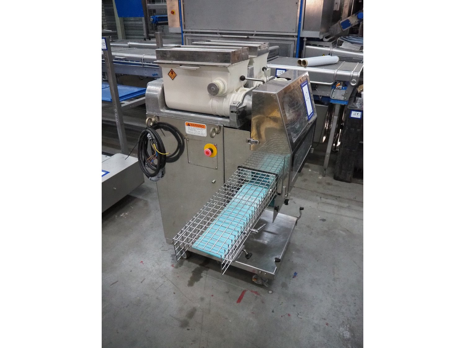 Rheon mobile encrusting machine, model: KN135, serial number: 096, year of construction: 2003, 380 V, 3 Ph, 50/60 Hz, 3.7 A, 1.09 kW, plastic belt, belt width: 130 mm, total dimensions: 1400 mm x 900 mm x 1400 mm.