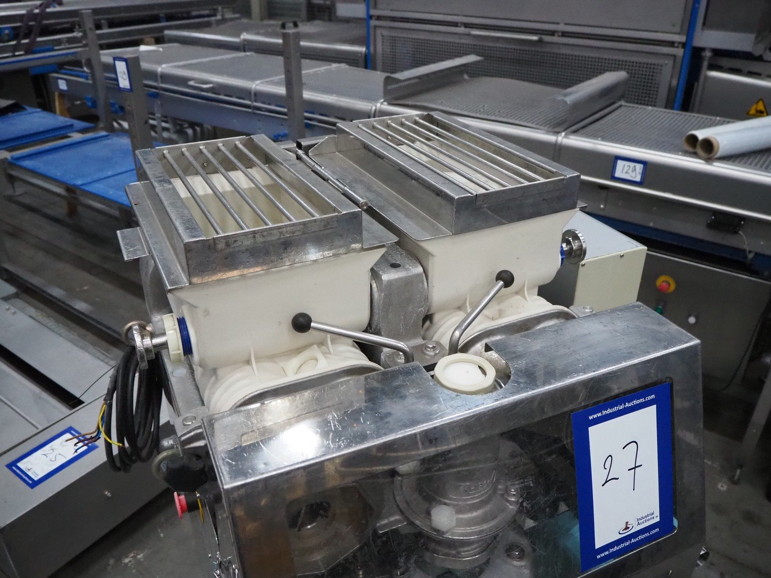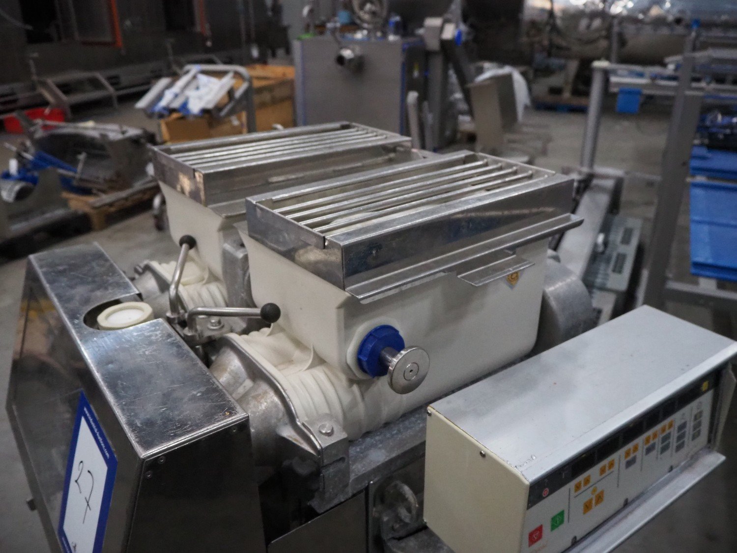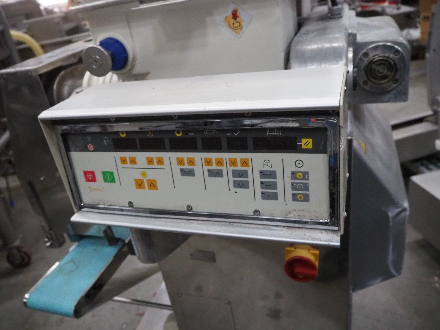Rheon mobile encrusting machine, model: KN135, serial number: 096, year of construction: 2003, 380 V, 3 Ph, 50/60 Hz, 3.7 A, 1.09 kW, plastic belt, belt width: 130 mm, total dimensions: 1400 mm x 900 mm x 1400 mm.