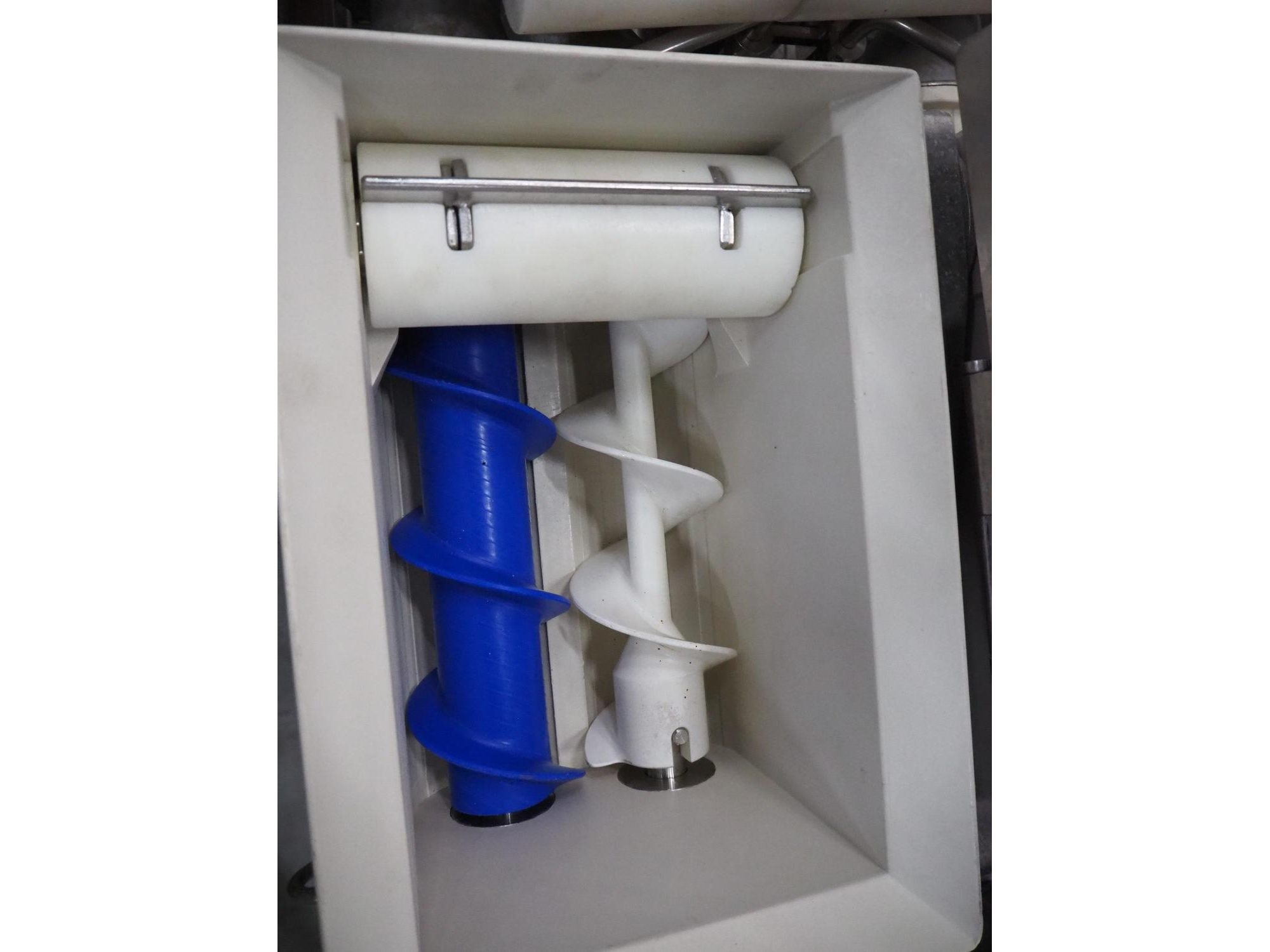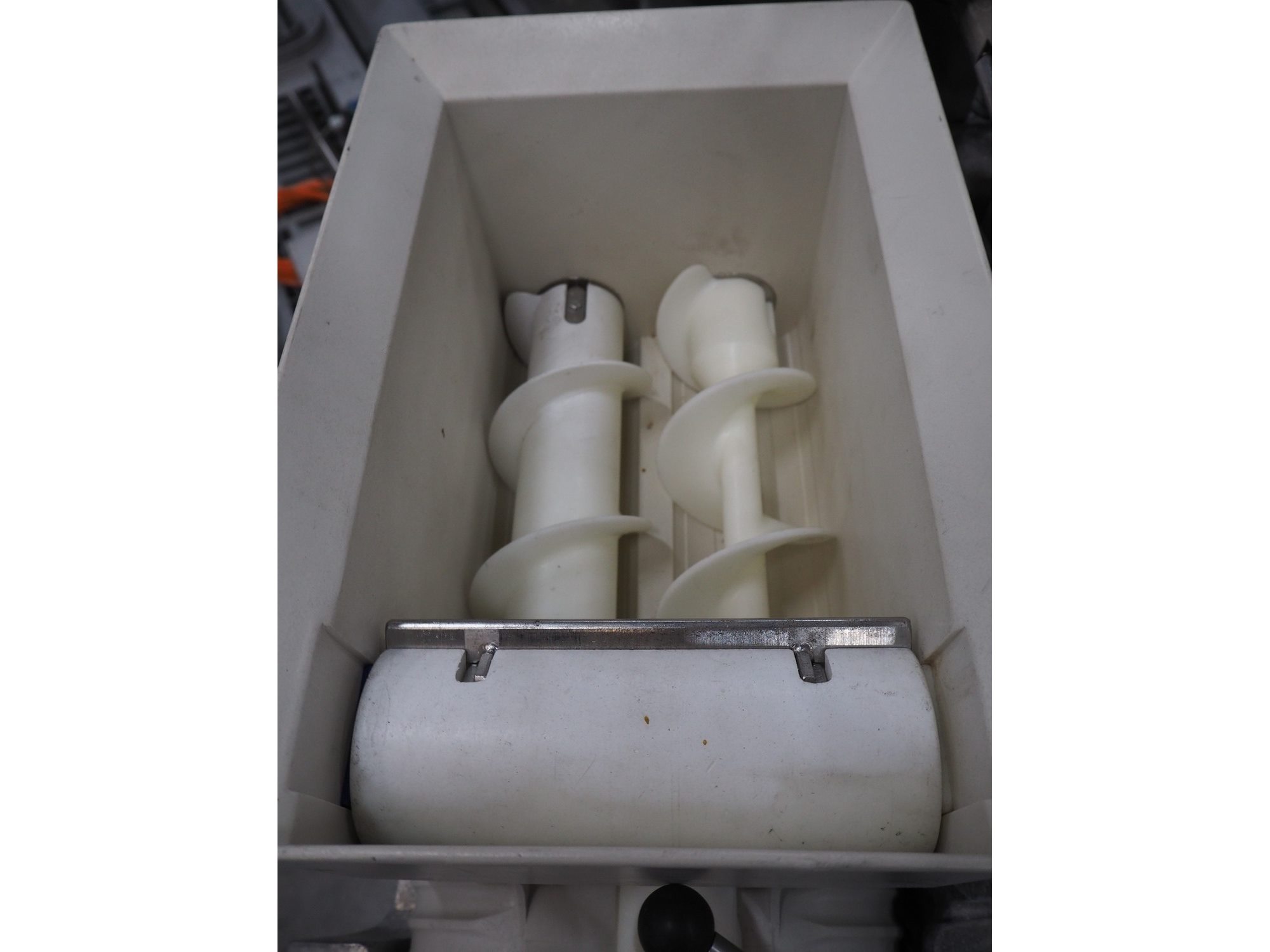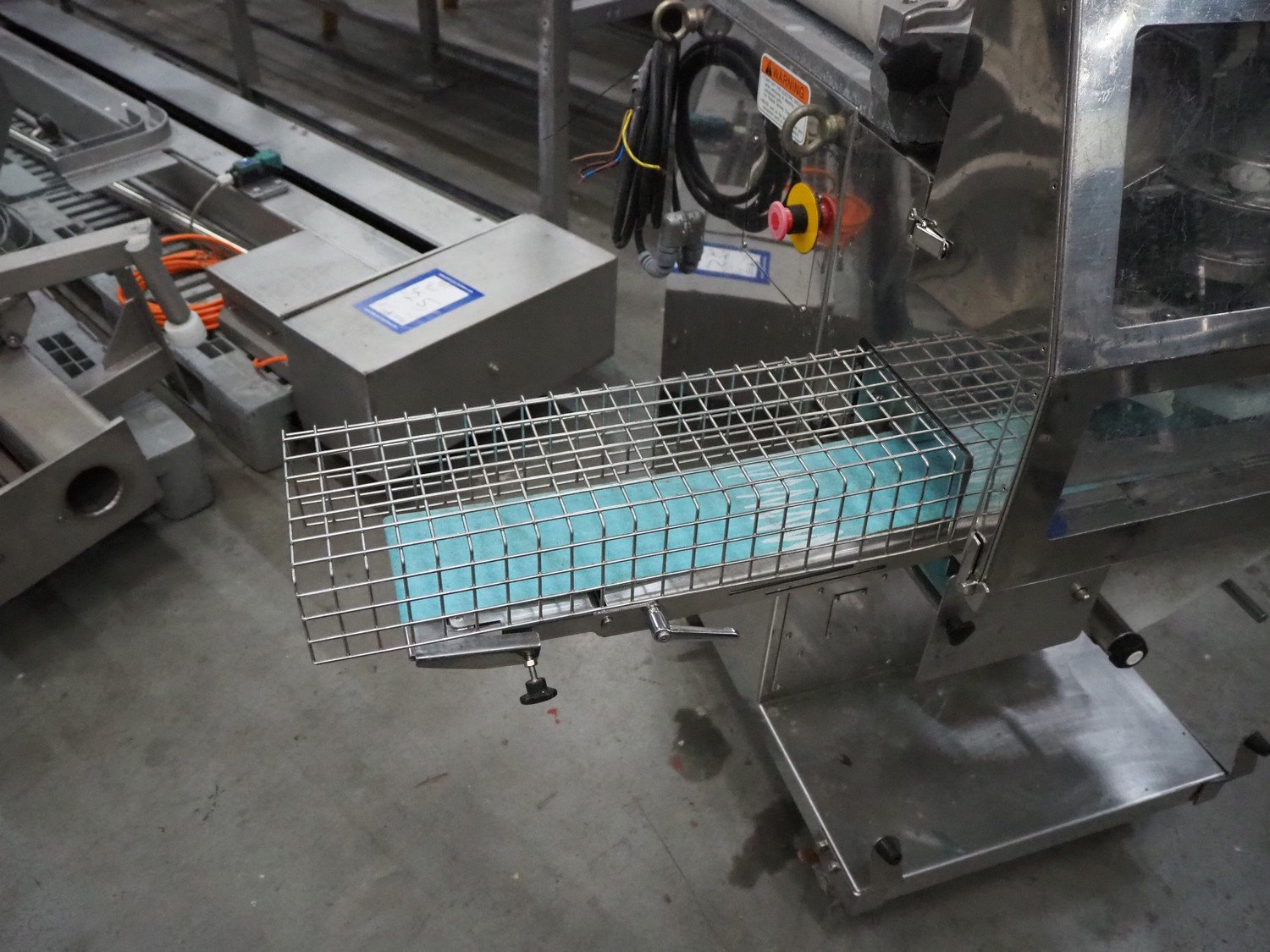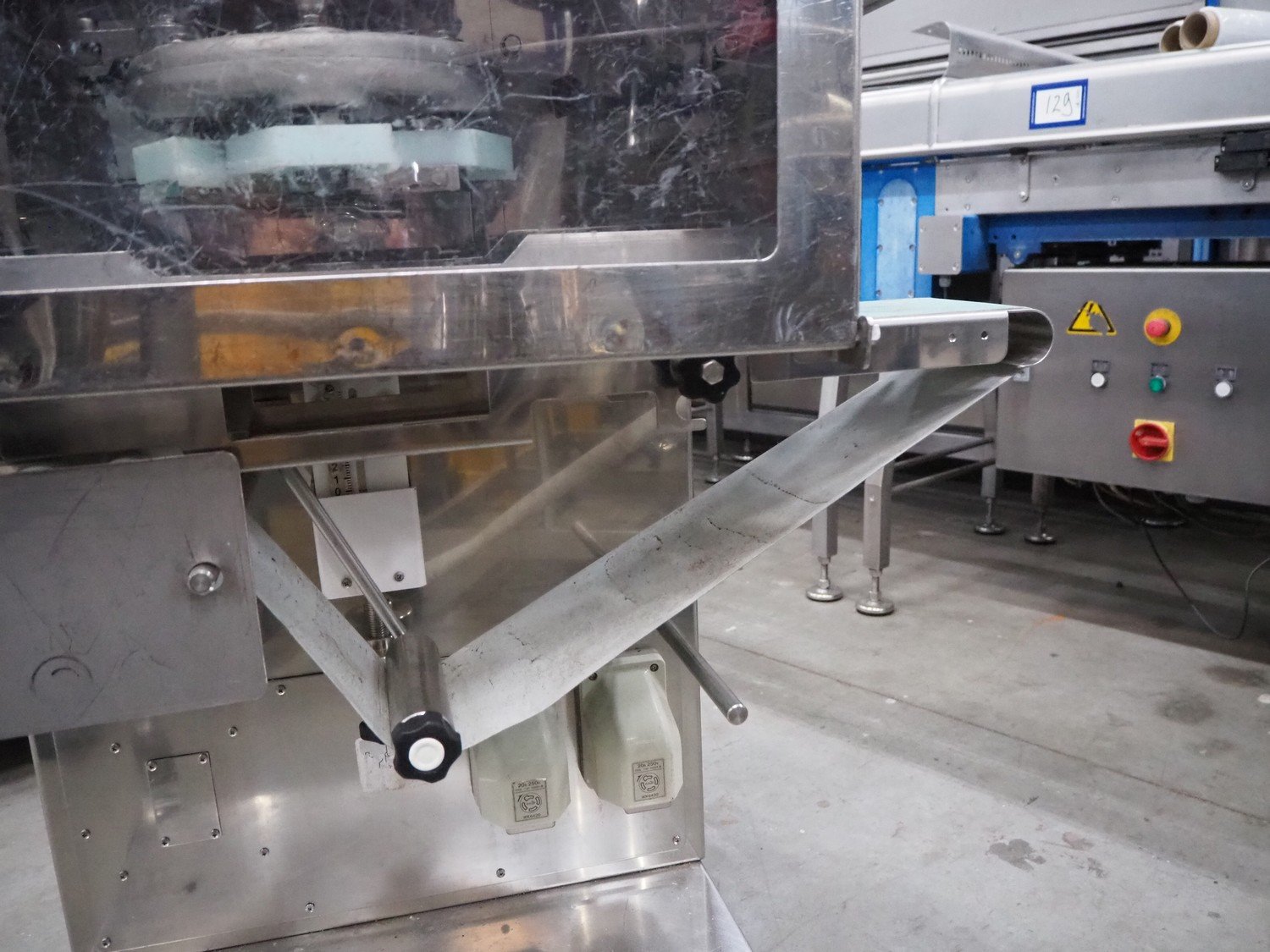 Rheon mobile encrusting machine, model: KN135, serial number: 096, year of construction: 2003, 380 V, 3 Ph, 50/60 Hz, 3.7 A, 1.09 kW, plastic belt, belt width: 130 mm, total dimensions: 1400 mm x 900 mm x 1400 mm.