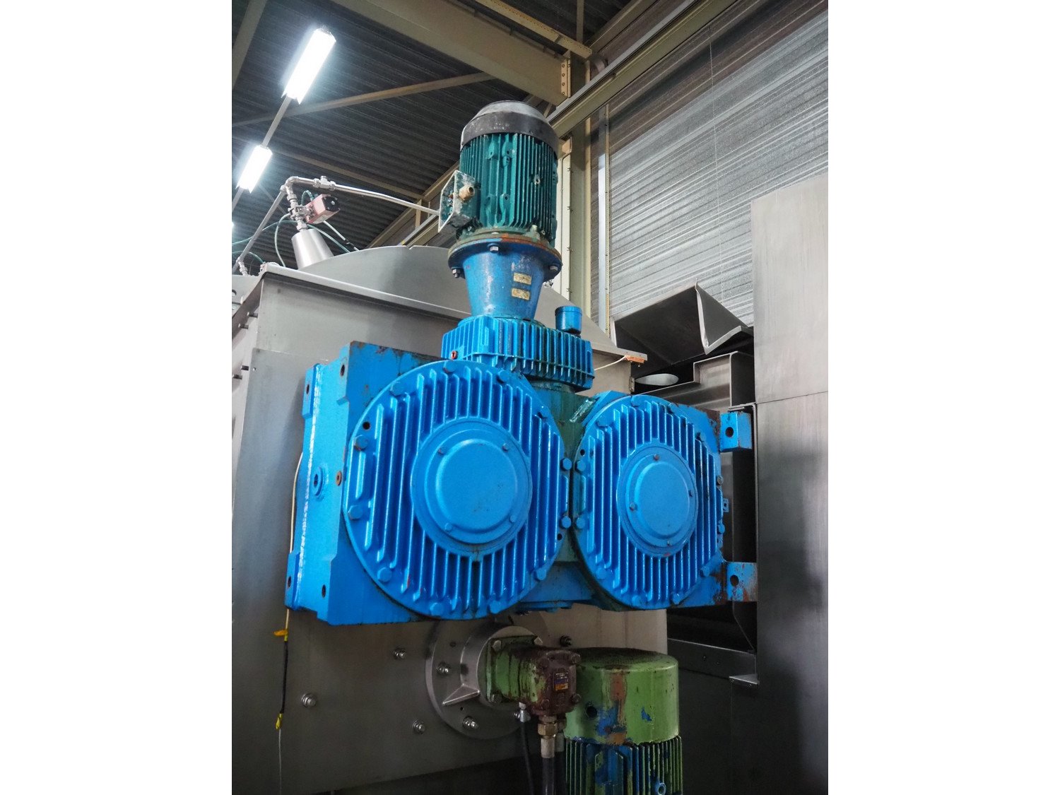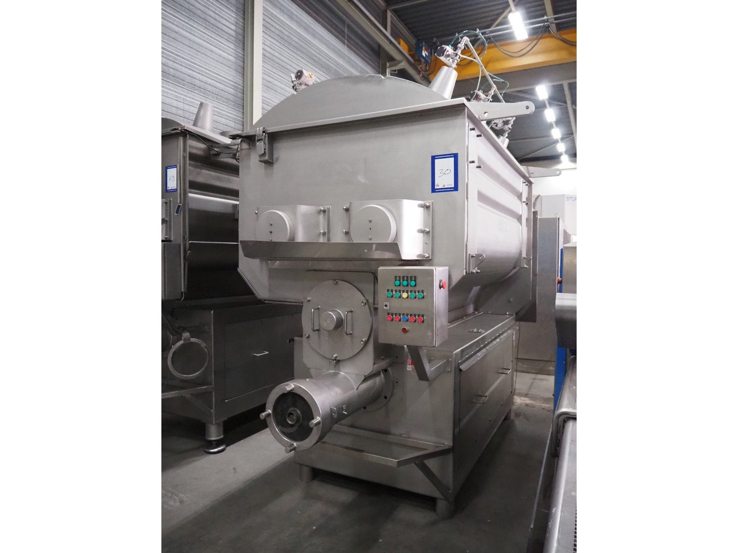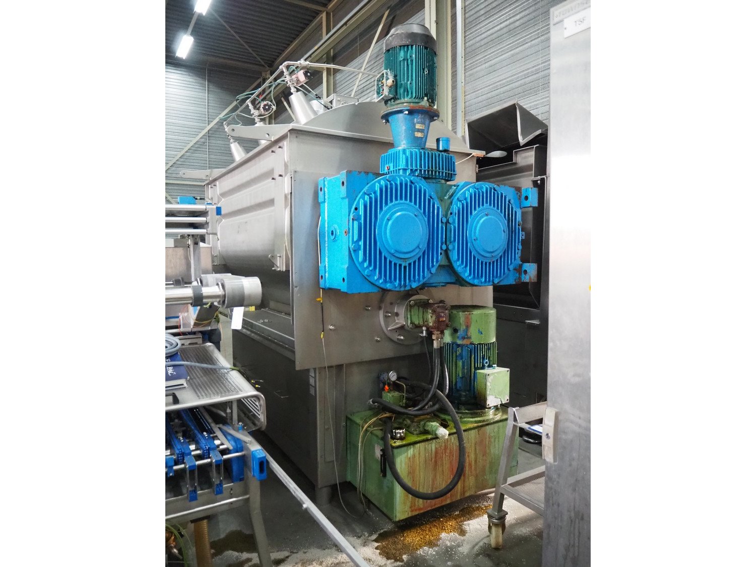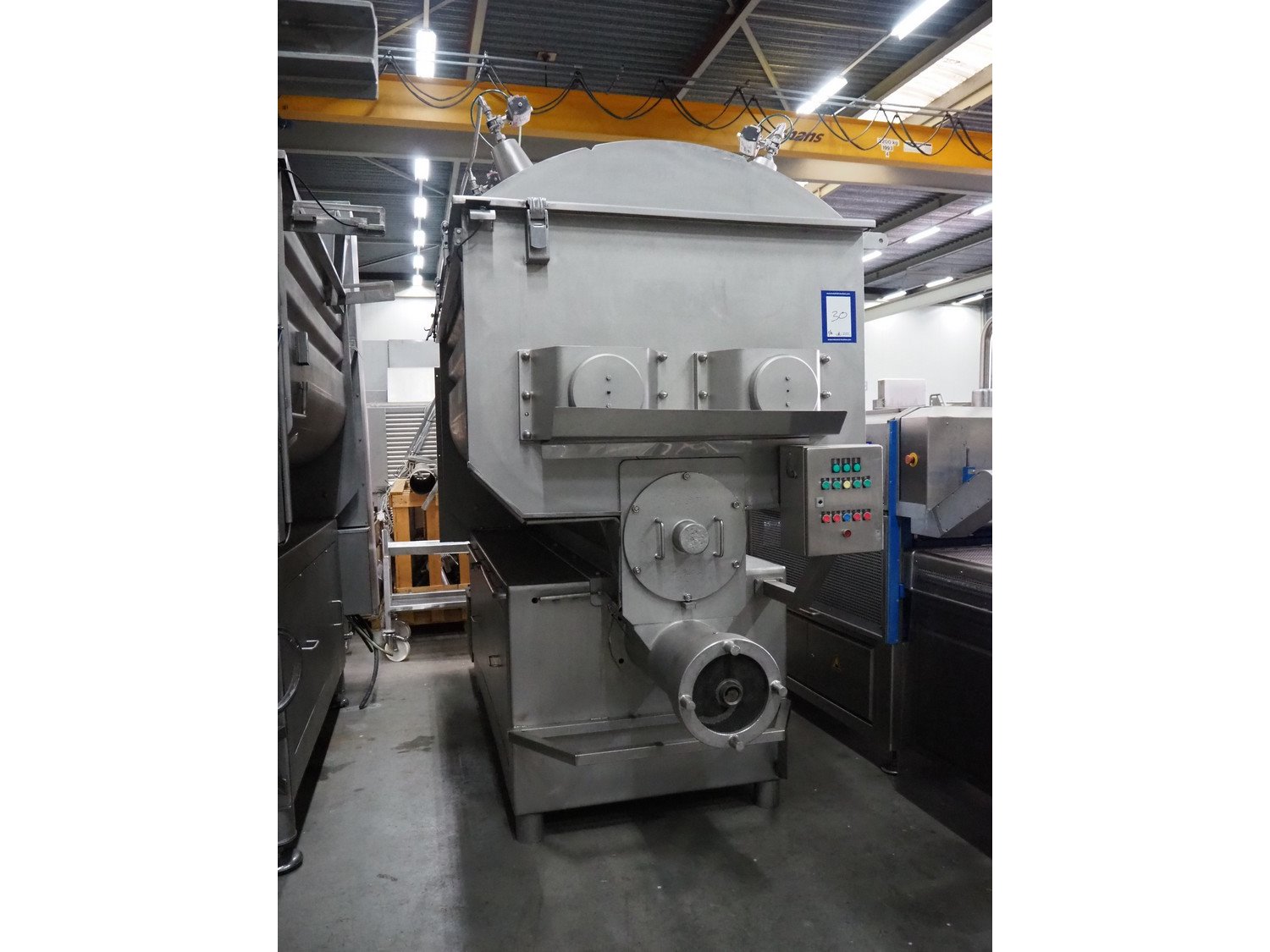 Butcher Boy double shaft paddle mixer-grinder, type: 3000/1100 MG, serial number: S107, year of construction: 2004, 400 V, 3 Ph, 50 Hz, 120 kW, diameter plate: 280 mm, volume: 3000 litres, air pressure: 8 bar, infeed height: 2500 mm, outfeed height: 760 mm, total dimensions: 4000 mm x 2000 mm x 3200 mm. Including tool trolley. Missing cover.