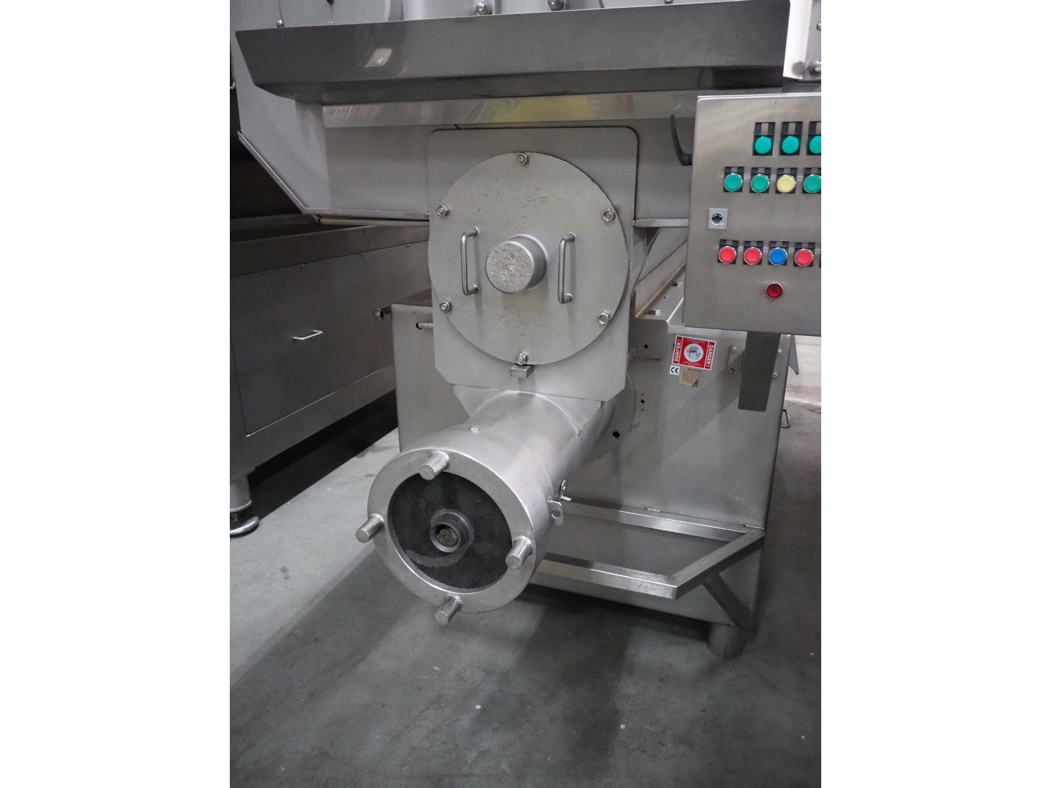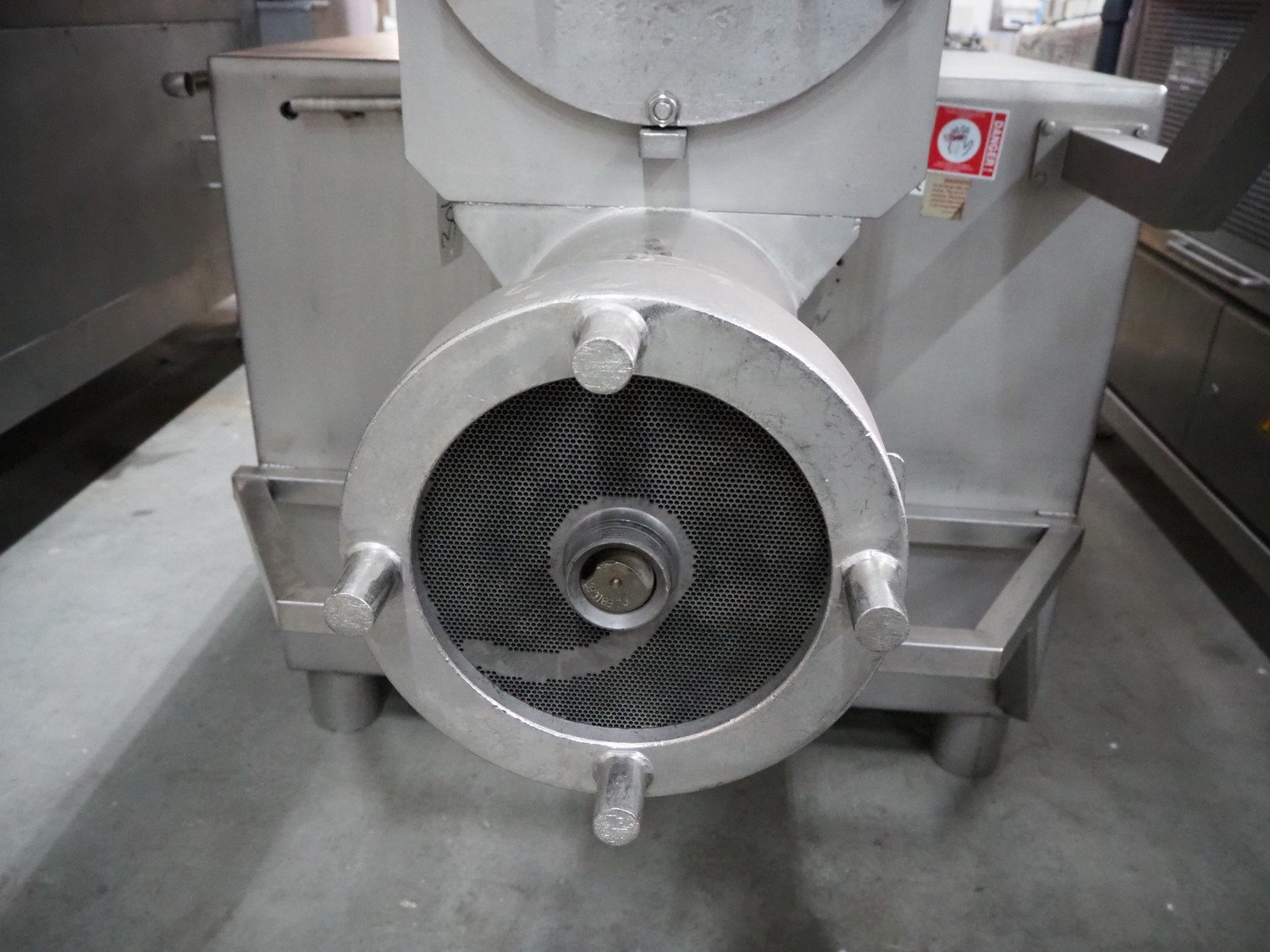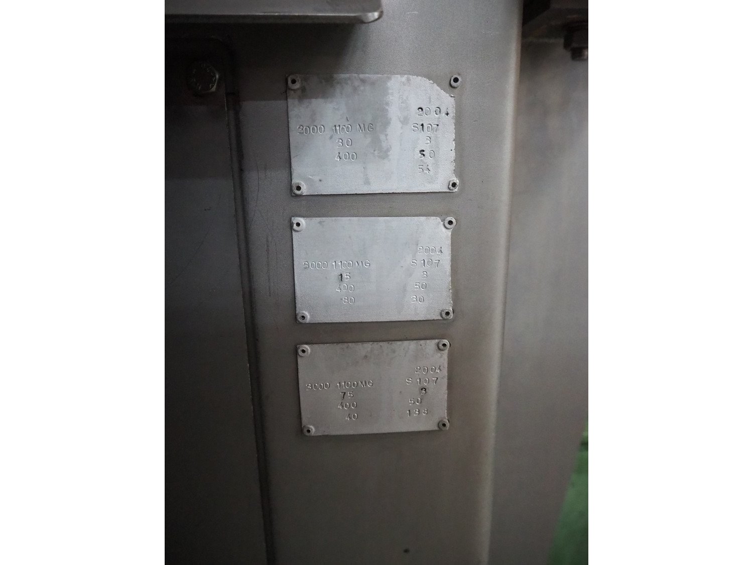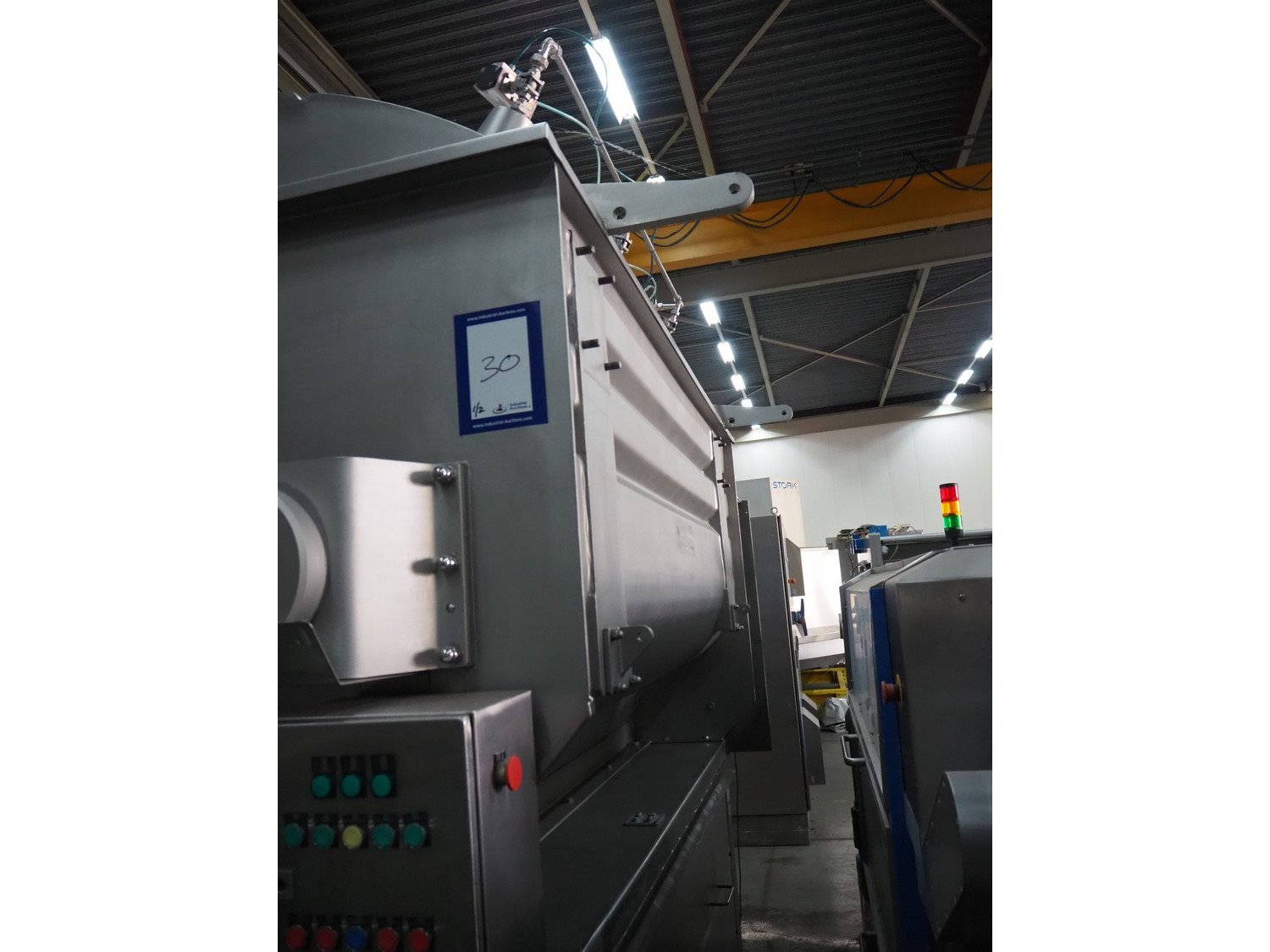 Butcher Boy double shaft paddle mixer-grinder, type: 3000/1100 MG, serial number: S107, year of construction: 2004, 400 V, 3 Ph, 50 Hz, 120 kW, diameter plate: 280 mm, volume: 3000 litres, air pressure: 8 bar, infeed height: 2500 mm, outfeed height: 760 mm, total dimensions: 4000 mm x 2000 mm x 3200 mm. Including tool trolley. Missing cover.