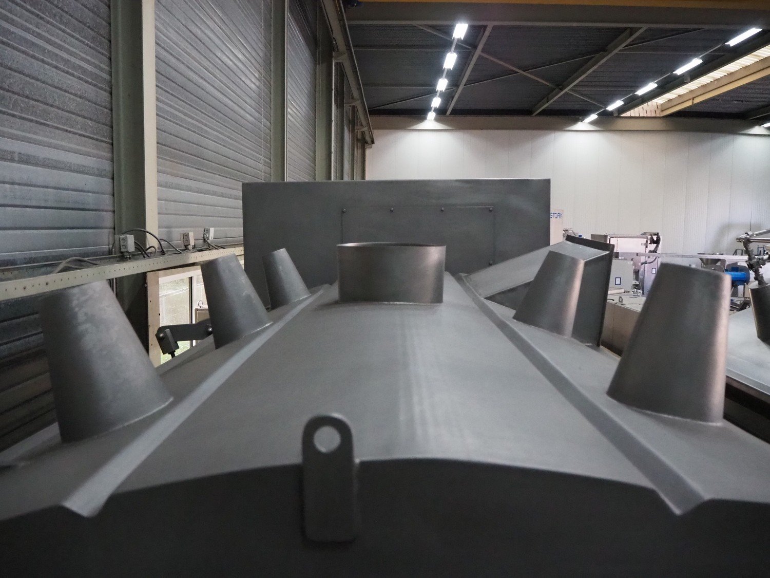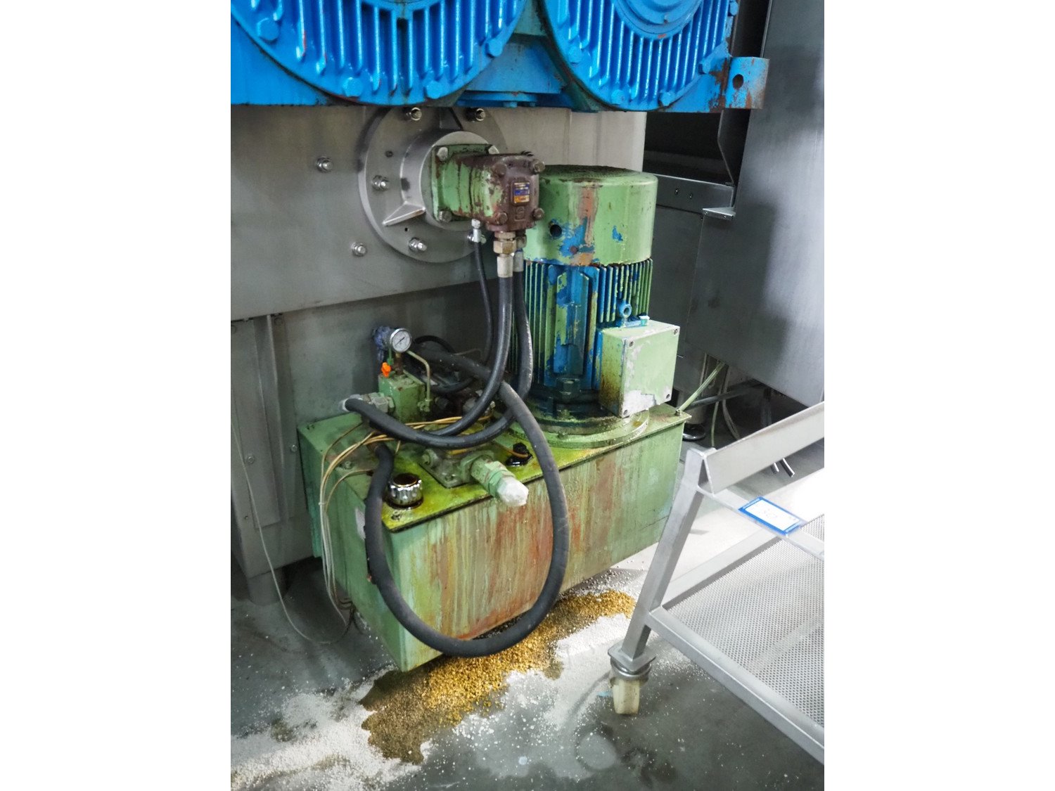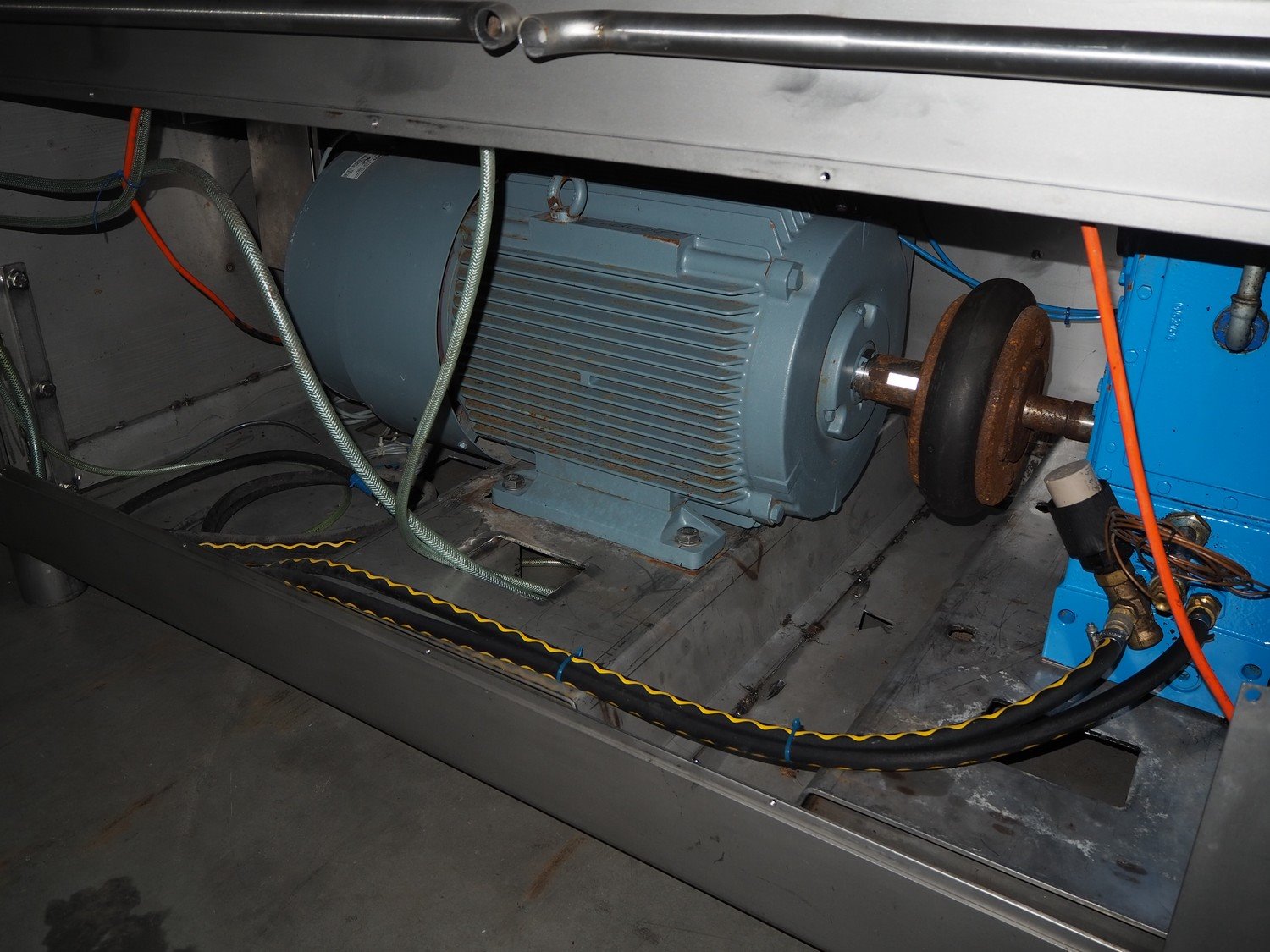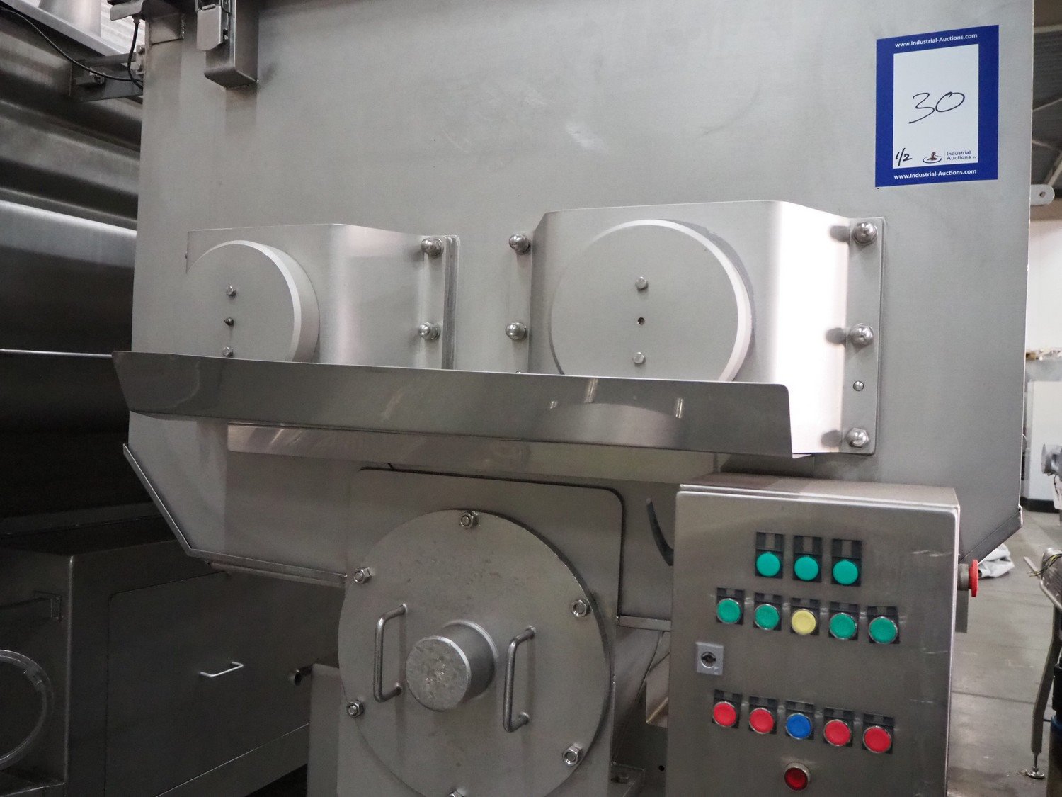 Butcher Boy double shaft paddle mixer-grinder, type: 3000/1100 MG, serial number: S107, year of construction: 2004, 400 V, 3 Ph, 50 Hz, 120 kW, diameter plate: 280 mm, volume: 3000 litres, air pressure: 8 bar, infeed height: 2500 mm, outfeed height: 760 mm, total dimensions: 4000 mm x 2000 mm x 3200 mm. Including tool trolley. Missing cover.