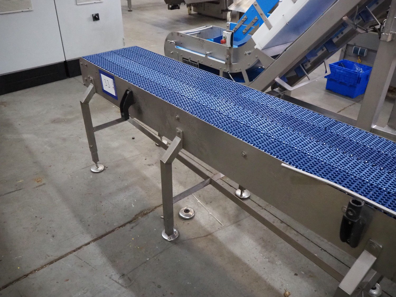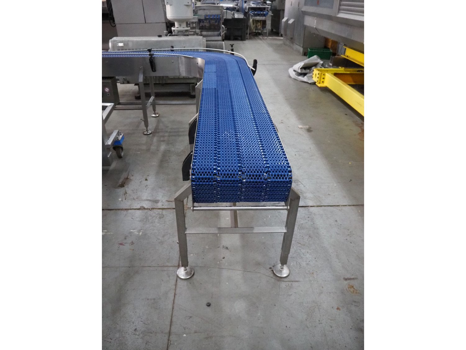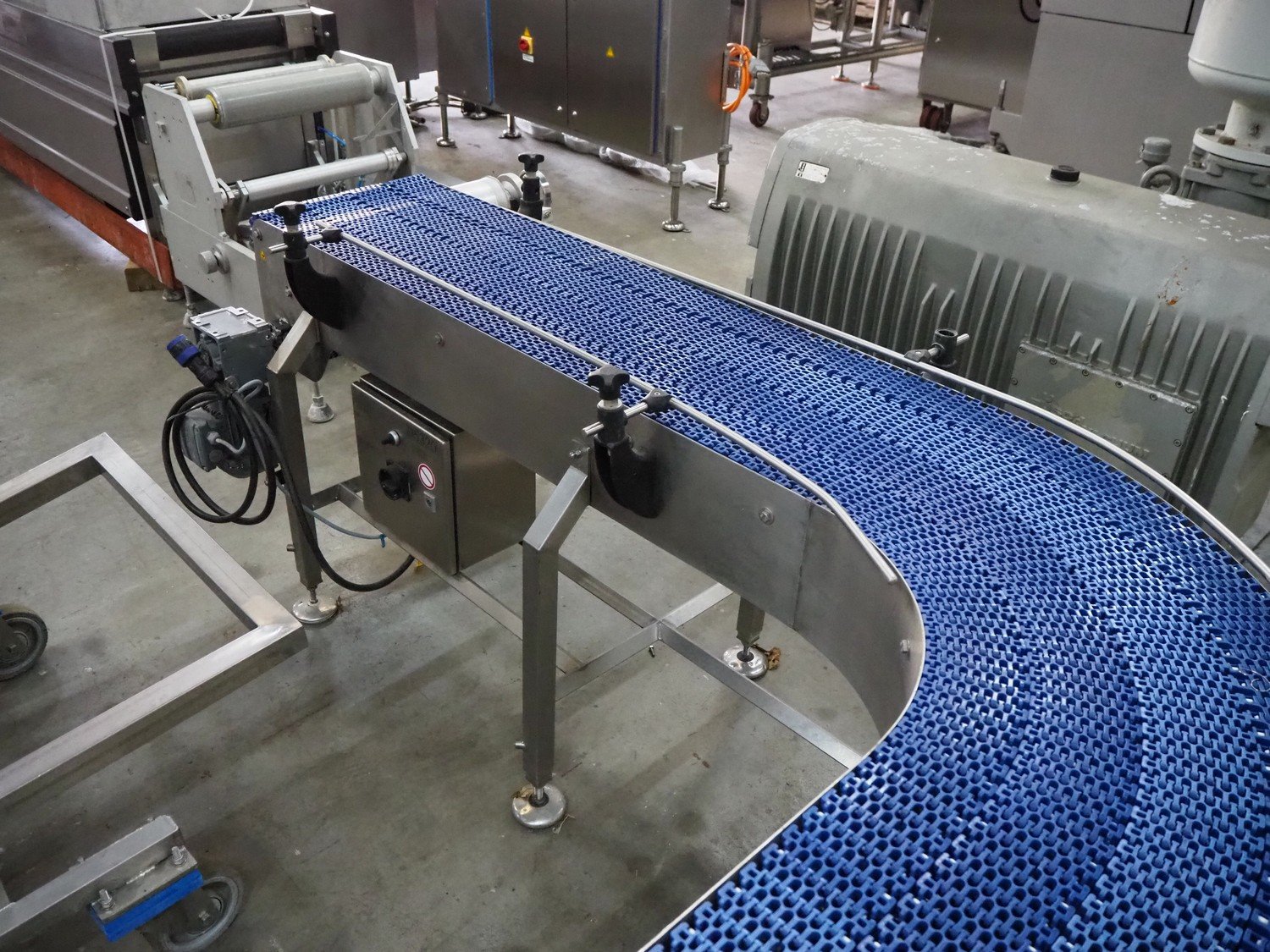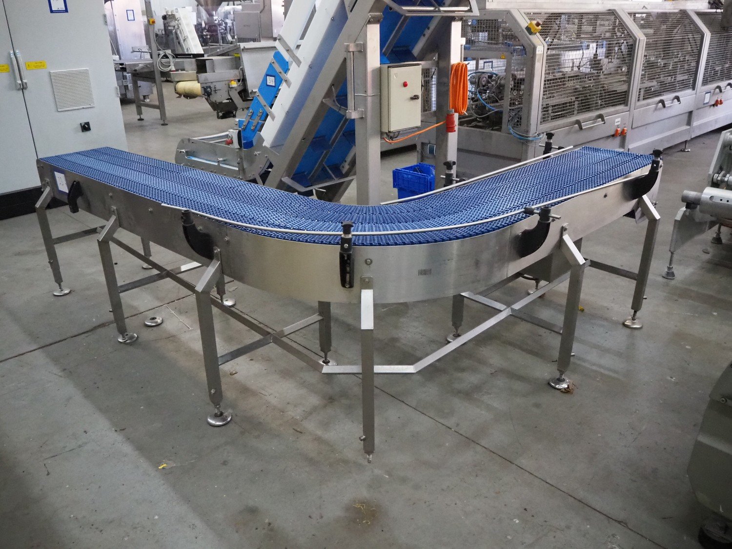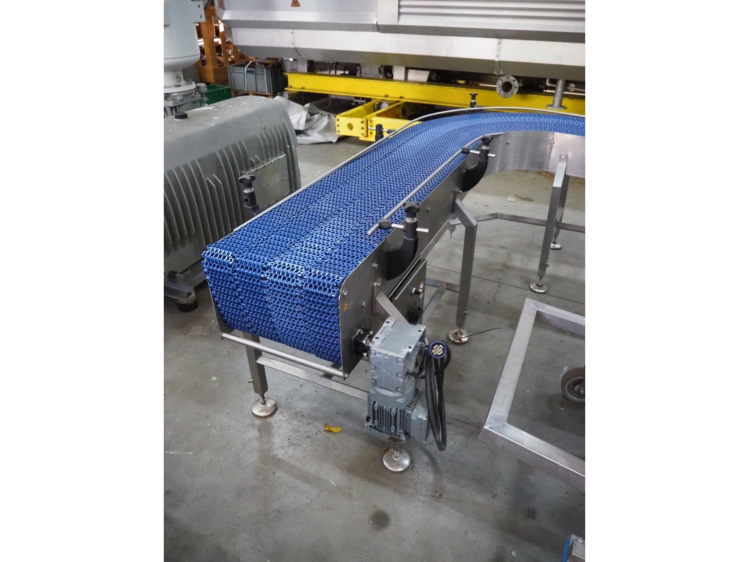 90˚ curve conveyor, s/s frame, plastic mesh belt, belt width: (4x) 100 mm, total dimensions: 2850 mm x 2200 mm x 900 mm.