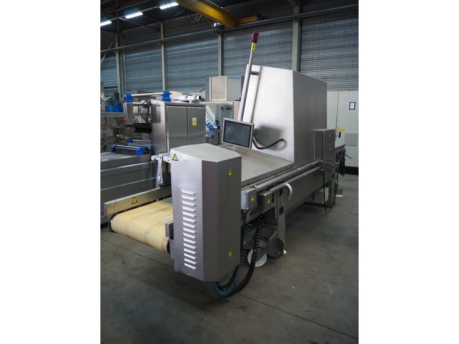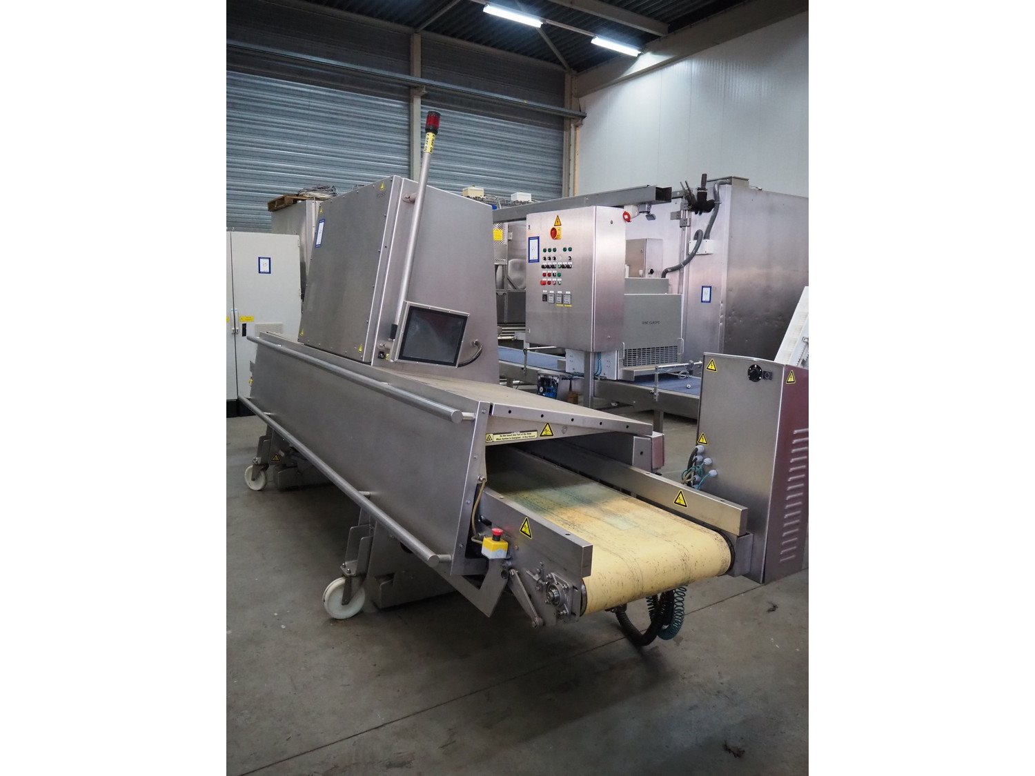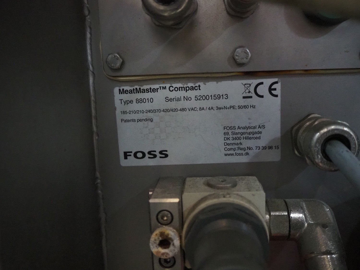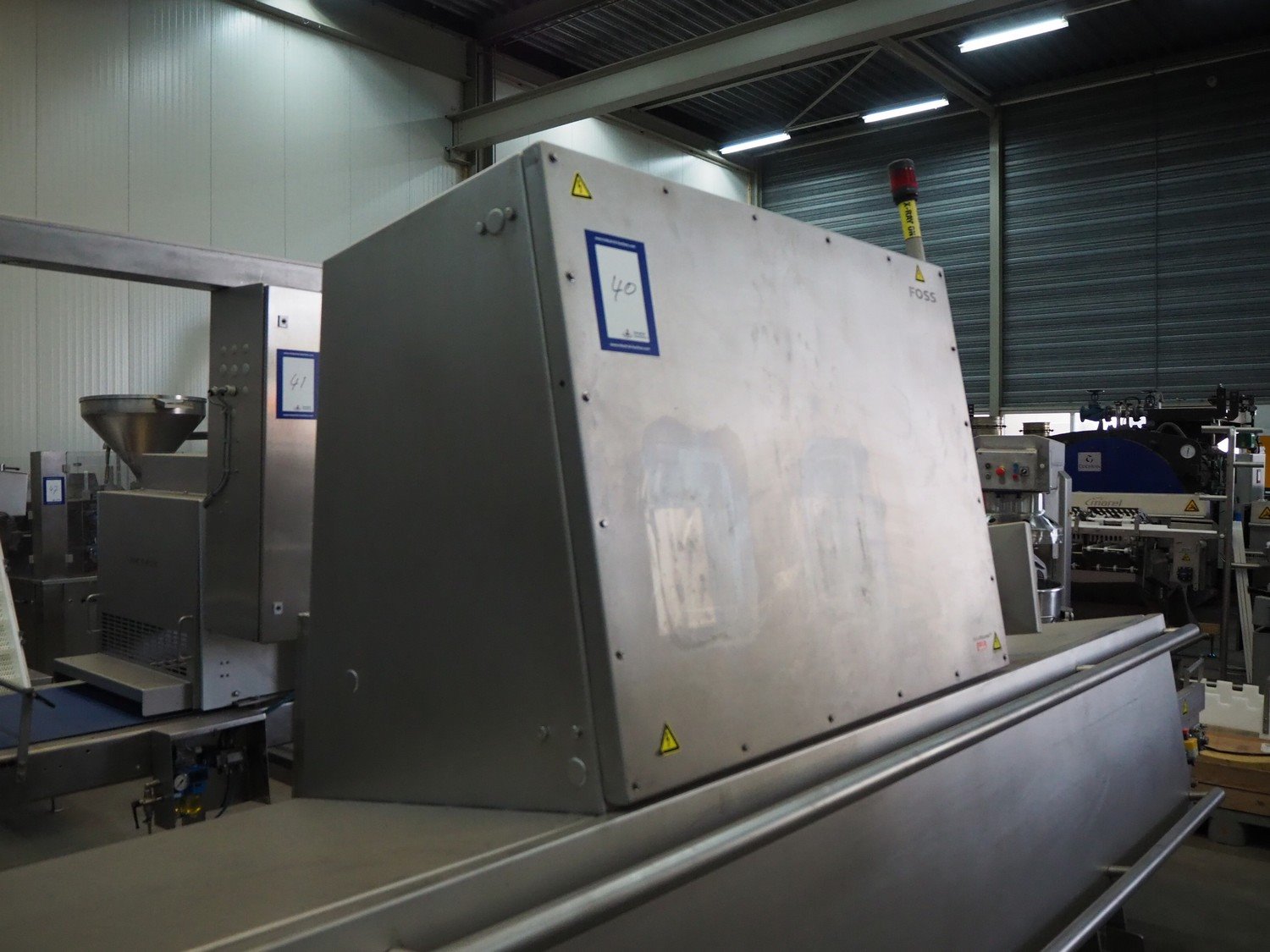 Foss mobile fat analysing machine, model: MeatMaster Compact, type: 88010, serial number: 520015913, 185-210/210-240/370-420/420-480 V, 3 Ph, 50/60 Hz, 8/4 A, plastic belt, belt width: 650 mm, total dimensions: 5400 mm x 1250 mm x 2620 mm.