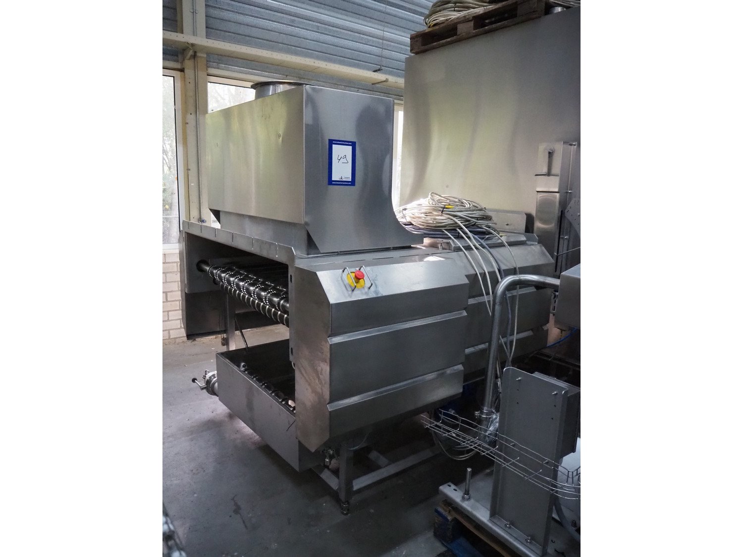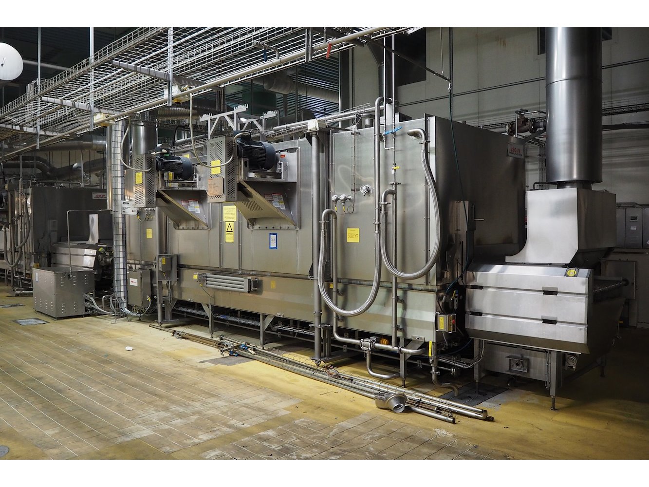 FMC Foodtech / Stein thermal double fluid oven, type: JSO IV OVEN, model: 40-22TF, serial number: 811, 380 VAC, 3 Ph, 50 Hz, full load: 185 A, motor: 46 A, short circuit: 5000 A, s/s mesh belt, belt width: 102 mm, clearance: 25 - 150 mm, total dimensions: 23200 mm x 3700 mm x 3300 mm. Overhauled in 2024.