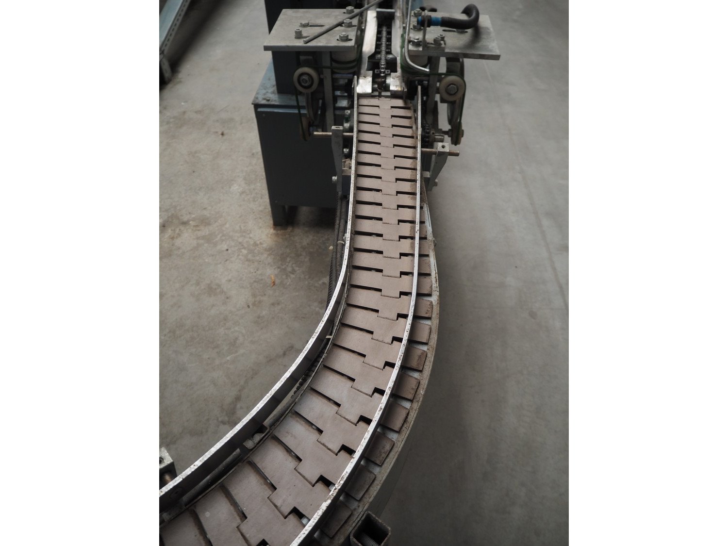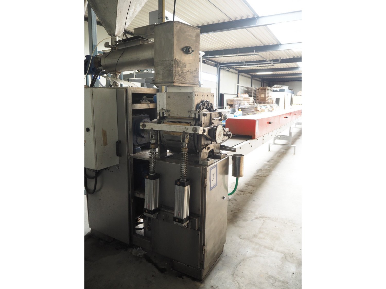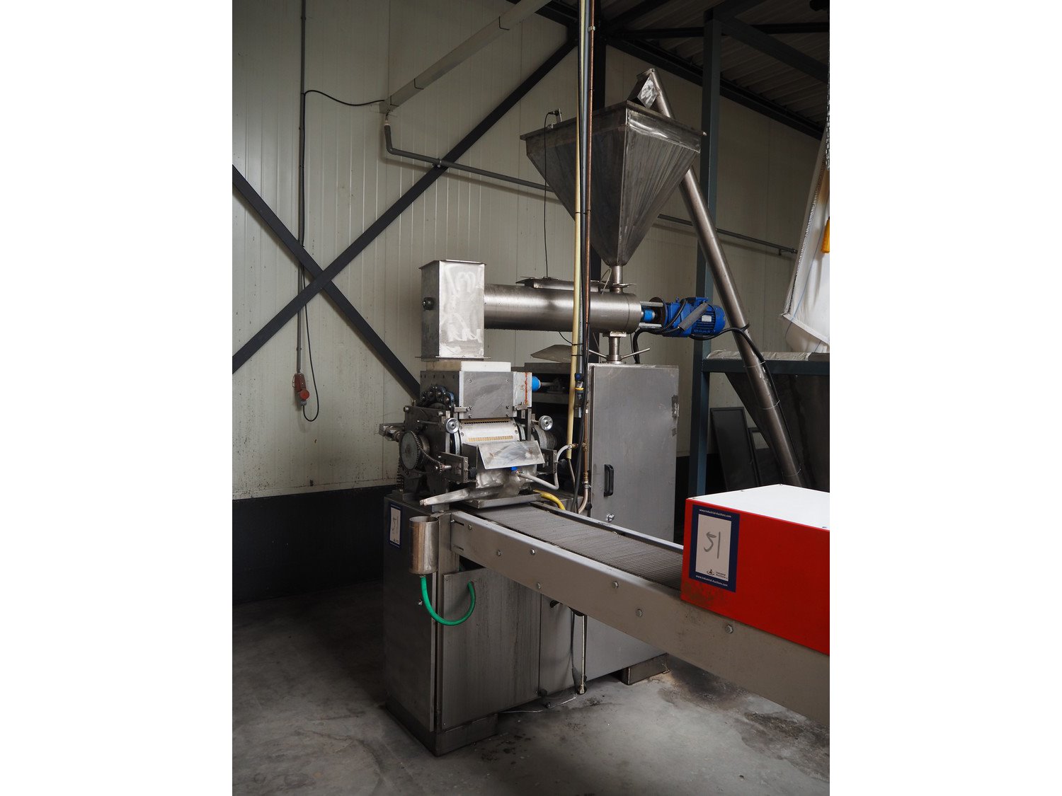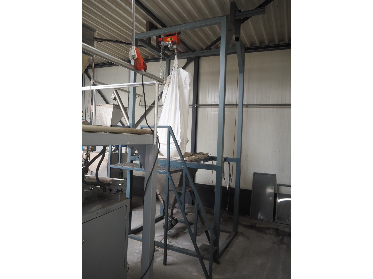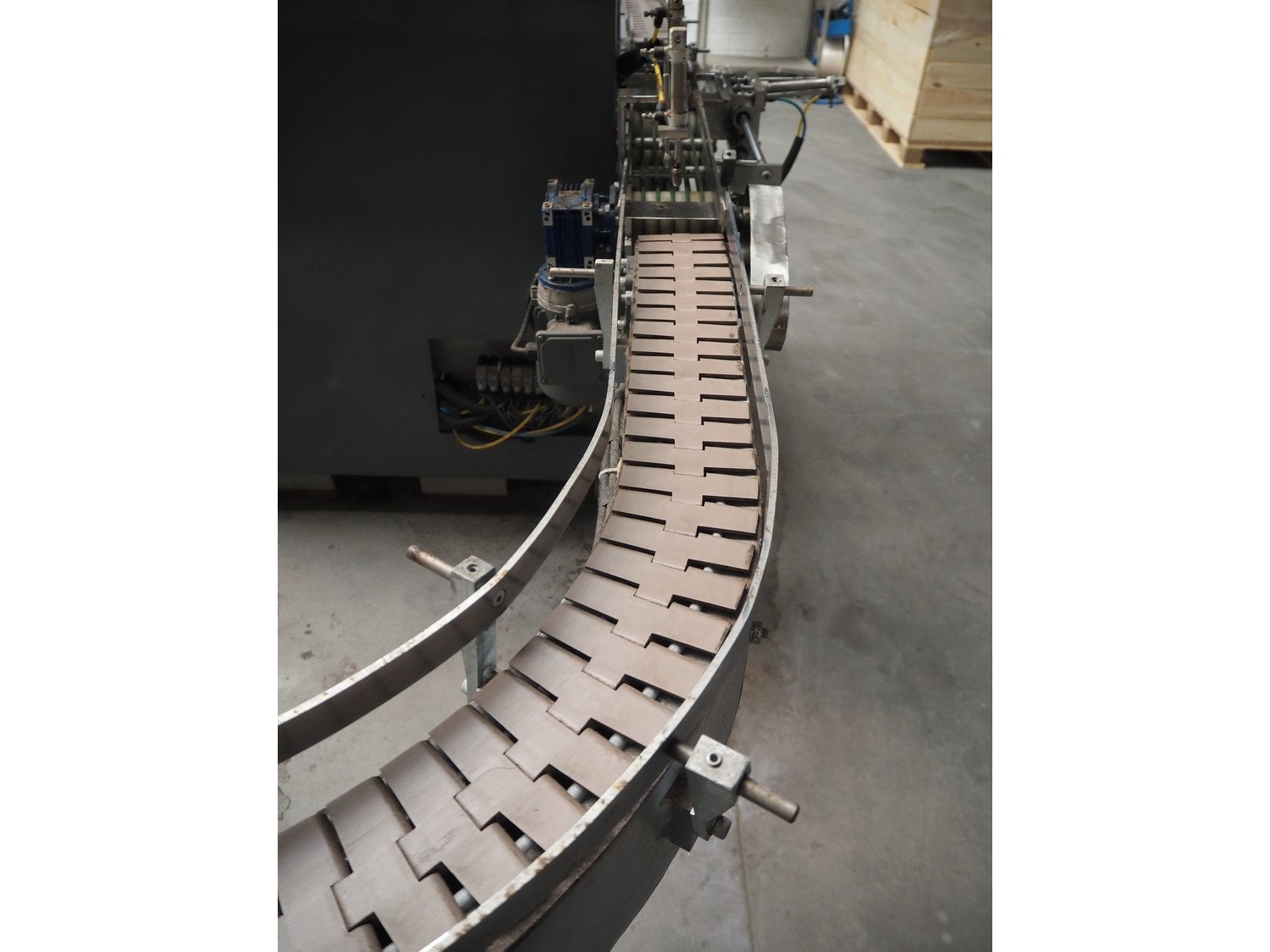 Complete fully automatic sugar cubes production and packaging line, consisting of: Big bag infeed bunker, platform height: 1550 mm, with s/s elevating screw, elevating height: 3000 mm, with Electric rope hoist, type: HGS-B1200, 230 V, 50 Hz, capacity: 1200/600 kg, lifting height: 10/20 m, total dimensions: 3100 mm x 2020 mm x 4750 mm; Teknikeller Makina forming machine for sugar cubes, type: T.T.O.R. 125, 380 V, 3 Ph, 50 Hz, capacity: 12.500 kg/24 hours, dimensions forms: (20x) 10 mm x 15 mm, dimensions forming machine: 2000 mm x 900 mm x 2850 mm, with drying and cooling belt, s/s mesh belt, belt width: 295 mm, length drying area: 18000 mm, length cooling area: 4000 mm, including de-stacker, size: 100 mm x 200 mm, total dimensions: 33500 mm x 2000 mm x 2850 mm; Box forming machine, box size: 210 mm x 100 mm, dimensions: 1500 mm x 1400 mm x 1630 mm; 90° curve conveyor, steel frame, plastic belt, belt width: 110 mm, total dimensions: 2650 mm x 1200 mm x 900 mm 90° curve conveyor, steel frame, plastic belt, belt width: 120 mm, total dimensions: 1250 mm x 1100 mm x 1850 mm; Box closing machine, belt width: 100 mm, distance between dividers: 330 mm, with glue unit, total dimensions: 2360 mm x 700 mm x 1600 mm; Roller conveyor, steel frame, plastic rollers, roller width: 300 mm, total dimensions: 2000 mm x 340 mm x 800 mm.