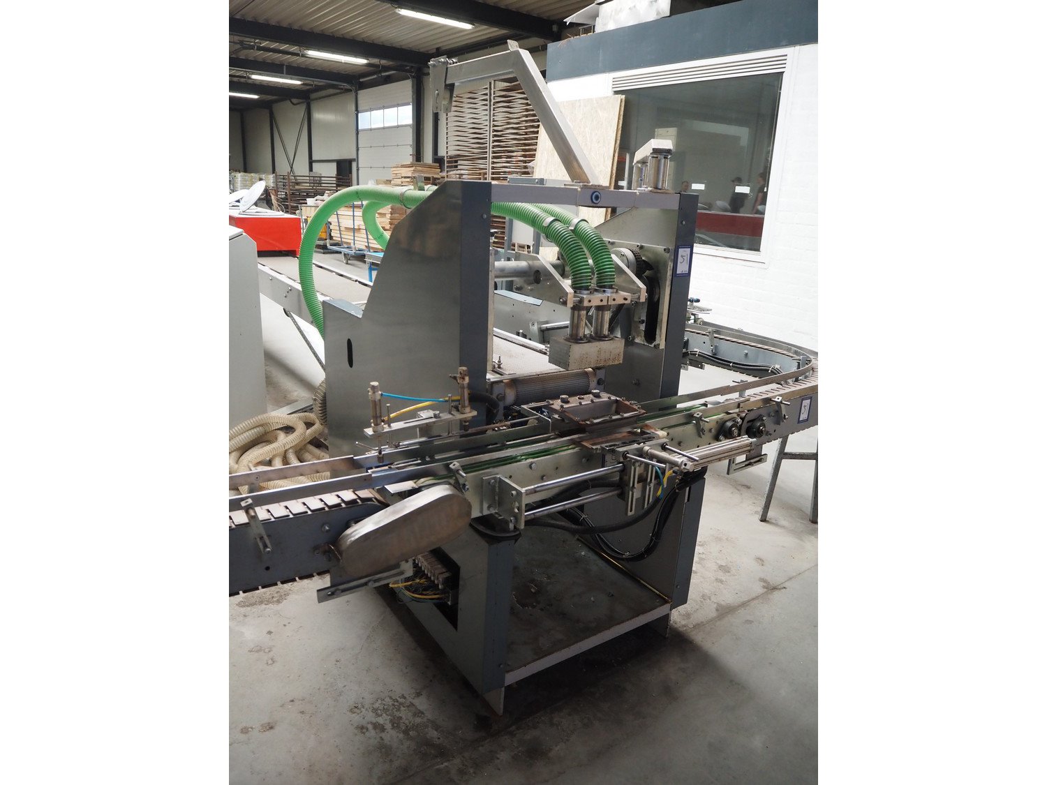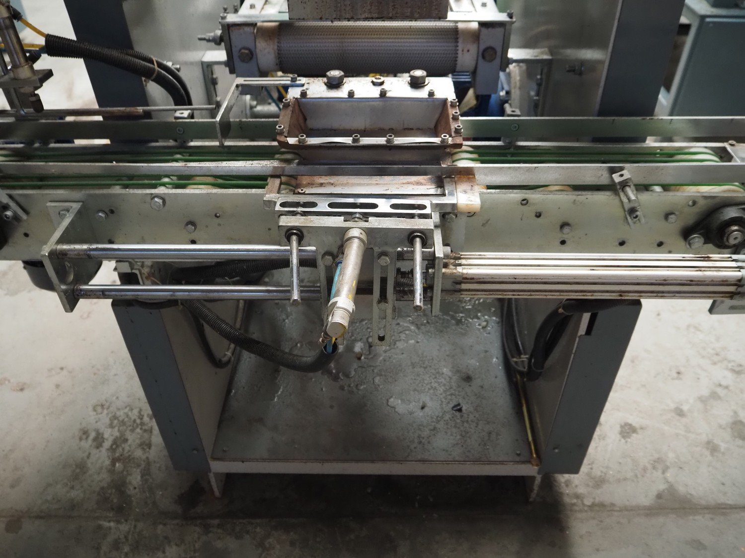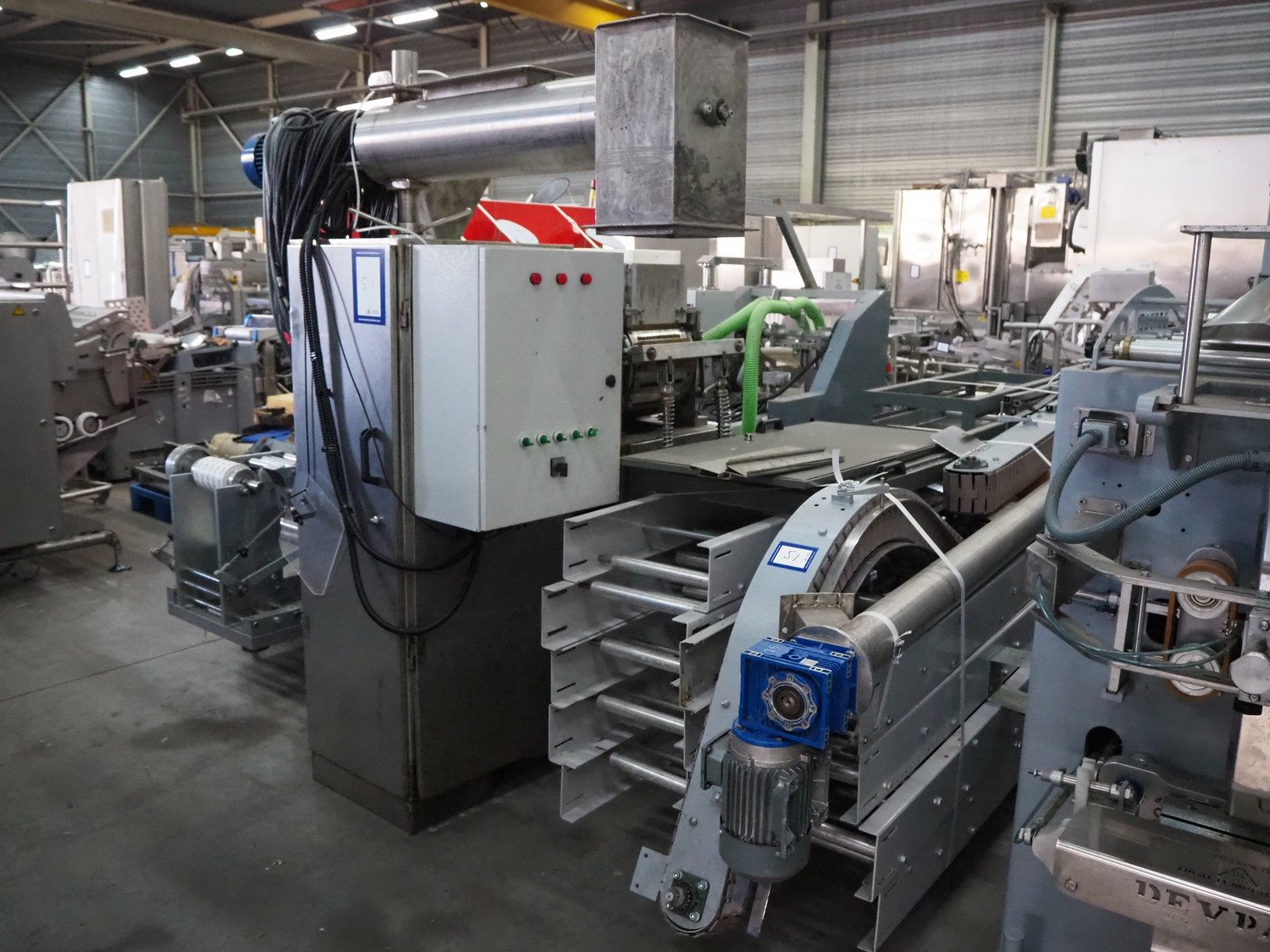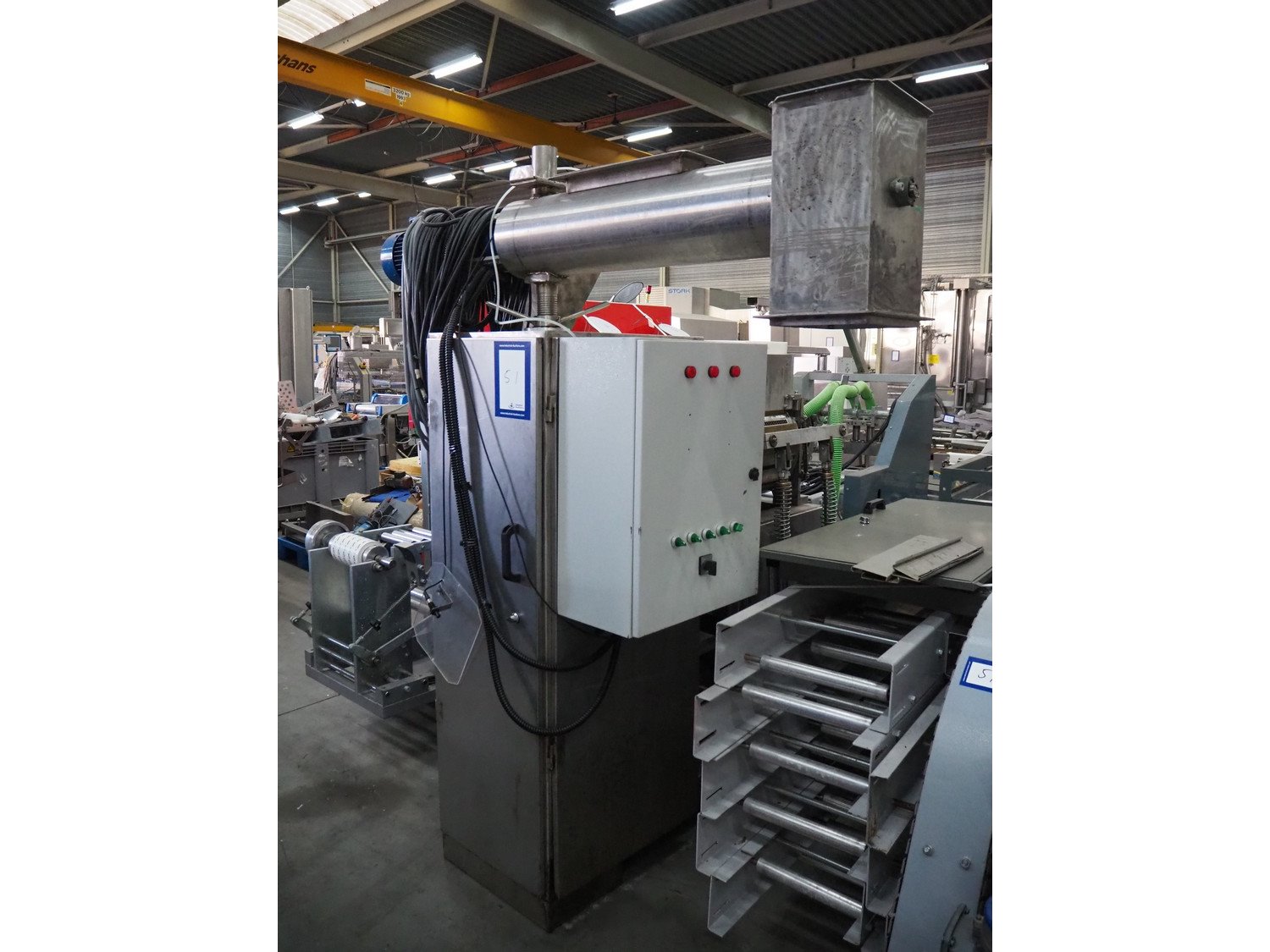 Complete fully automatic sugar cubes production and packaging line, consisting of: Big bag infeed bunker, platform height: 1550 mm, with s/s elevating screw, elevating height: 3000 mm, with Electric rope hoist, type: HGS-B1200, 230 V, 50 Hz, capacity: 1200/600 kg, lifting height: 10/20 m, total dimensions: 3100 mm x 2020 mm x 4750 mm; Teknikeller Makina forming machine for sugar cubes, type: T.T.O.R. 125, 380 V, 3 Ph, 50 Hz, capacity: 12.500 kg/24 hours, dimensions forms: (20x) 10 mm x 15 mm, dimensions forming machine: 2000 mm x 900 mm x 2850 mm, with drying and cooling belt, s/s mesh belt, belt width: 295 mm, length drying area: 18000 mm, length cooling area: 4000 mm, including de-stacker, size: 100 mm x 200 mm, total dimensions: 33500 mm x 2000 mm x 2850 mm; Box forming machine, box size: 210 mm x 100 mm, dimensions: 1500 mm x 1400 mm x 1630 mm; 90° curve conveyor, steel frame, plastic belt, belt width: 110 mm, total dimensions: 2650 mm x 1200 mm x 900 mm 90° curve conveyor, steel frame, plastic belt, belt width: 120 mm, total dimensions: 1250 mm x 1100 mm x 1850 mm; Box closing machine, belt width: 100 mm, distance between dividers: 330 mm, with glue unit, total dimensions: 2360 mm x 700 mm x 1600 mm; Roller conveyor, steel frame, plastic rollers, roller width: 300 mm, total dimensions: 2000 mm x 340 mm x 800 mm.