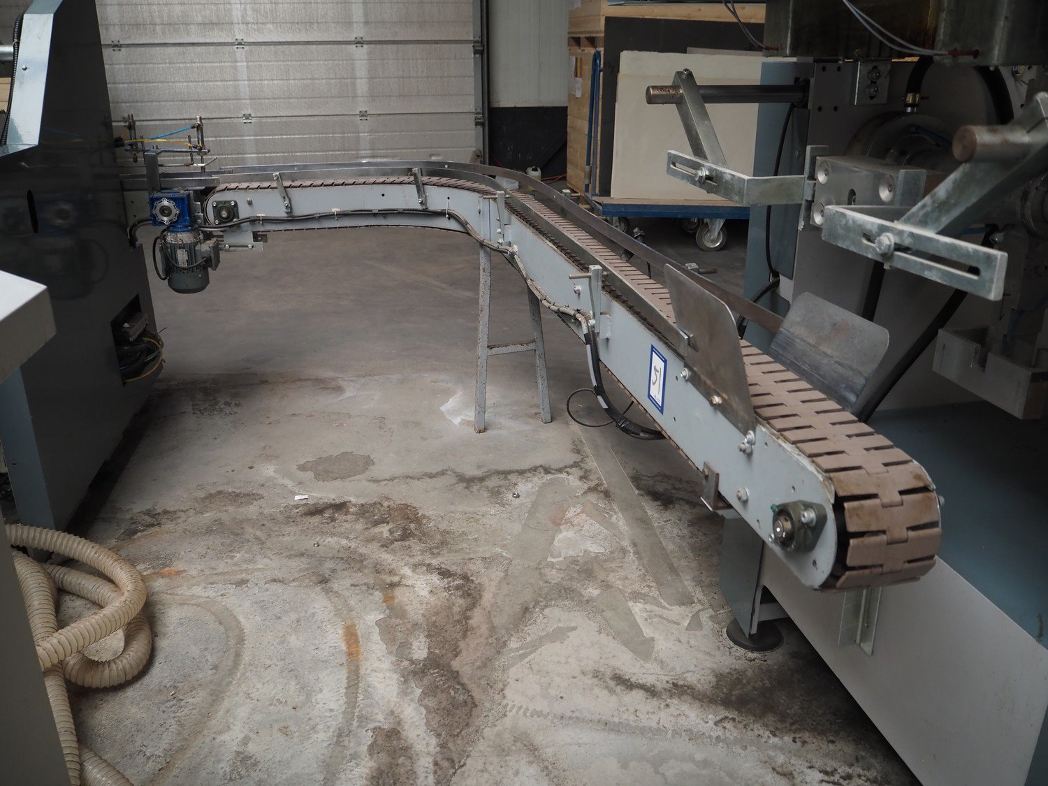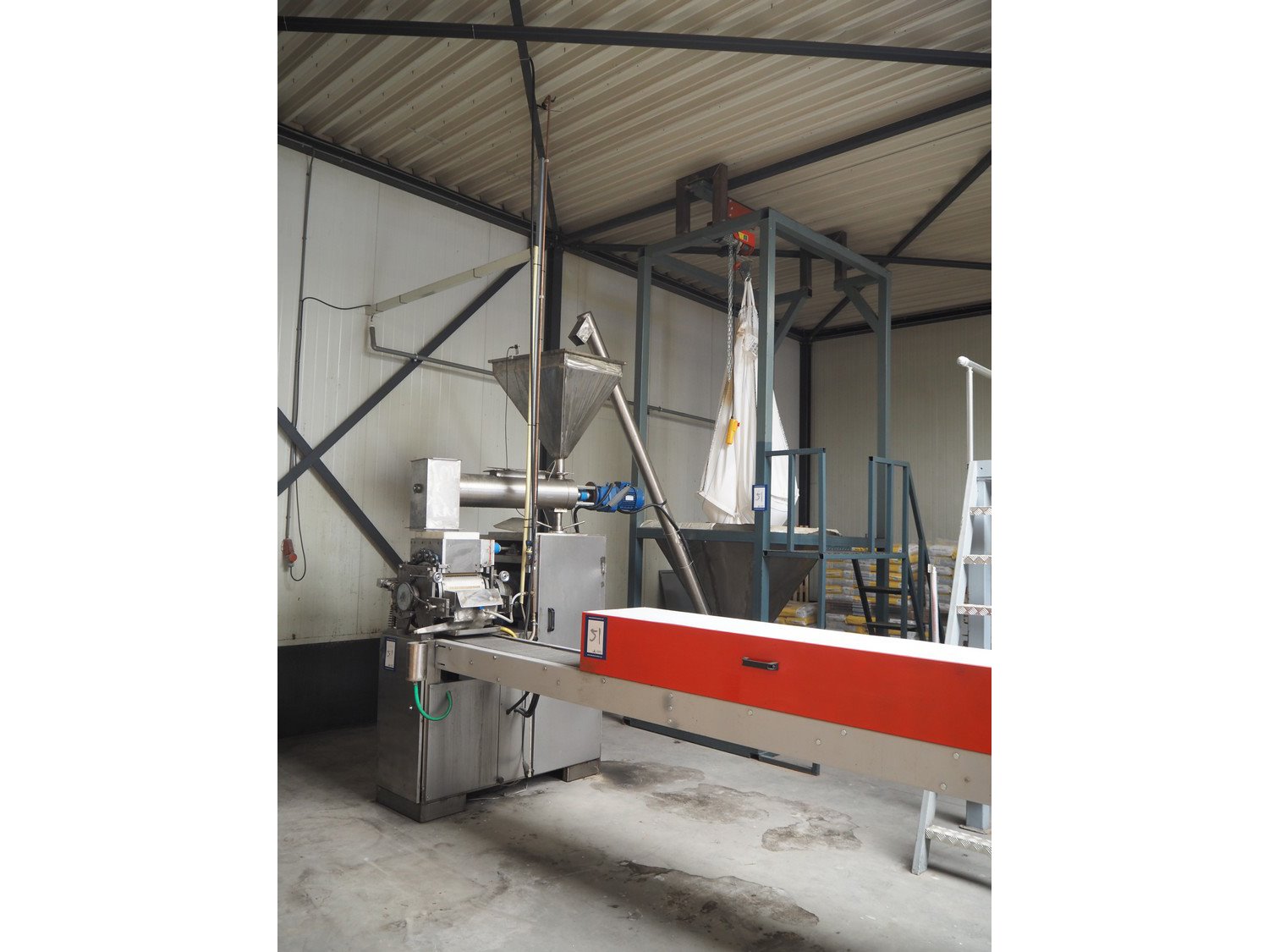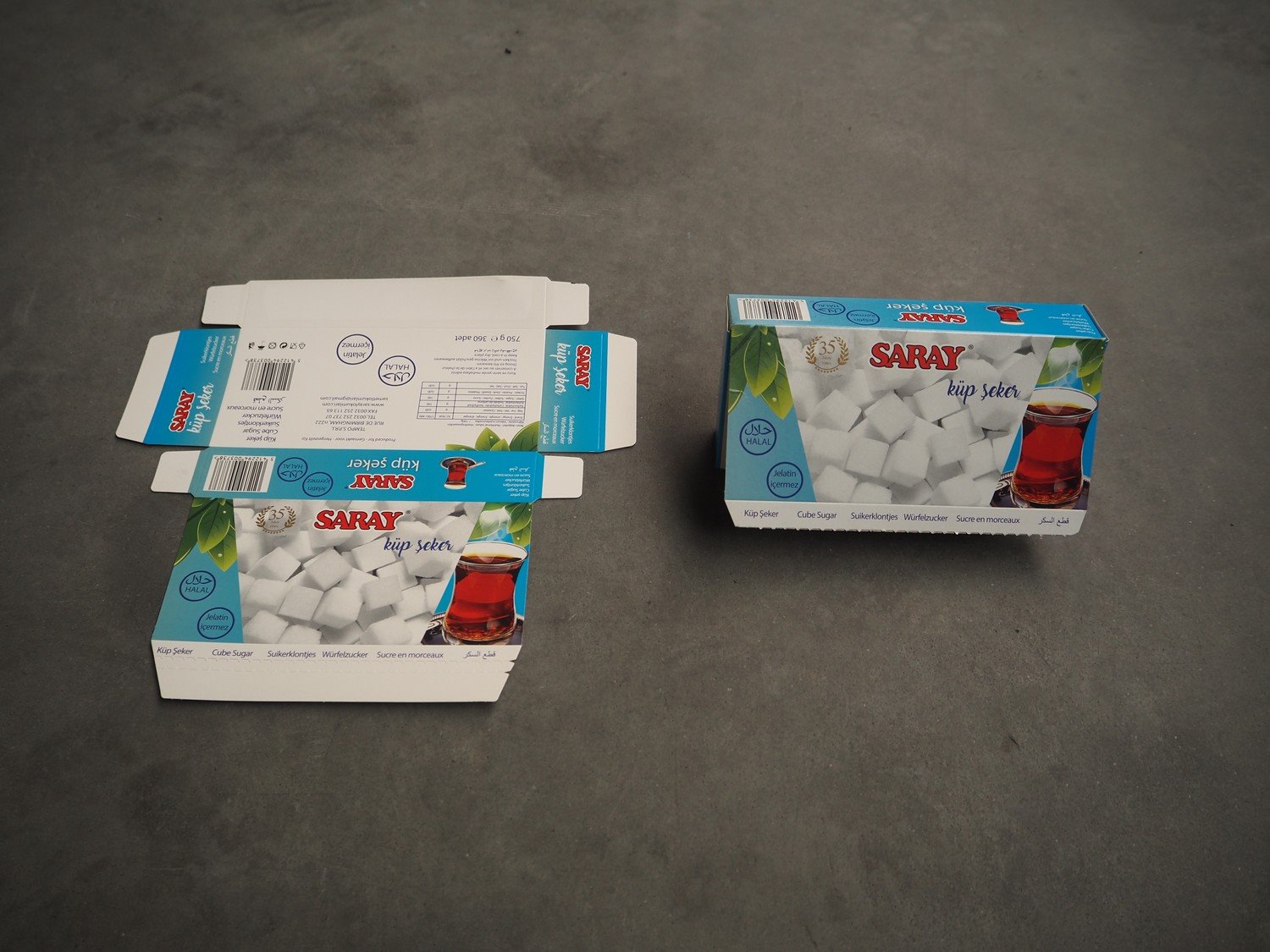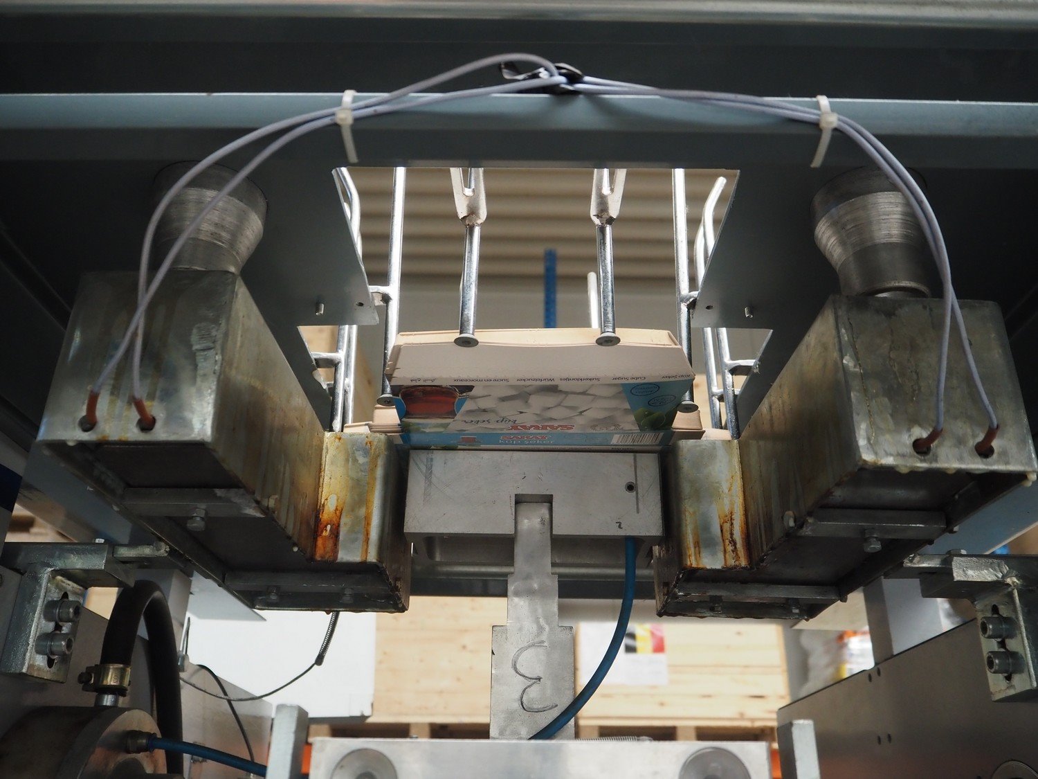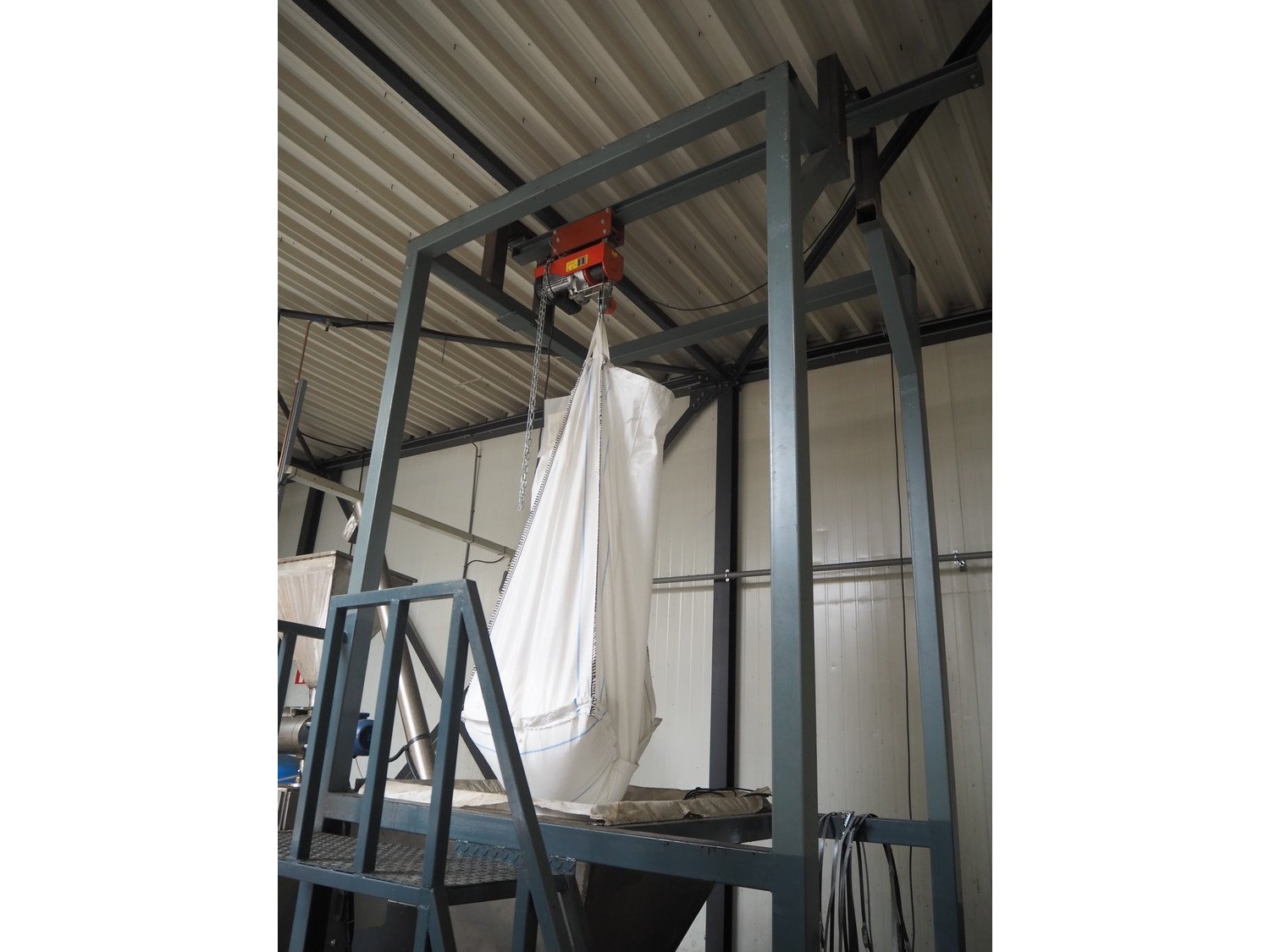 Complete fully automatic sugar cubes production and packaging line, consisting of: Big bag infeed bunker, platform height: 1550 mm, with s/s elevating screw, elevating height: 3000 mm, with Electric rope hoist, type: HGS-B1200, 230 V, 50 Hz, capacity: 1200/600 kg, lifting height: 10/20 m, total dimensions: 3100 mm x 2020 mm x 4750 mm; Teknikeller Makina forming machine for sugar cubes, type: T.T.O.R. 125, 380 V, 3 Ph, 50 Hz, capacity: 12.500 kg/24 hours, dimensions forms: (20x) 10 mm x 15 mm, dimensions forming machine: 2000 mm x 900 mm x 2850 mm, with drying and cooling belt, s/s mesh belt, belt width: 295 mm, length drying area: 18000 mm, length cooling area: 4000 mm, including de-stacker, size: 100 mm x 200 mm, total dimensions: 33500 mm x 2000 mm x 2850 mm; Box forming machine, box size: 210 mm x 100 mm, dimensions: 1500 mm x 1400 mm x 1630 mm; 90° curve conveyor, steel frame, plastic belt, belt width: 110 mm, total dimensions: 2650 mm x 1200 mm x 900 mm 90° curve conveyor, steel frame, plastic belt, belt width: 120 mm, total dimensions: 1250 mm x 1100 mm x 1850 mm; Box closing machine, belt width: 100 mm, distance between dividers: 330 mm, with glue unit, total dimensions: 2360 mm x 700 mm x 1600 mm; Roller conveyor, steel frame, plastic rollers, roller width: 300 mm, total dimensions: 2000 mm x 340 mm x 800 mm.
