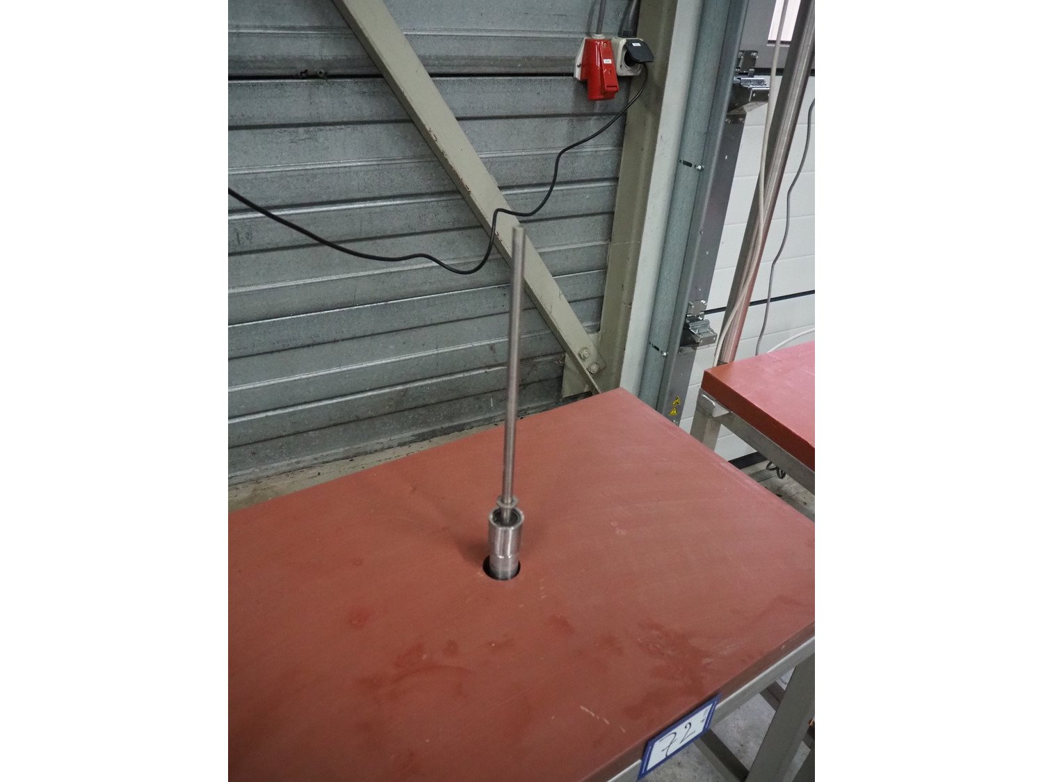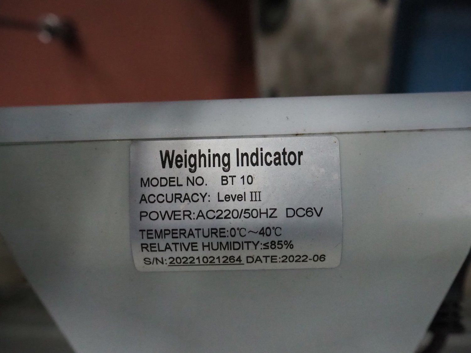 S/s table with plastic top and Kebab skewer with weighing unit, model: BT 10, serial number: 20221021264, year of construction: 2022-06, 220 V, 50 Hz, dimensions: 800 mm x 550 mm x 1650 mm.