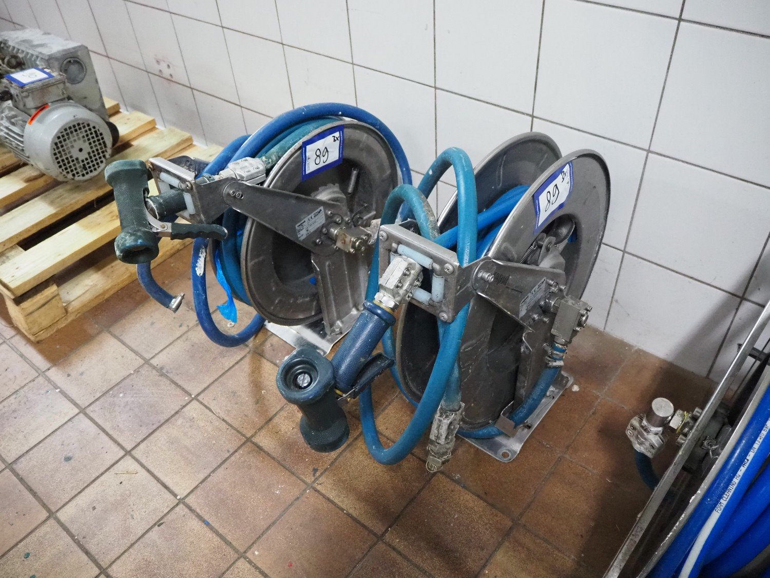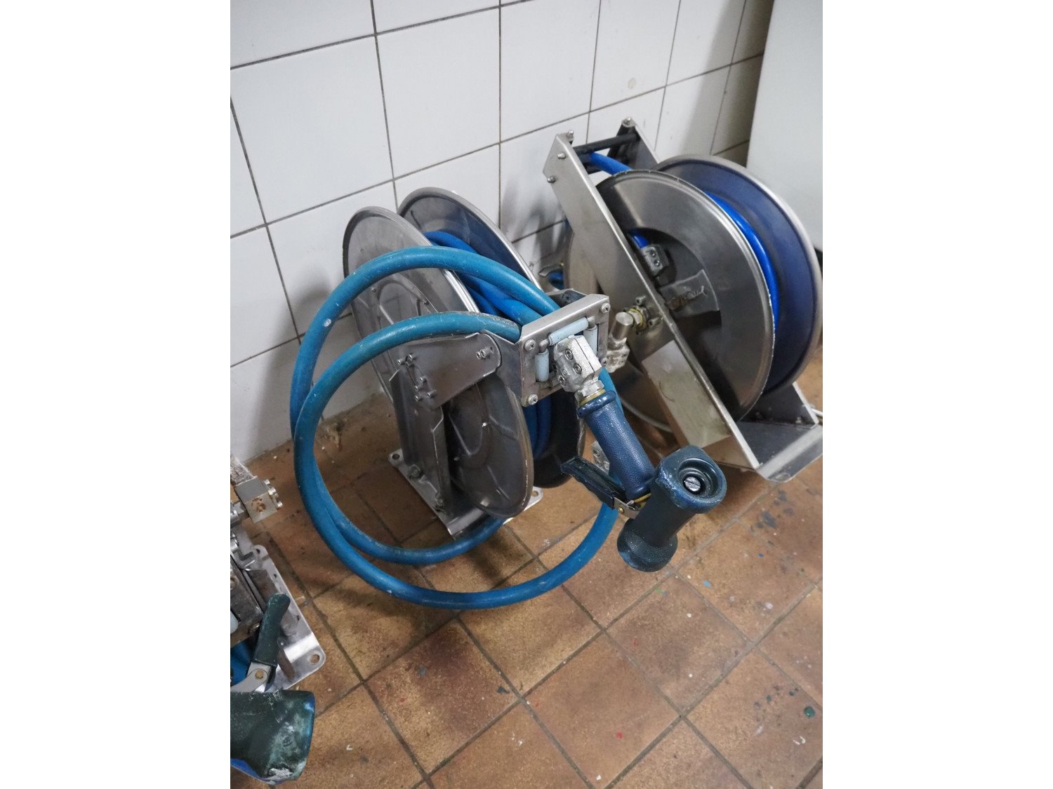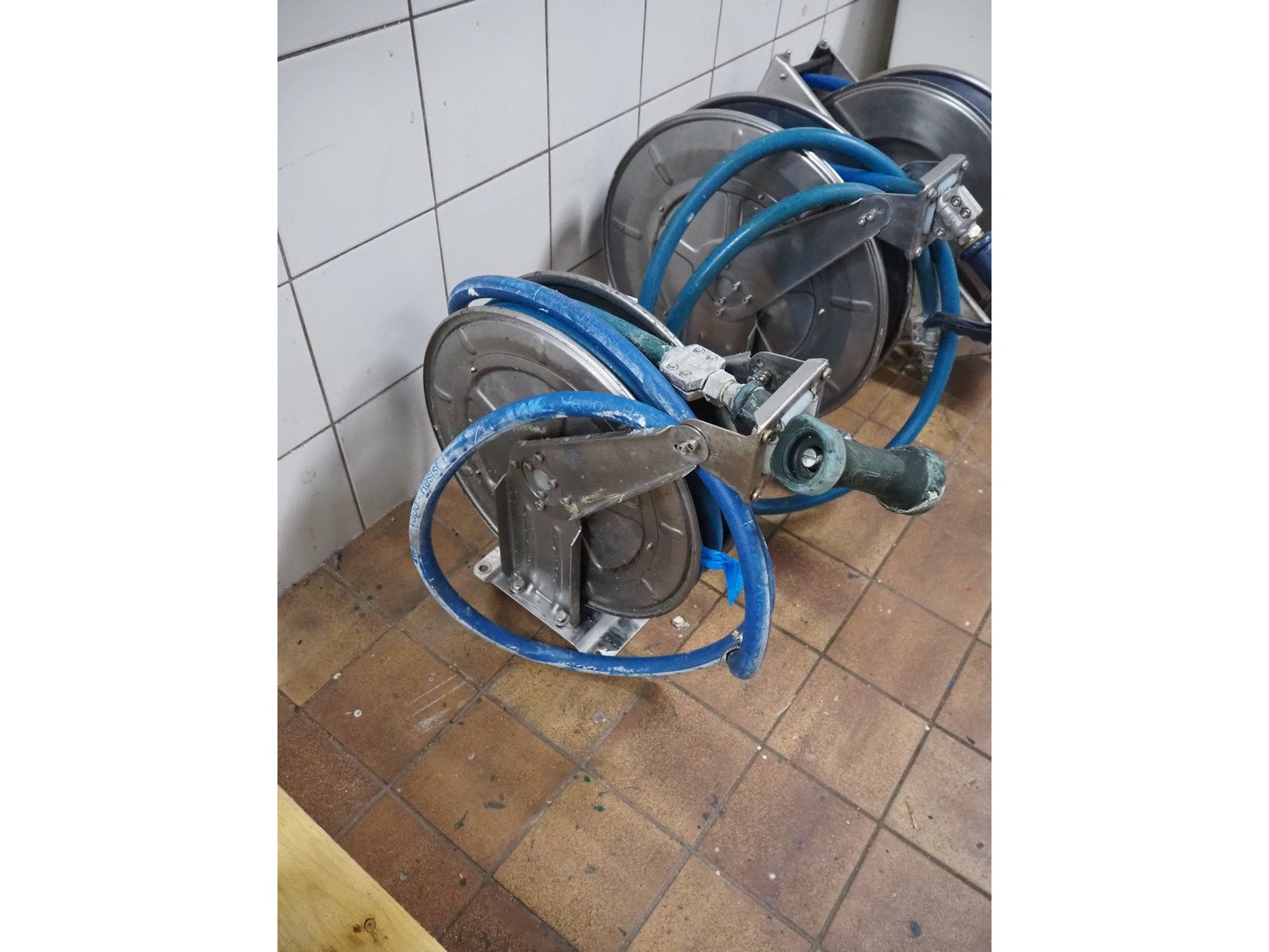 2 Rapid Maschinenabrik GmbH s/s hose reels with hose and pistol, dimensions: (2x) 500 mm x 150 mm x 500 mm and (1x) NN s/s hose reel with hose and pistol, dimensions: 500 mm x 150 mm x 500 mm.
