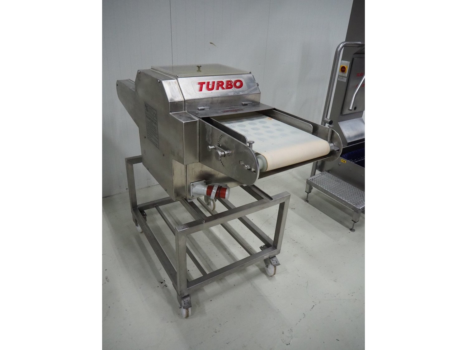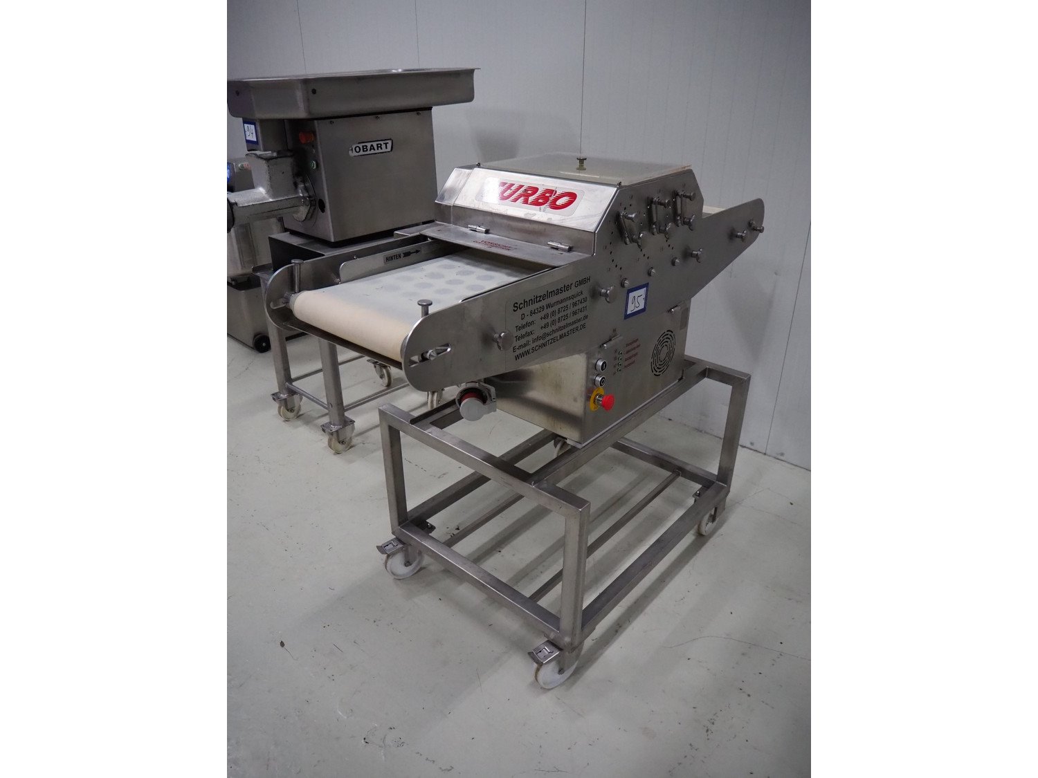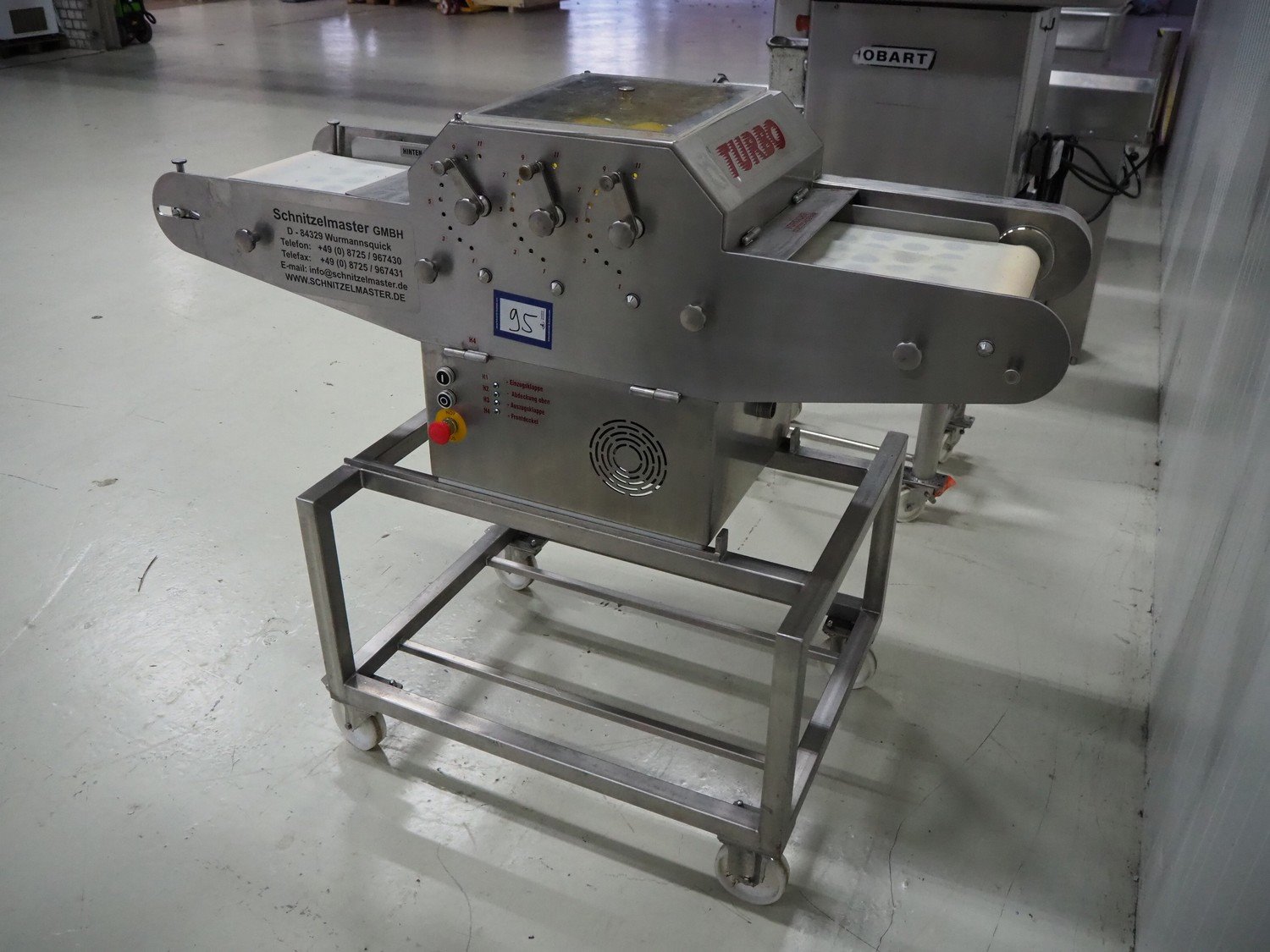 Schnitzel Master GmbH mobile meat tenderizer/flattener, type: TURBO, serial number: SMTurbo 0001213001, 400 V, 50 Hz, 16 A, belt width: 320 mm, clearance: 335 mm x 50 mm, total dimensions: 700 mm x 1500 mm x 1230 mm.
