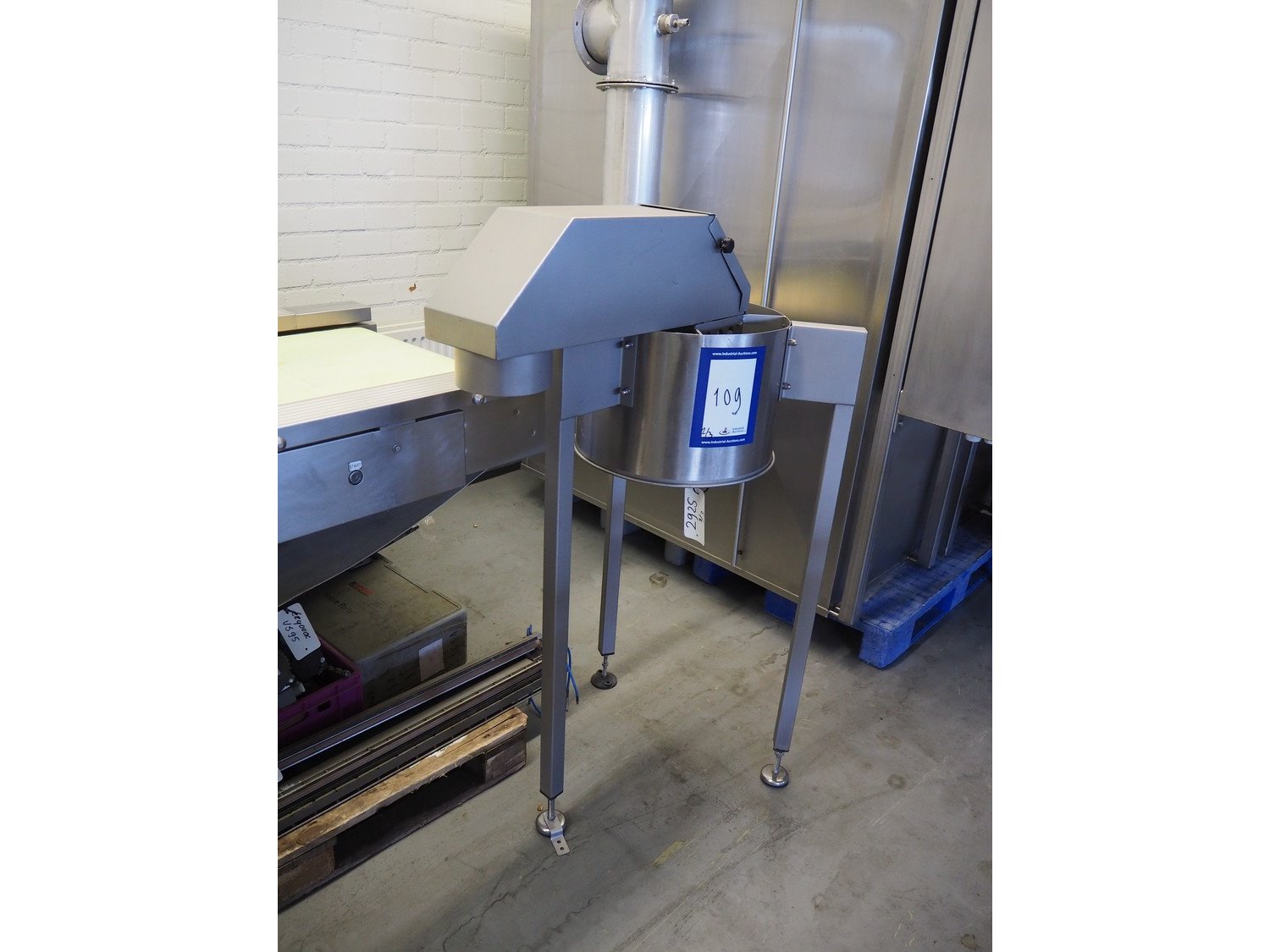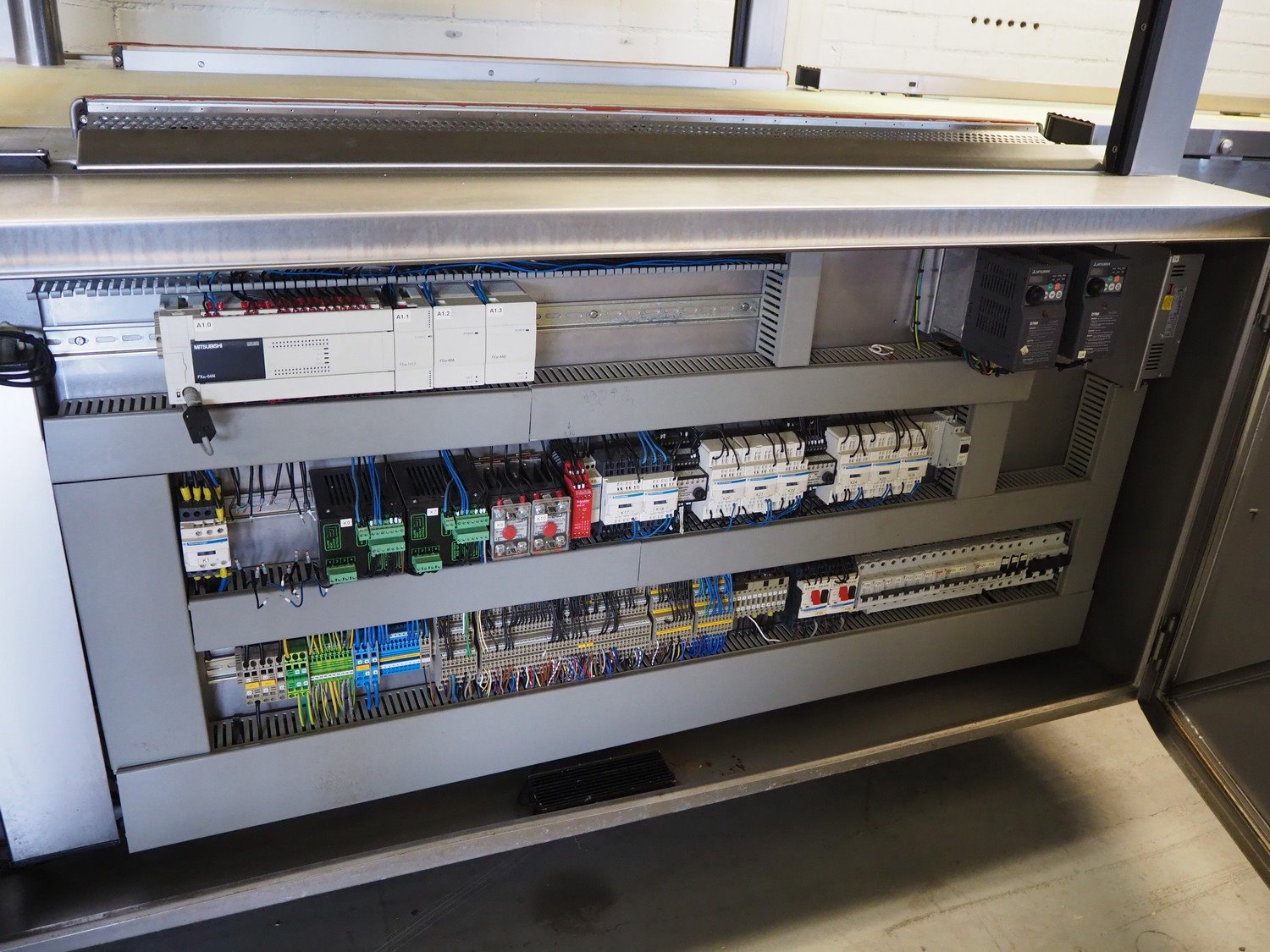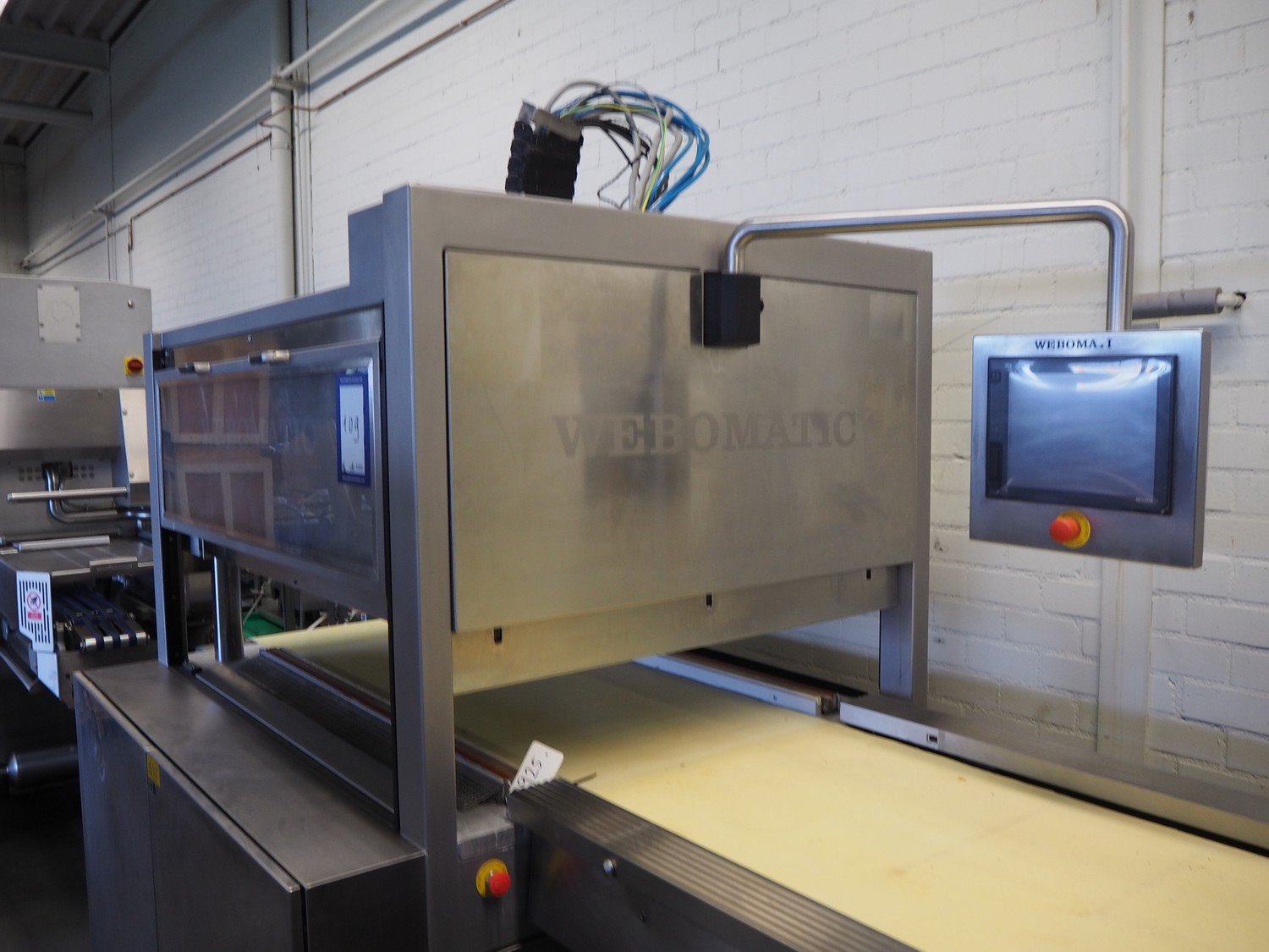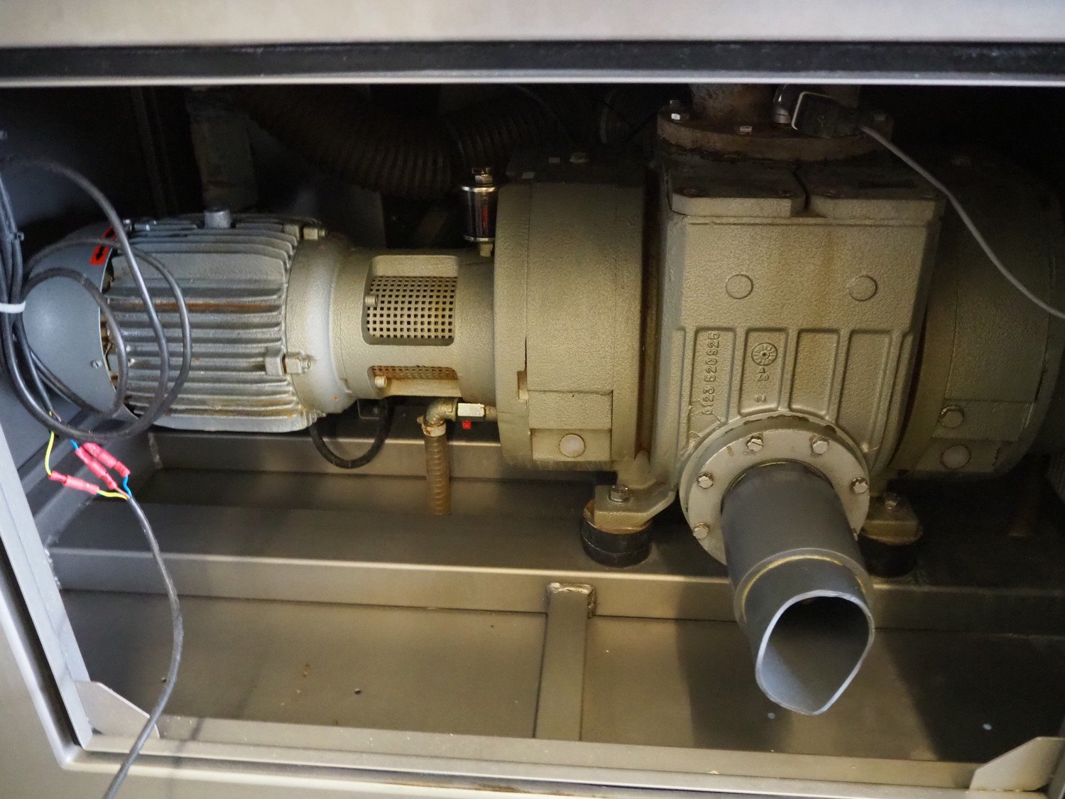 Webomatic belt vacuum machine, type: WBM 1350, serial number: 6012RF149, 400 V, 3 Ph, 50 Hz, 4 kW, weight: 2200 kg, pressure: 6 bar, capacity: 3 cycles/min, plastic belt, belt width: 800 mm, built-in Busch roots pump, type: Panda WV1500B roots, total dimensions: 3750 mm x 1500 mm x 2200 mm. Including trim removal unit, dimensions: 830 mm x 650 mm x 1380 mm.