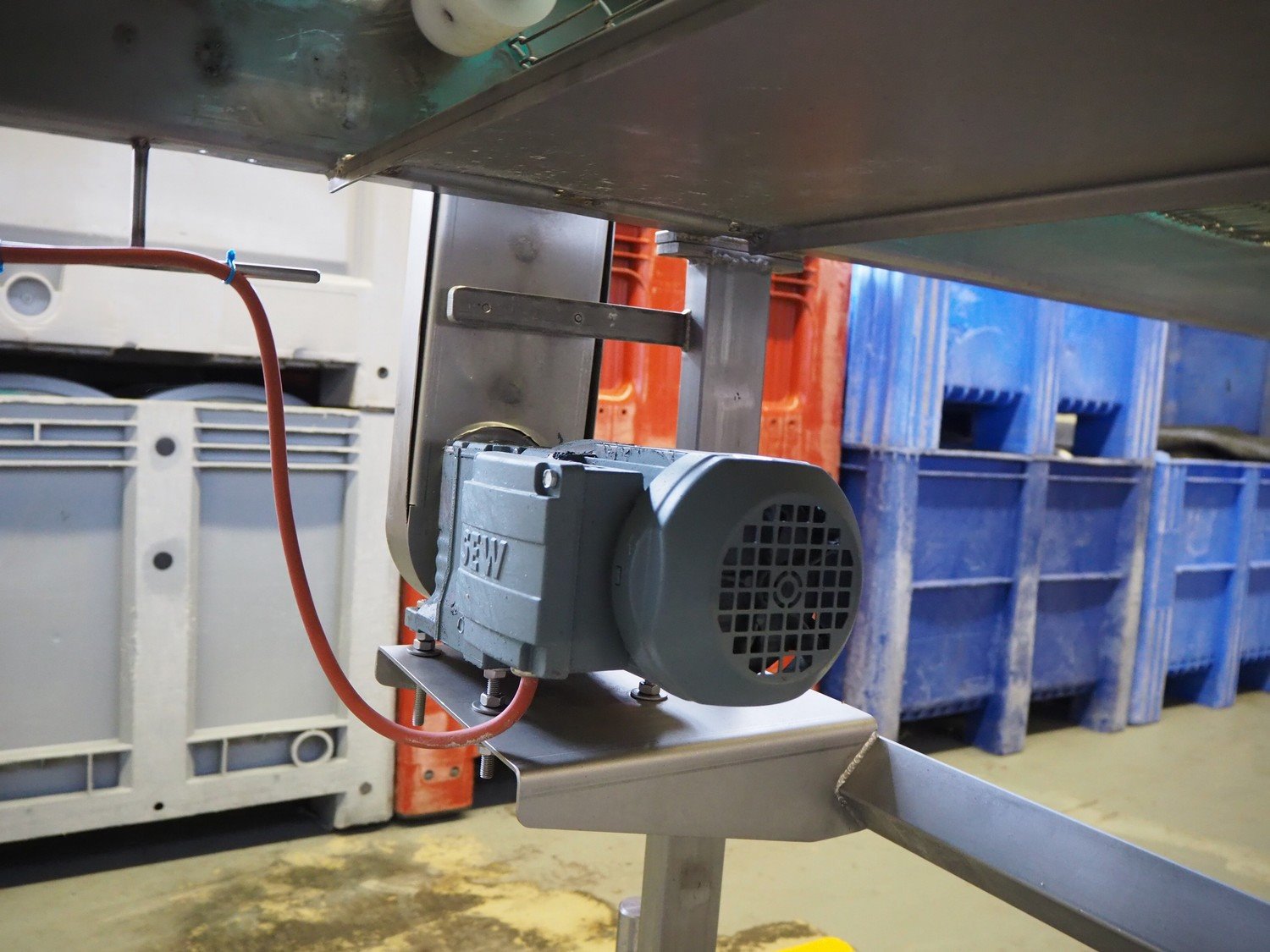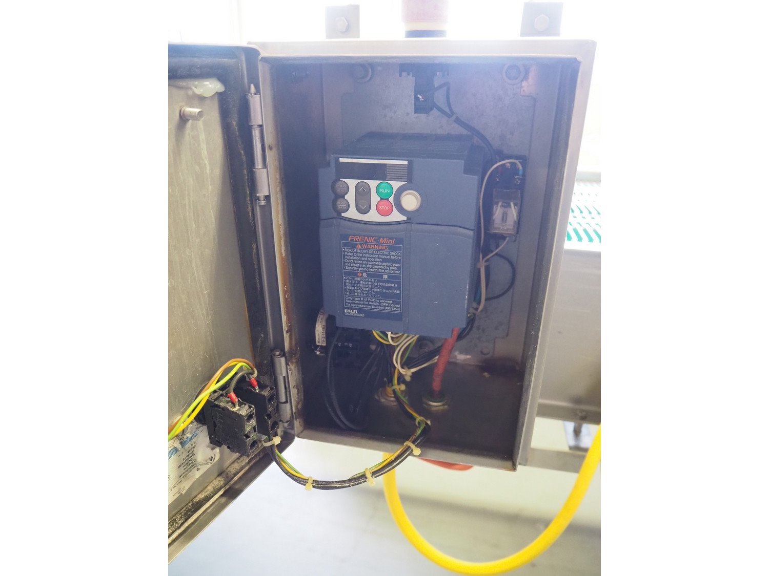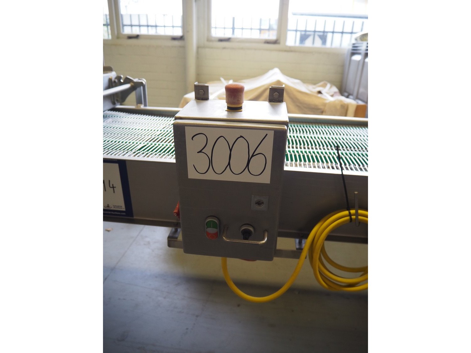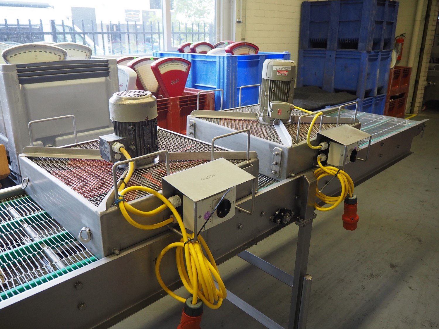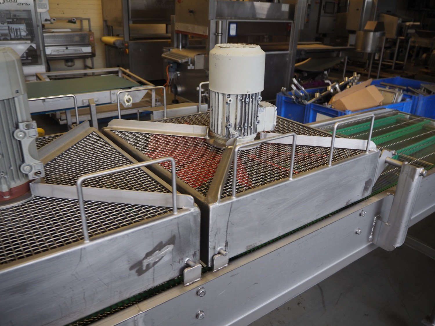 Budé cooling conveyor with 4 ventilators, type: 6000/600, serial number: E044183-1, 3 x 400 V, 50 Hz, 3.25 kW, s/s mesh belt, belt width: 600 mm, belt length: 6100 mm, total dimensions: 6100 mm x 1000 mm x 1550 mm.