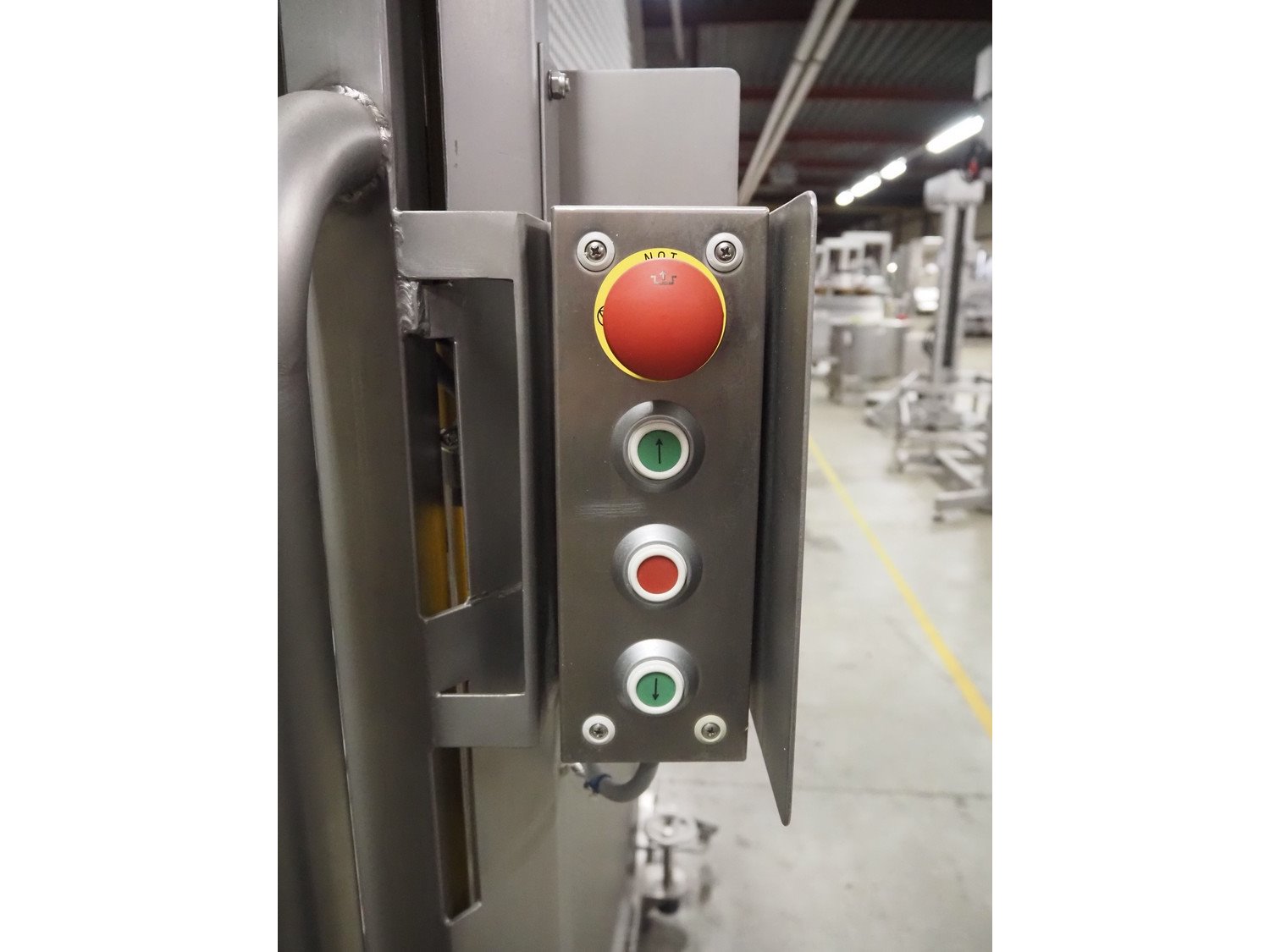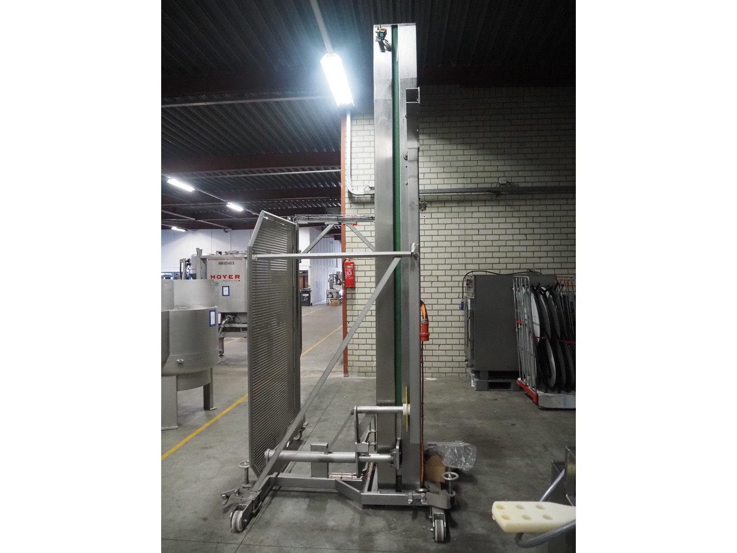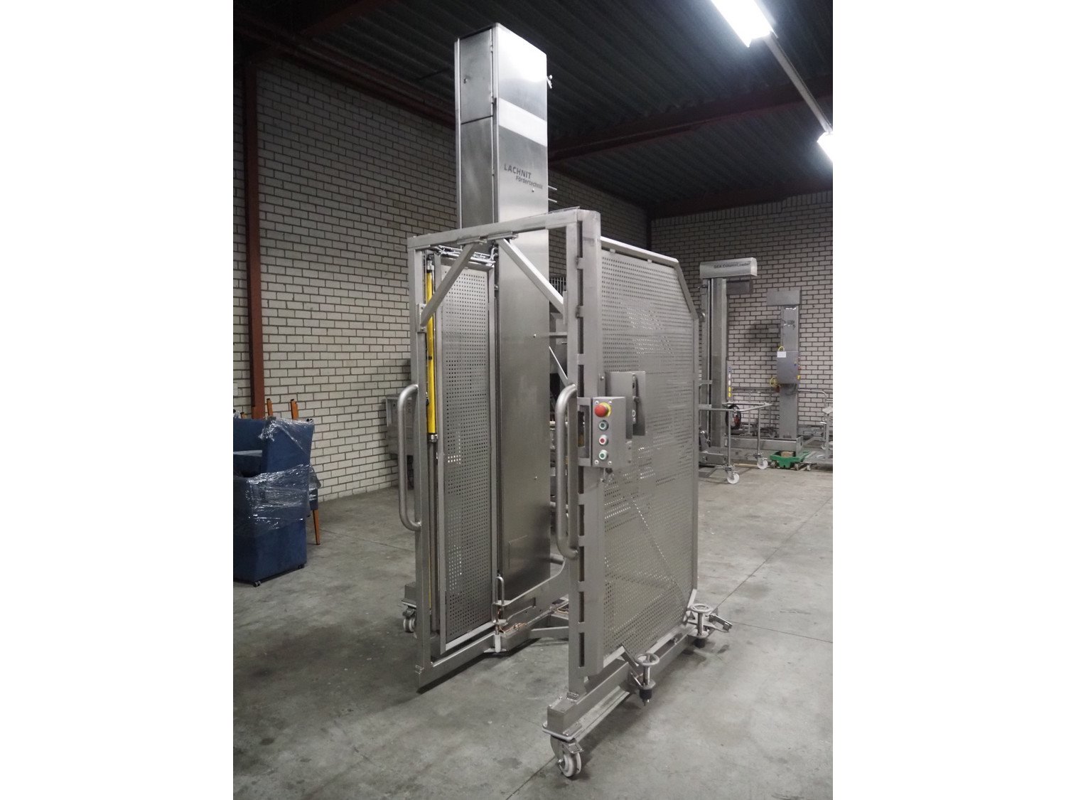 Lachnit Fördertechnik mobile lifter for 200 litres meat bins with safety cage, type: 300 S, serial number: 4066, year of construction: 2014, 400 V, 50 Hz, 3.75 A, 1.5 kW, lifting height: 2850 mm, maximum load capacity: 350 kg, weight: 500 kg, total dimensions: 1600 mm x 1850 mm x 3600 mm.