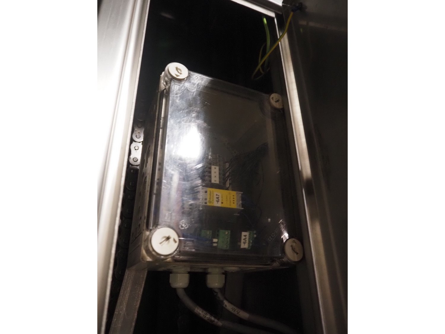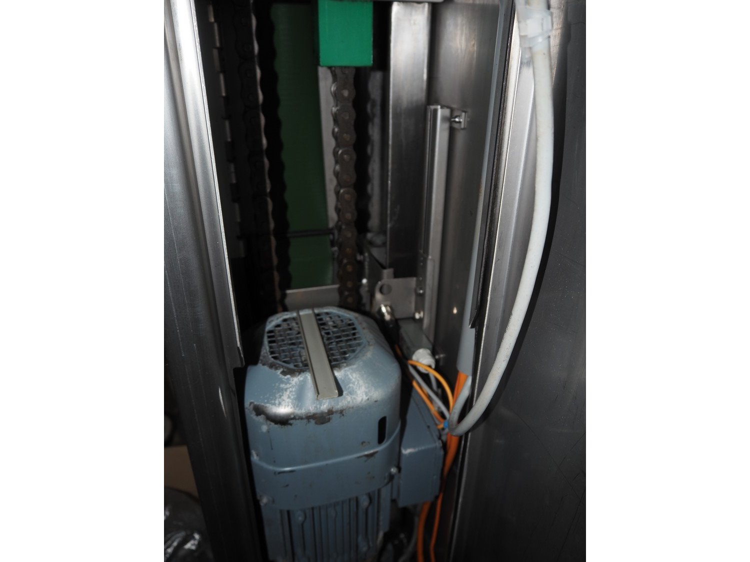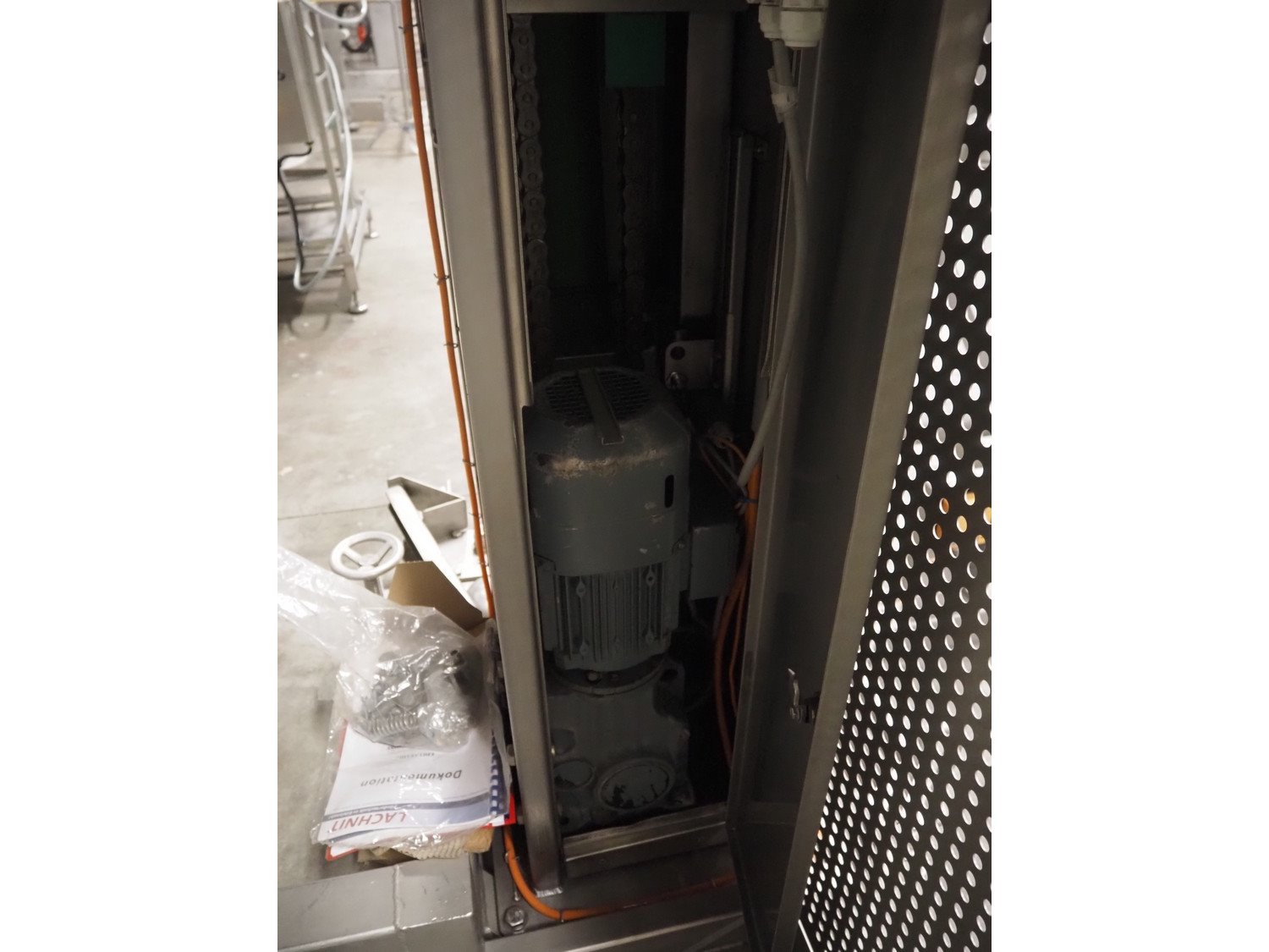 Lachnit Fördertechnik mobile lifter for 200 litres meat bins with safety cage, type: 300 S, serial number: 4066, year of construction: 2014, 400 V, 50 Hz, 3.75 A, 1.5 kW, lifting height: 2850 mm, maximum load capacity: 350 kg, weight: 500 kg, total dimensions: 1600 mm x 1850 mm x 3600 mm.