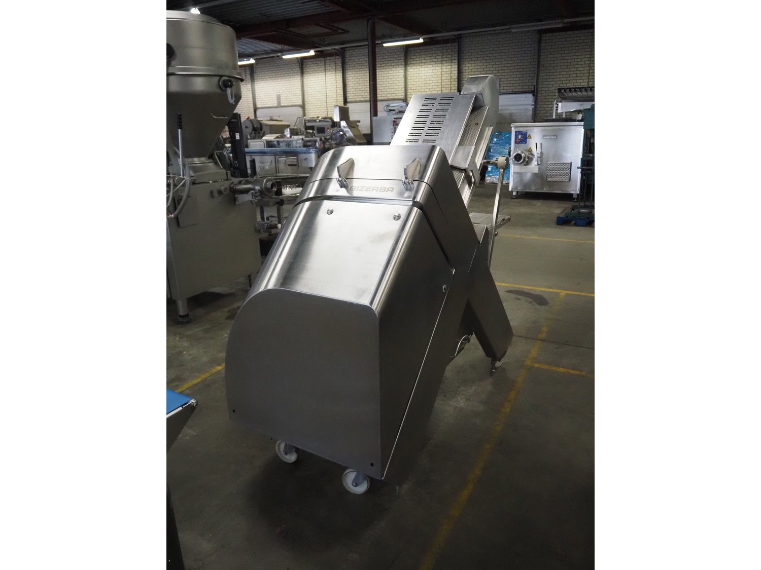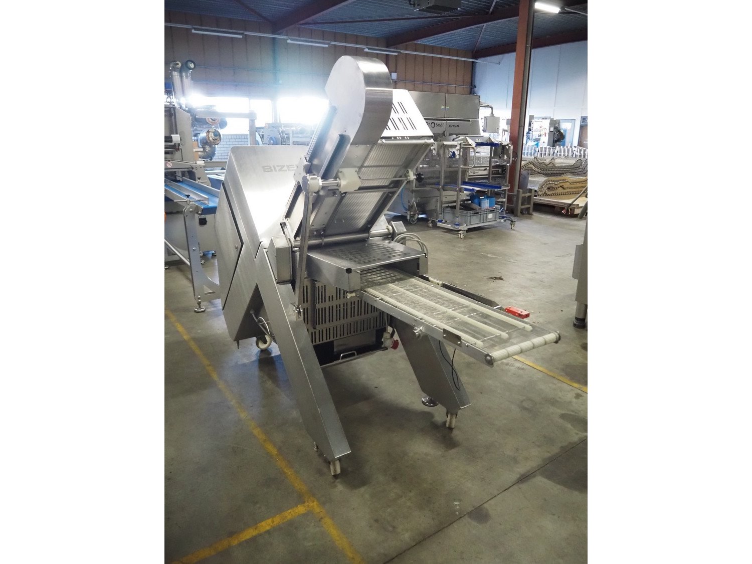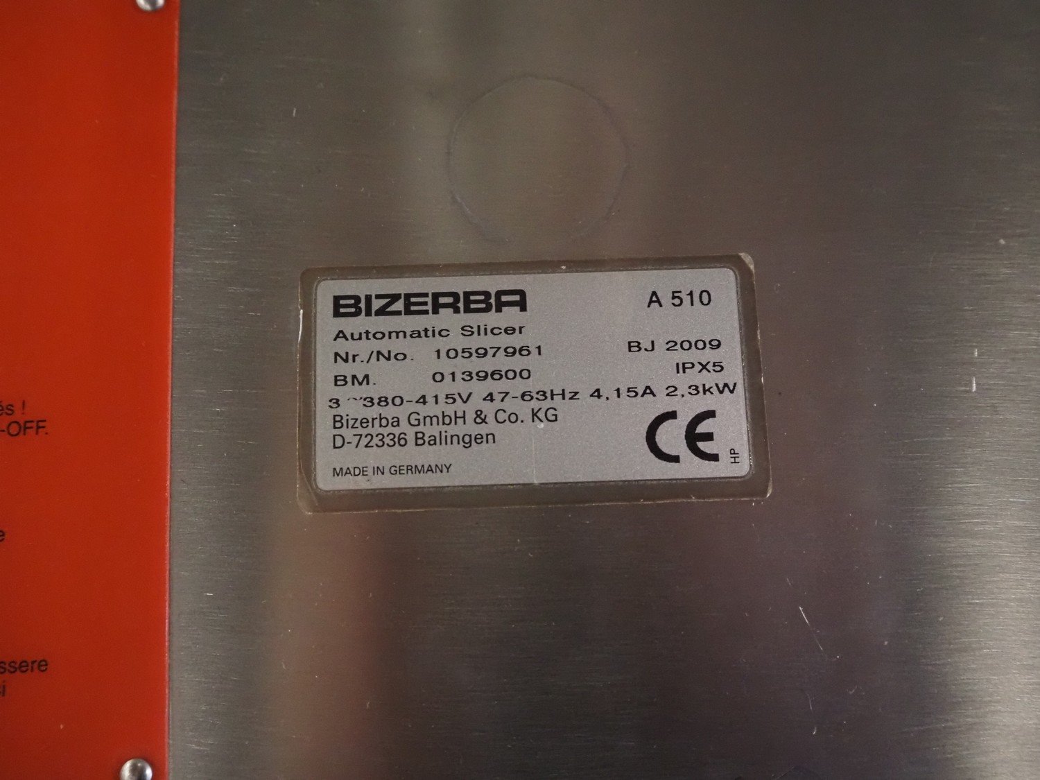 Bizerba GmbH & Co. KG mobile automatic slicer, model: A 510, number: 10597961, 380-415 V, 3 Ph, 47-53 Hz, 4.14 A, 2.3 kW, belt width: 300 mm, total dimensions: 2500 mm x 850 mm x 1820 mm.